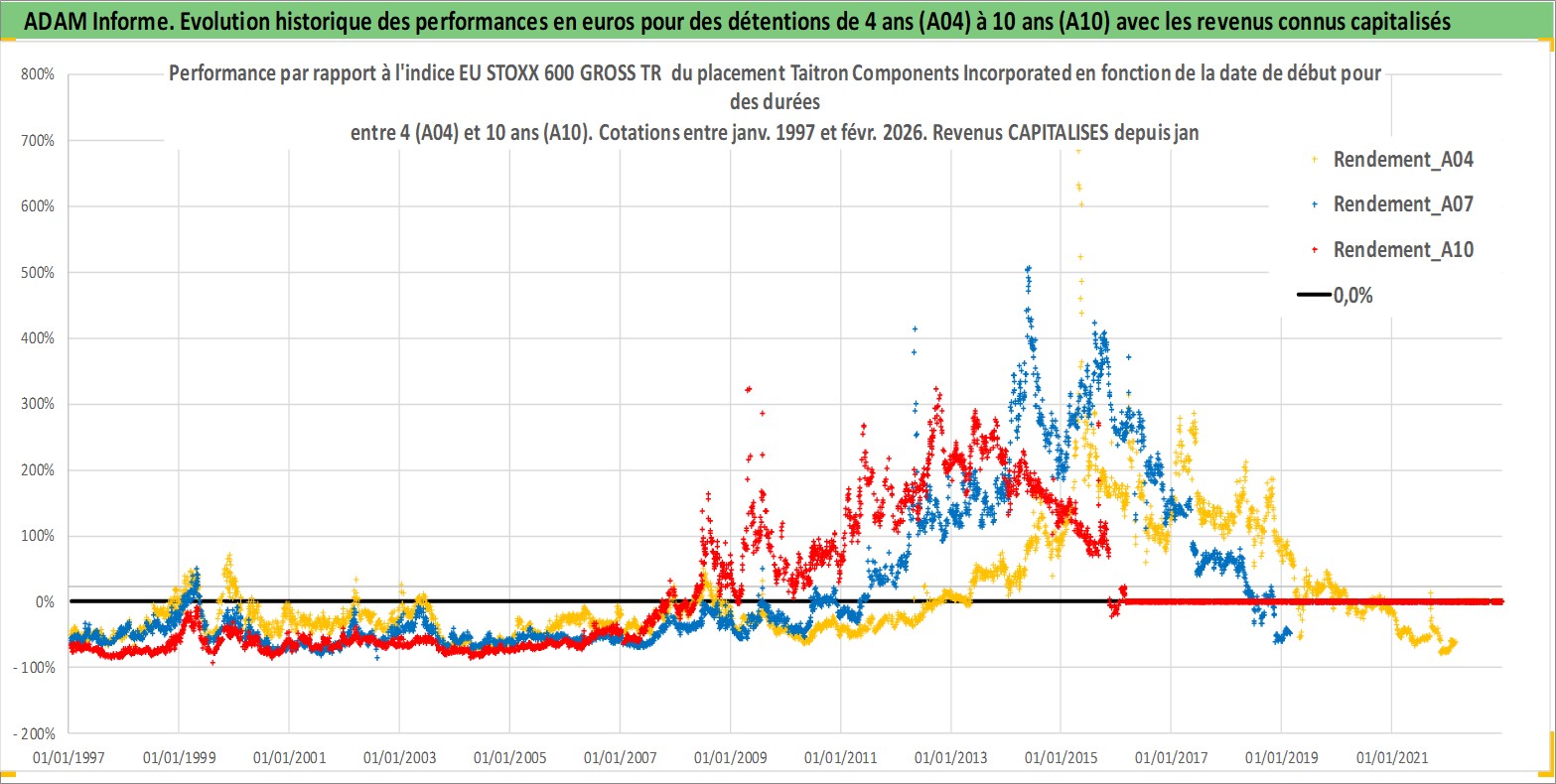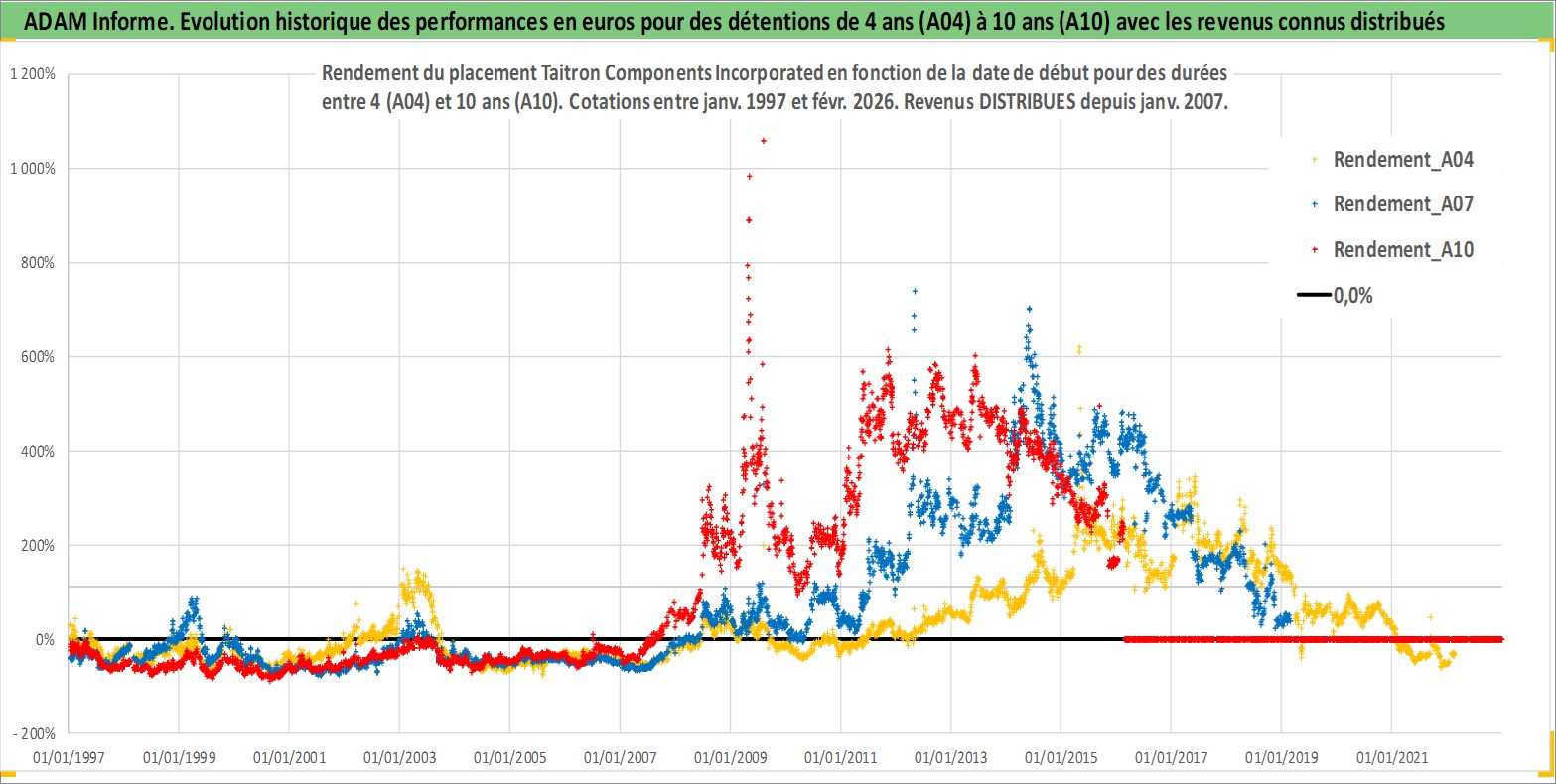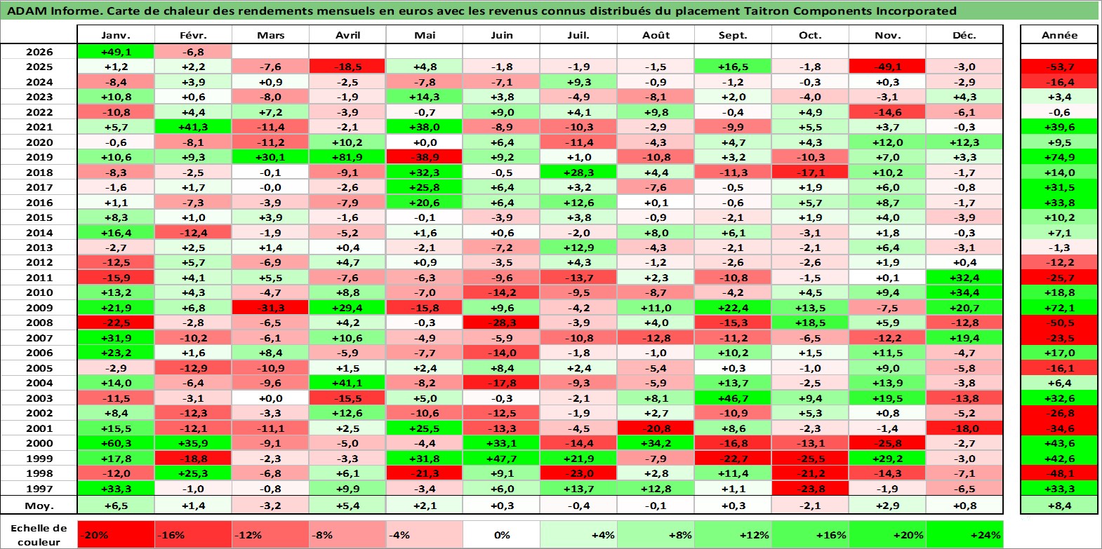 Site dédié aux investisseursPage dédiée sur site financeAnalyse des valorisations hebdomadaires de l'action Taitron Components Incorporated. Cet actif est cote en USD. Les valorisations sont en contrevaleur EURO et couvrent les semaines 1997W01 a 2026W09. Les revenus de cet actif financier sont pris en compte depuis la semaine 2007W03. La note ESG de cet actif n'est pas connue.