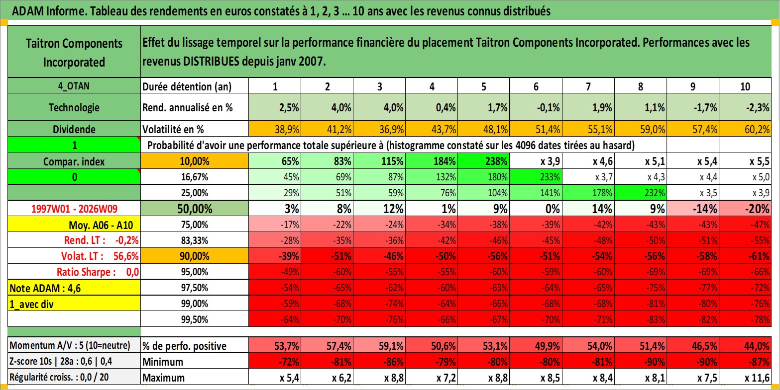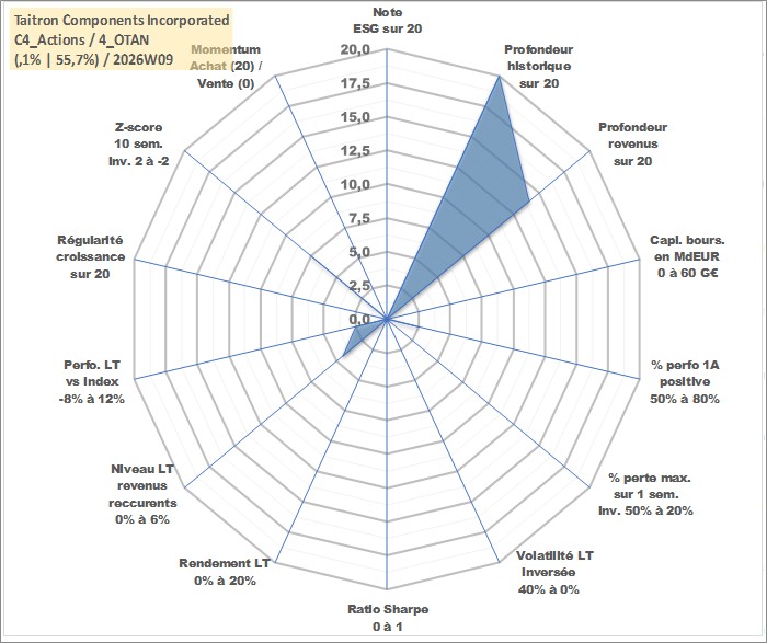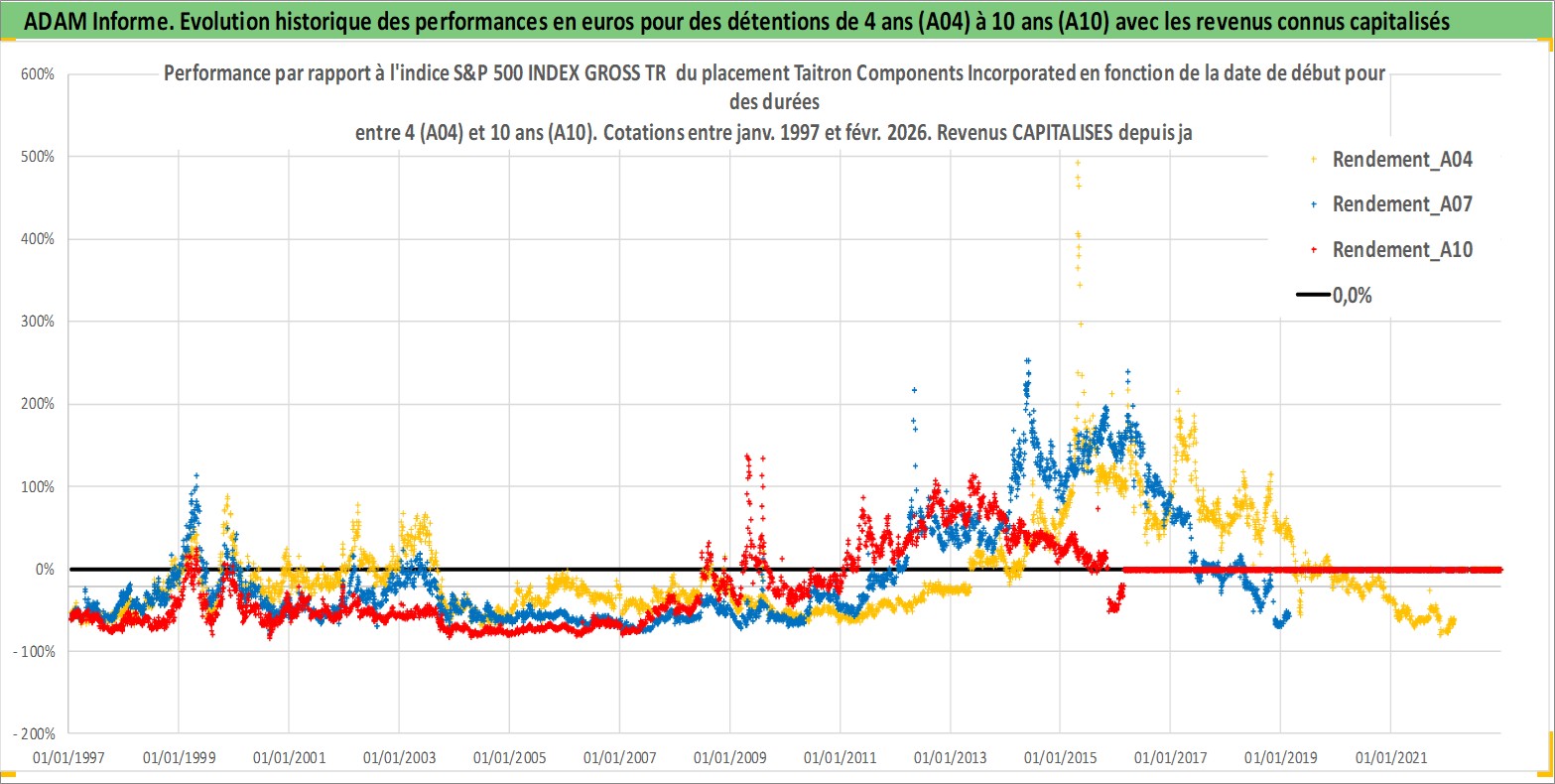 Site dédié aux investisseursPage dédiée sur site financeAnalyse des valorisations hebdomadaires de l'action Taitron Components Incorporated. Cet actif est cote en USD. Les valorisations sont en contrevaleur EURO et couvrent les semaines 1997W01 a 2026W09. Les revenus de cet actif financier sont pris en compte depuis la semaine 2007W03. La note ESG de cet actif n'est pas connue.