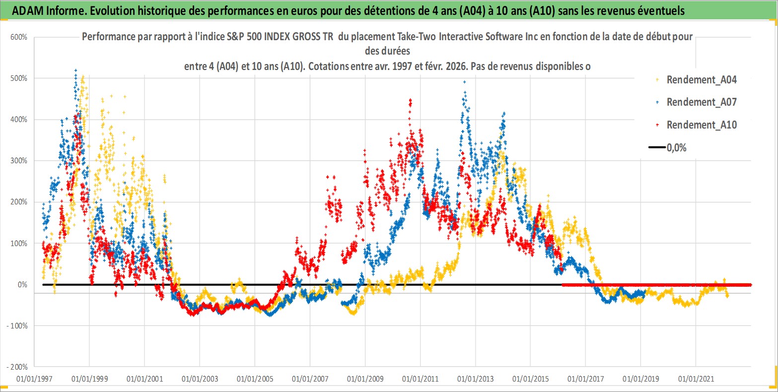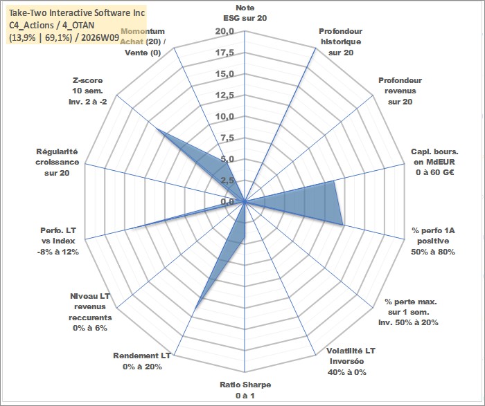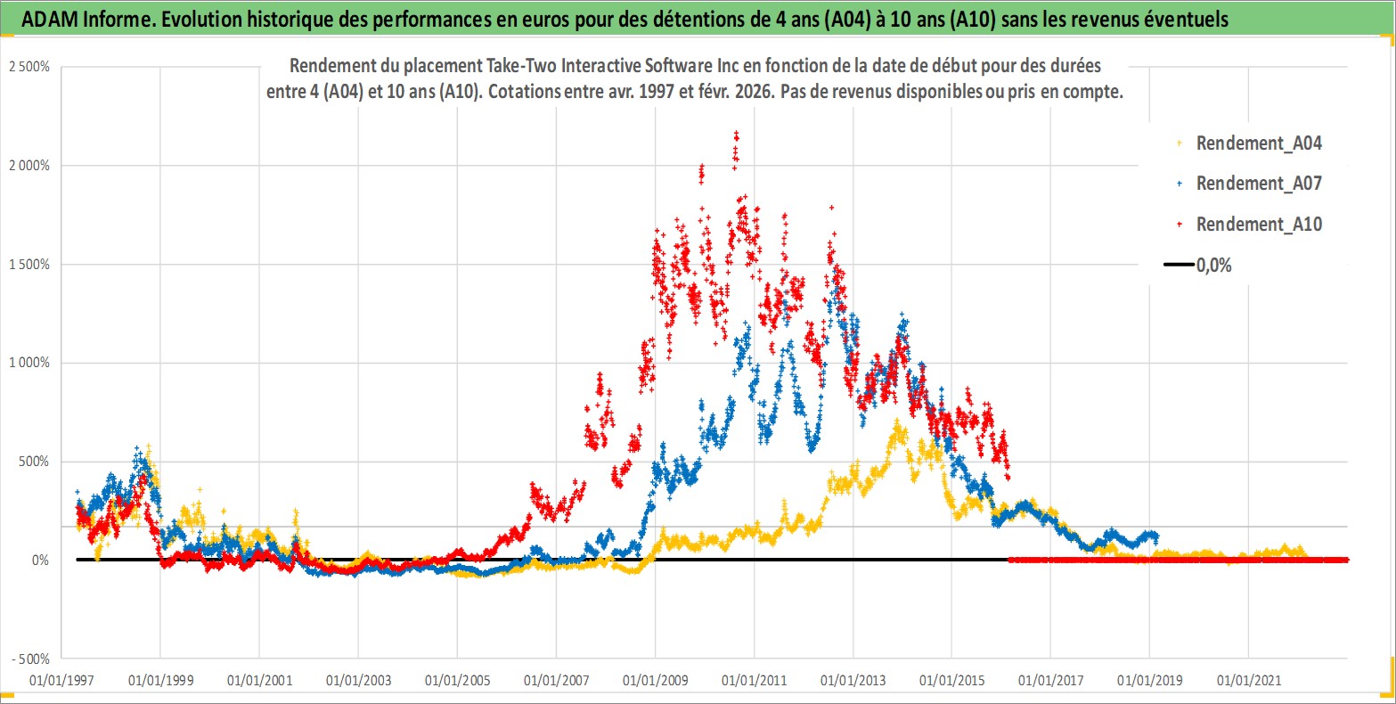 Site dédié aux investisseursPage dédiée sur site financeAnalyse des valorisations hebdomadaires de l'action Take-Two Interactive Software Inc. Cet actif est cote en USD. Les valorisations sont en contrevaleur EURO et couvrent les semaines 1997W16 a 2026W09. Les revenus de cet actif financier ne sont pas connus car non existants ou non disponibles sur le site Yahoo Finance. La note ESG de cet actif n'est pas connue.