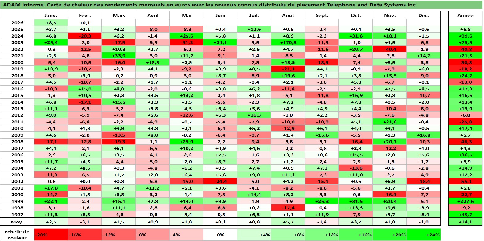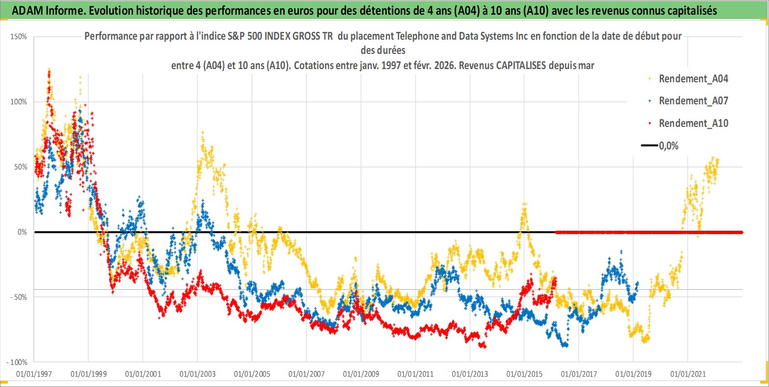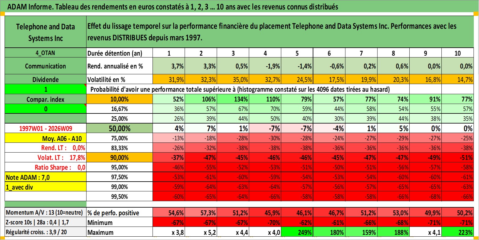 Site dédié aux investisseursPage dédiée sur site financeAnalyse des valorisations hebdomadaires de l'action Telephone and Data Systems Inc. Cet actif est cote en USD. Les valorisations sont en contrevaleur EURO et couvrent les semaines 1997W01 a 2026W09. Les revenus de cet actif financier sont pris en compte depuis la semaine 1997W11. La note ESG de cet actif n'est pas connue.