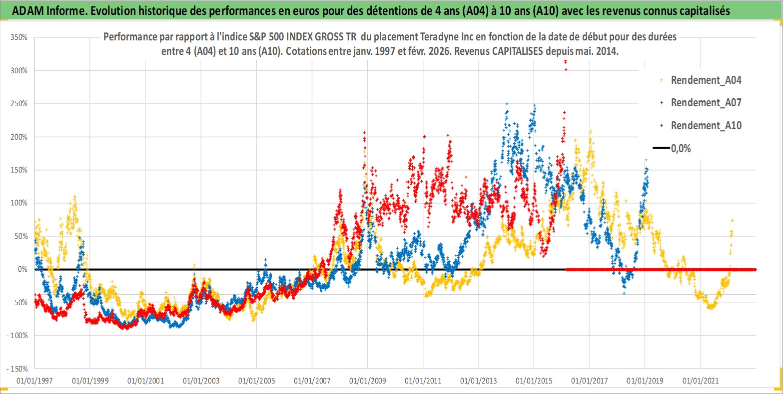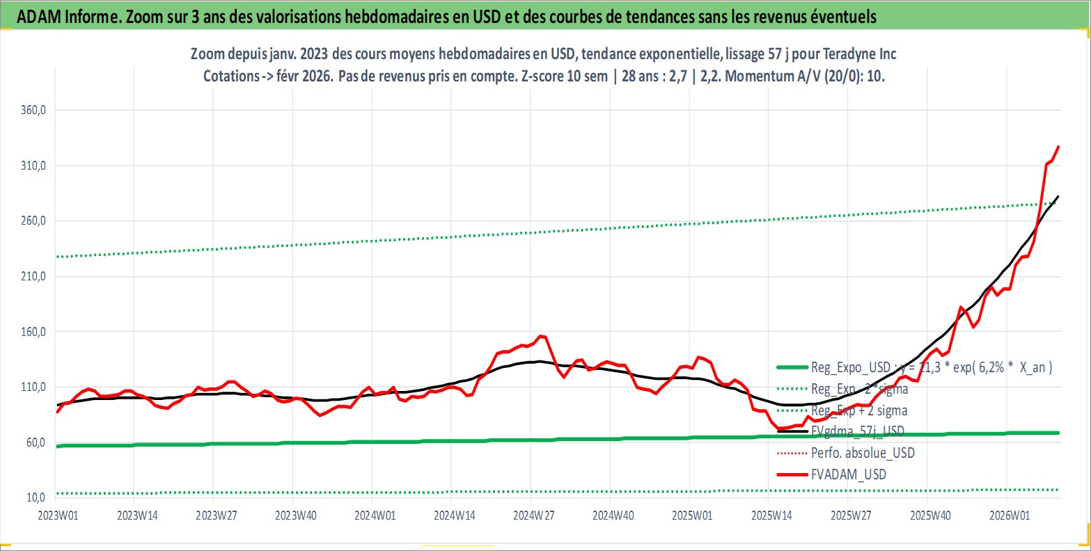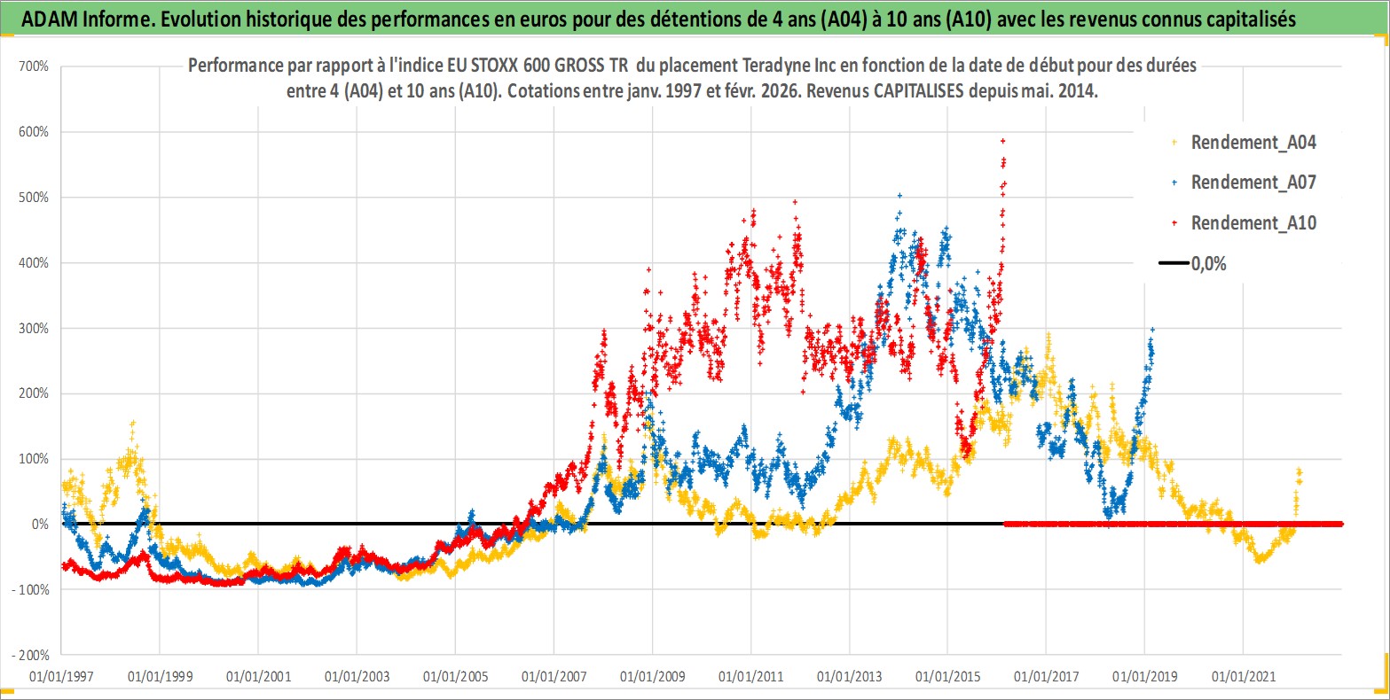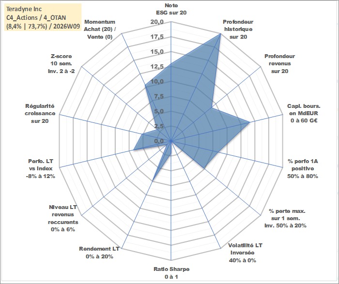 Site dédié aux investisseursPage dédiée sur site financeAnalyse des valorisations hebdomadaires de l'action Teradyne Inc. Cet actif est cote en USD. Les valorisations sont en contrevaleur EURO et couvrent les semaines 1997W01 a 2026W09. Les revenus de cet actif financier sont pris en compte depuis la semaine 2014W19. La note globale ESG de cet actif est estimee a 13.0 (apres rebasage entre 0 et 20).