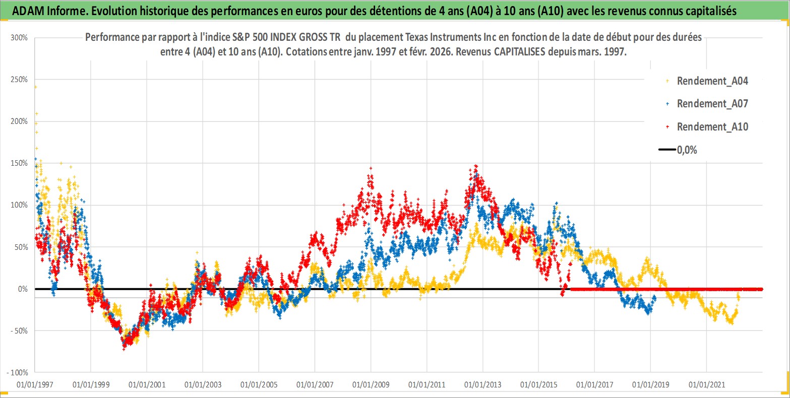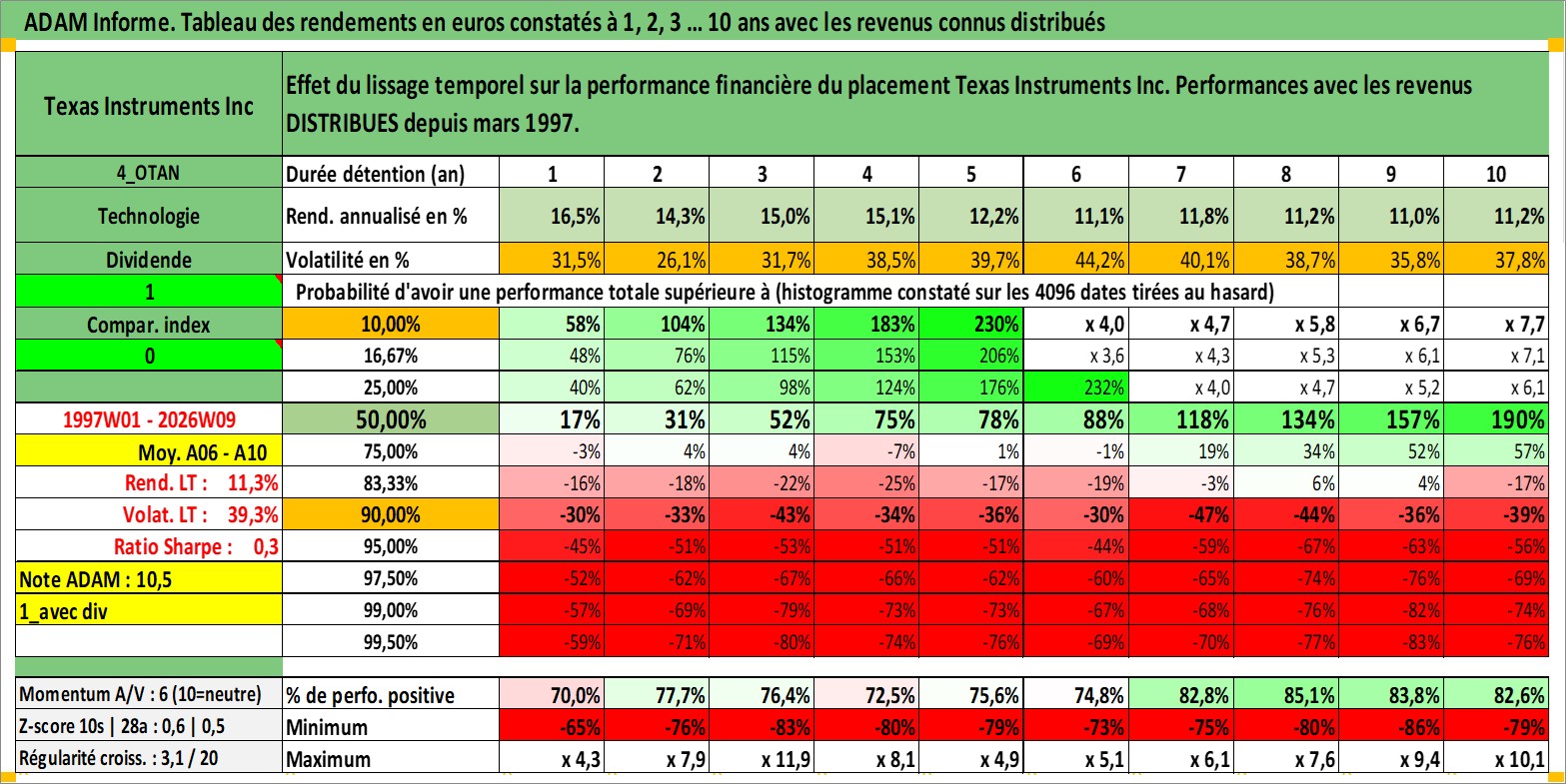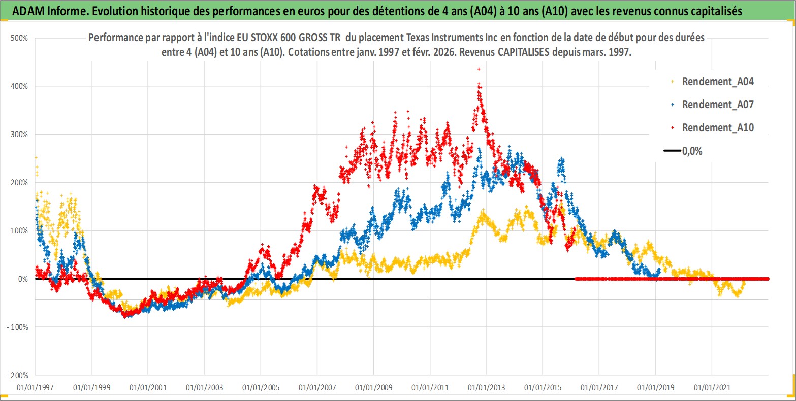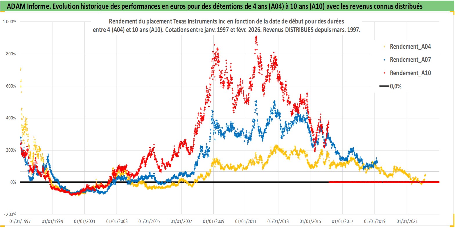 Site dédié aux investisseursPage dédiée sur site financeAnalyse des valorisations hebdomadaires de l'action Texas Instruments Inc. Cet actif est cote en USD. Les valorisations sont en contrevaleur EURO et couvrent les semaines 1997W01 a 2026W09. Les revenus de cet actif financier sont pris en compte depuis la semaine 1997W13. La note globale ESG de cet actif est estimee a 10.0 (apres rebasage entre 0 et 20).
