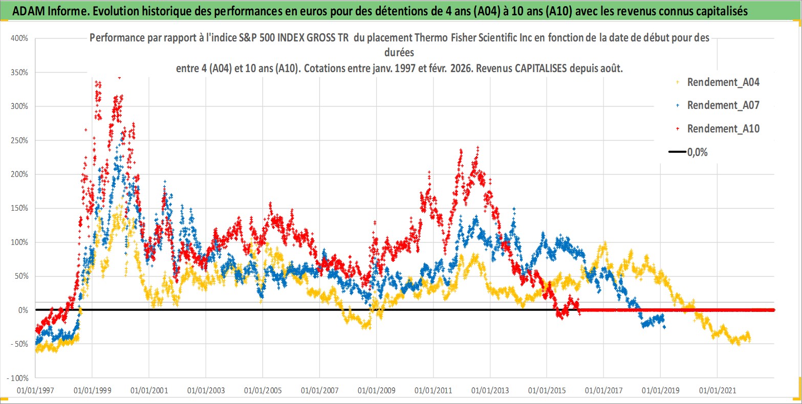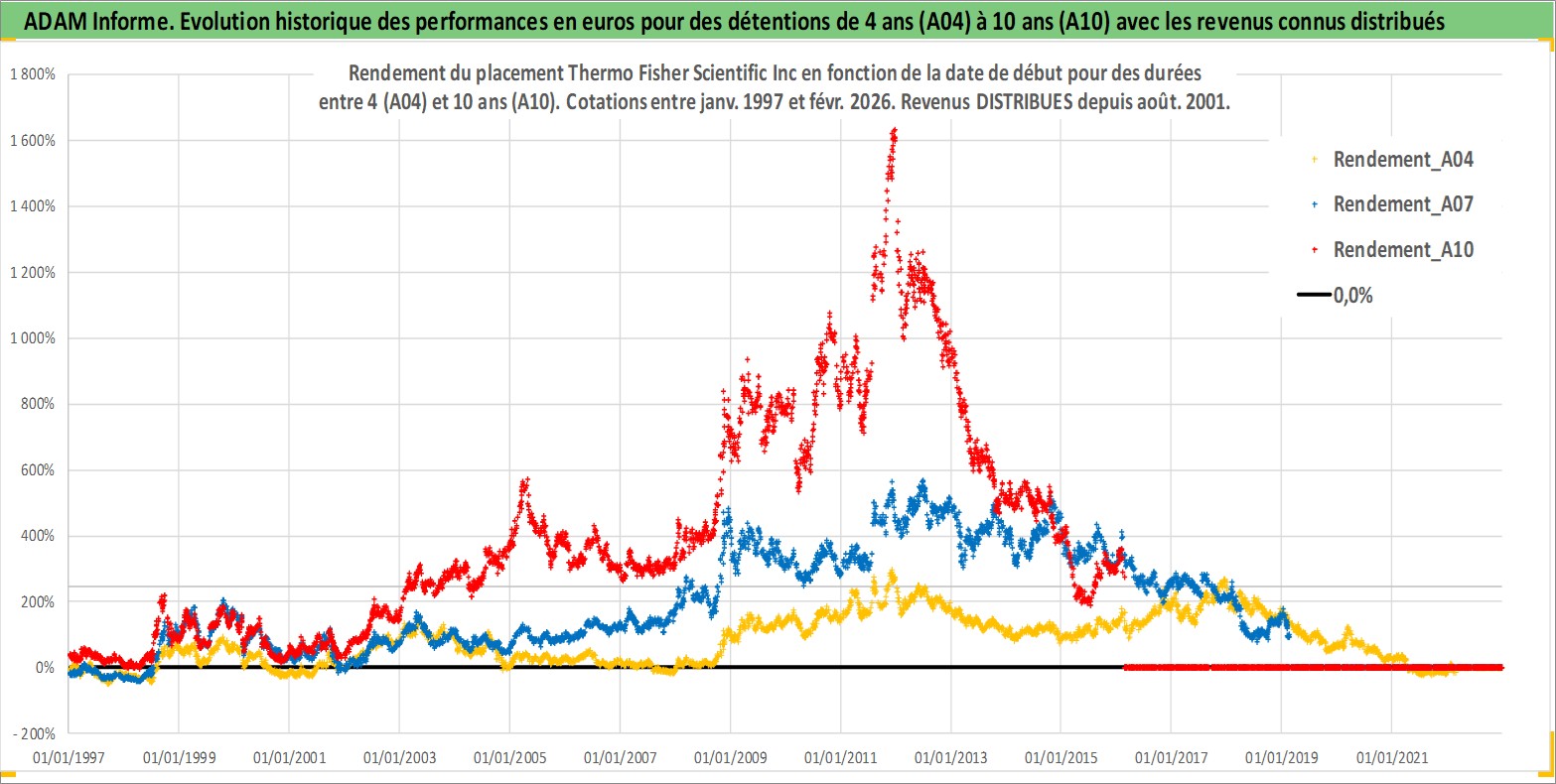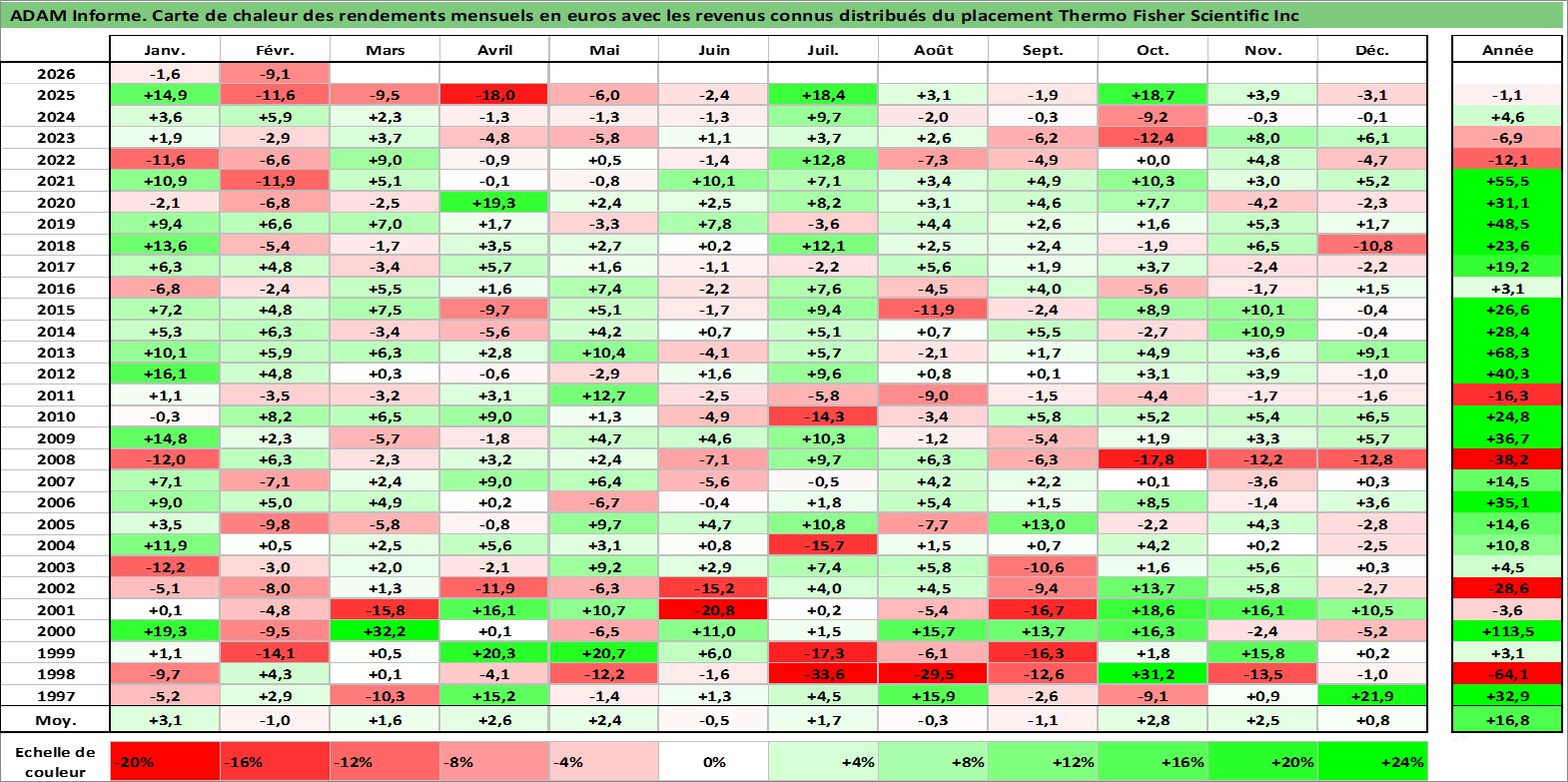 Site dédié aux investisseursPage dédiée sur site financeAnalyse des valorisations hebdomadaires de l'action Thermo Fisher Scientific Inc. Cet actif est cote en USD. Les valorisations sont en contrevaleur EURO et couvrent les semaines 1997W01 a 2026W09. Les revenus de cet actif financier sont pris en compte depuis la semaine 2001W32. La note globale ESG de cet actif est estimee a 14.0 (apres rebasage entre 0 et 20).