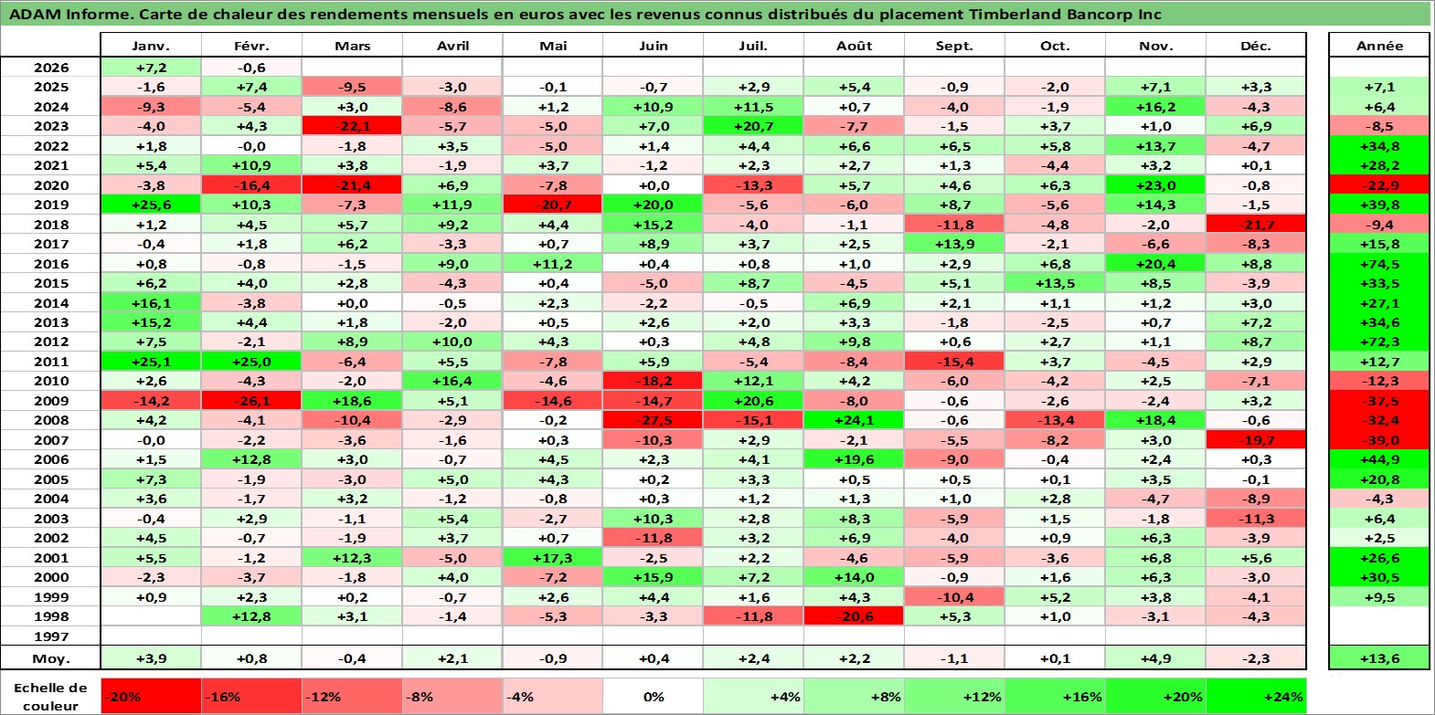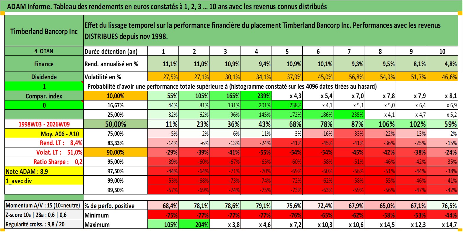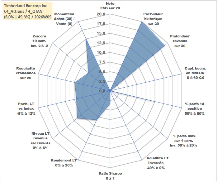 Site dédié aux investisseursPage dédiée sur site financeAnalyse des valorisations hebdomadaires de l'action Timberland Bancorp Inc. Cet actif est cote en USD. Les valorisations sont en contrevaleur EURO et couvrent les semaines 1998W03 a 2026W09. Les revenus de cet actif financier sont pris en compte depuis la semaine 1998W45. La note ESG de cet actif n'est pas connue.