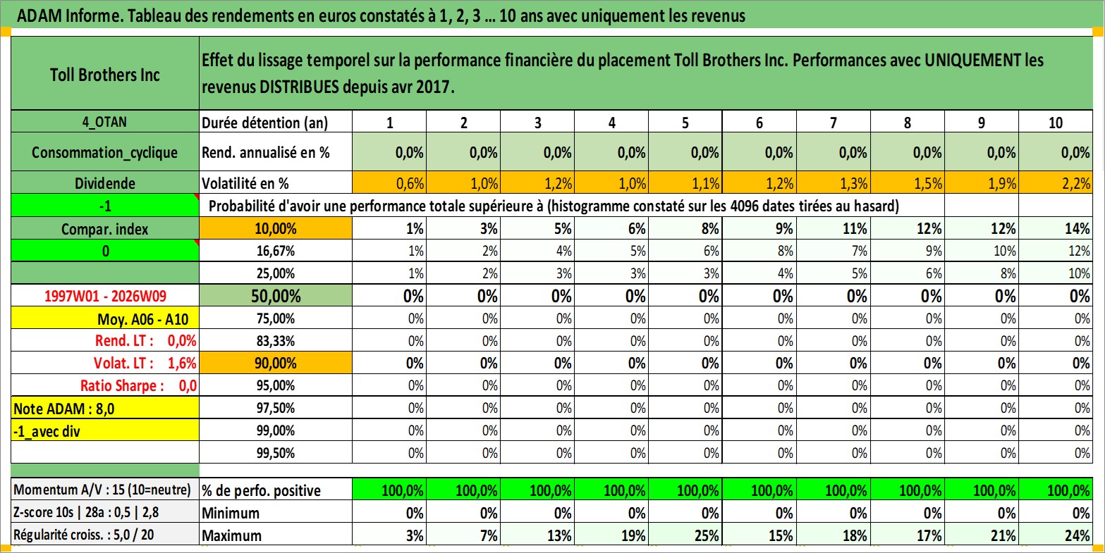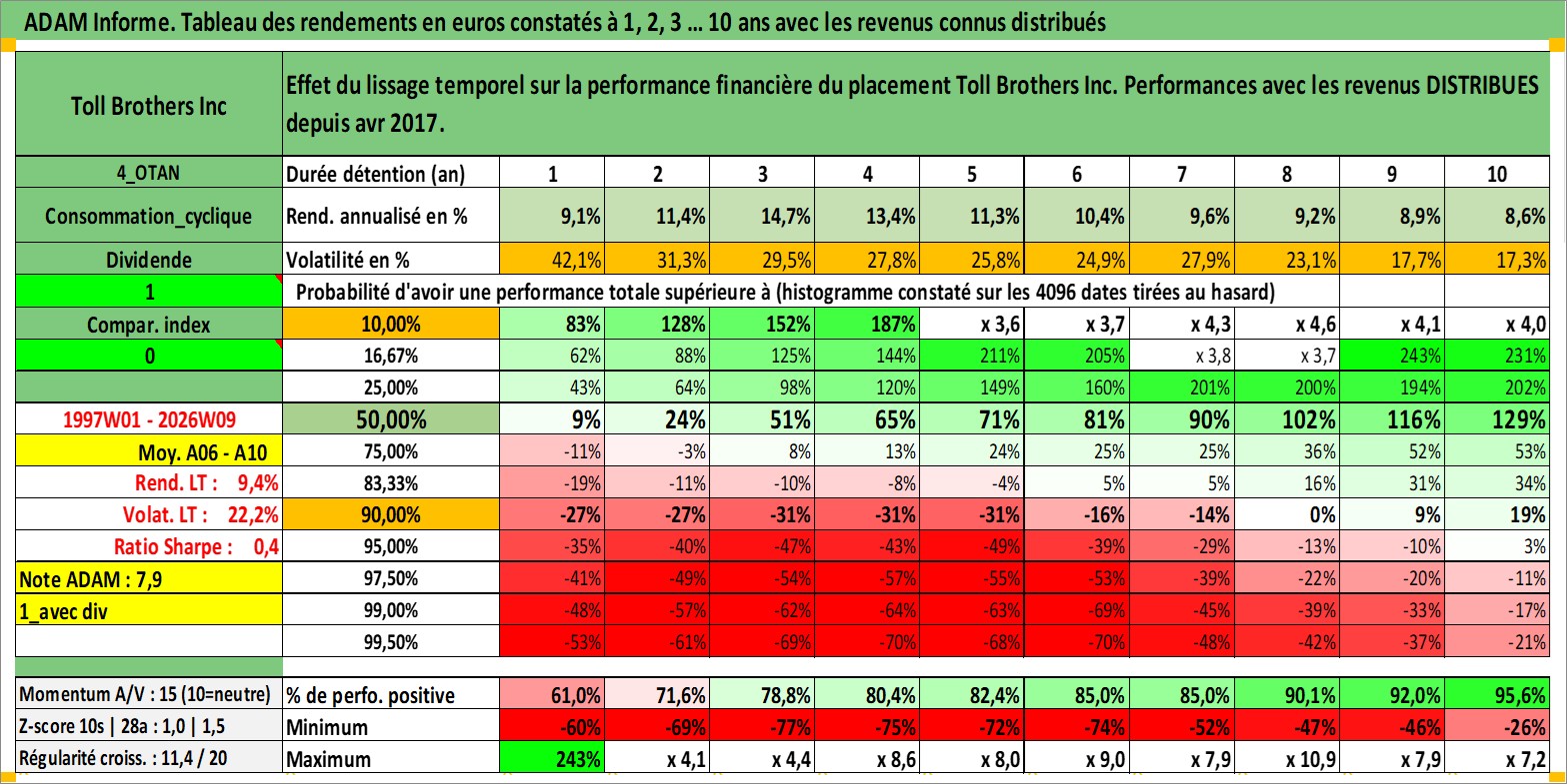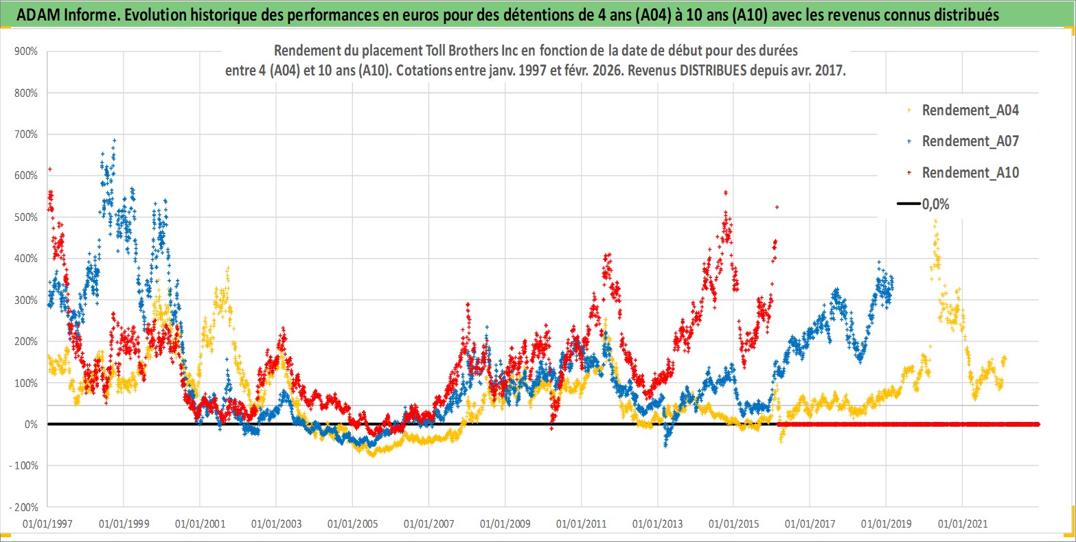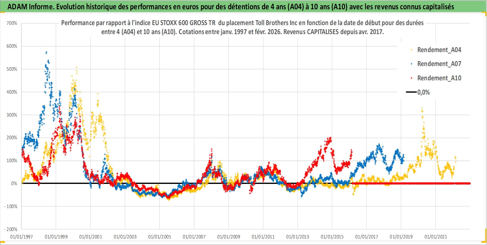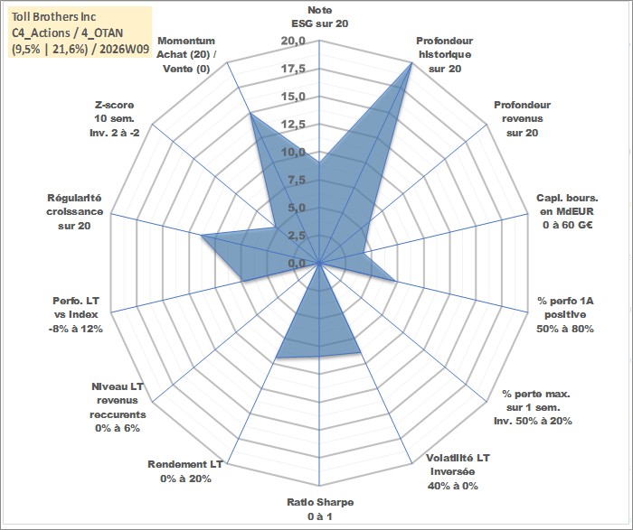 Site dédié aux investisseursPage dédiée sur site financeAnalyse des valorisations hebdomadaires de l'action Toll Brothers Inc. Cet actif est cote en USD. Les valorisations sont en contrevaleur EURO et couvrent les semaines 1997W01 a 2026W09. Les revenus de cet actif financier sont pris en compte depuis la semaine 2017W15. La note globale ESG de cet actif est estimee a 9.0 (apres rebasage entre 0 et 20).