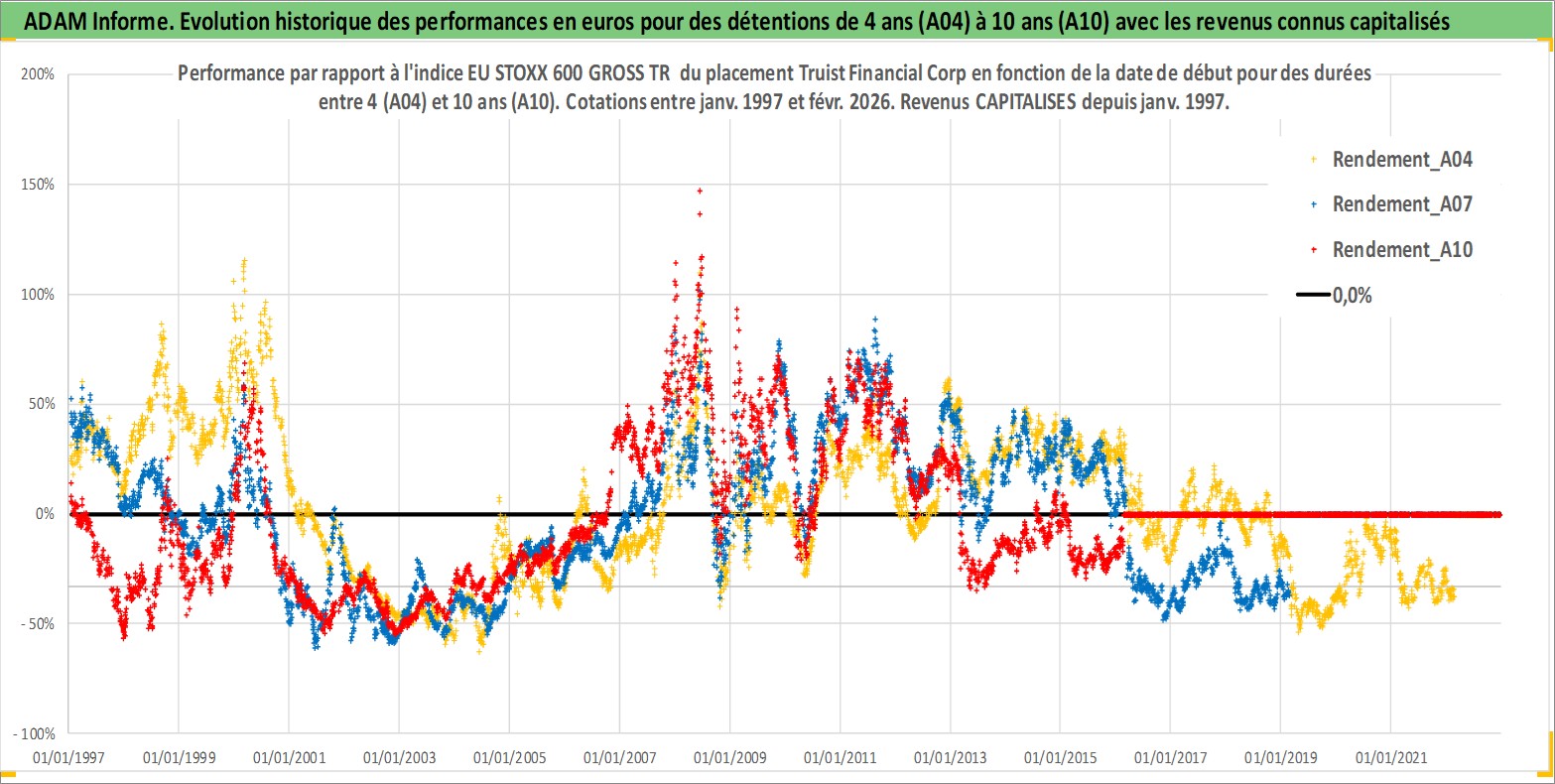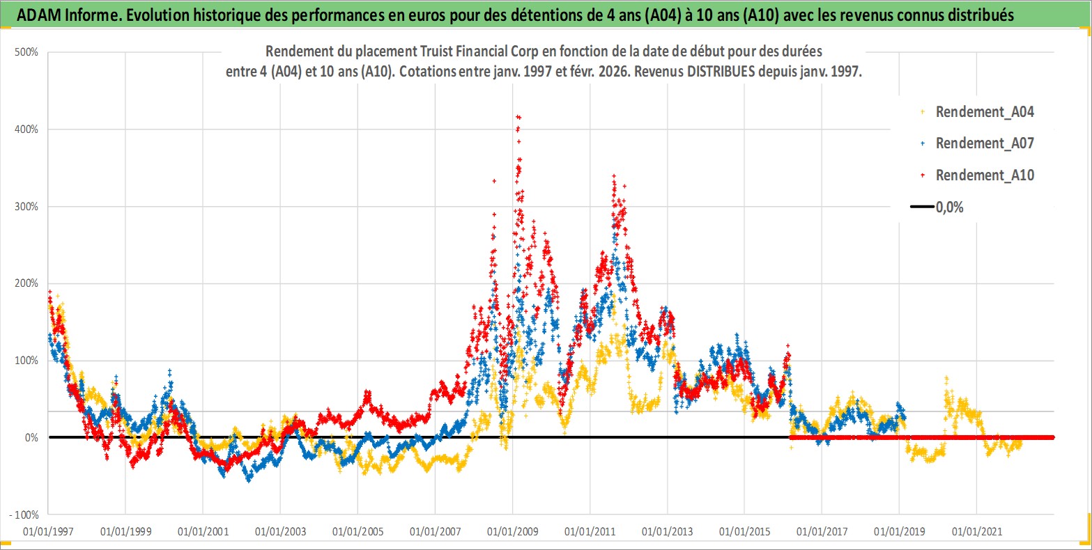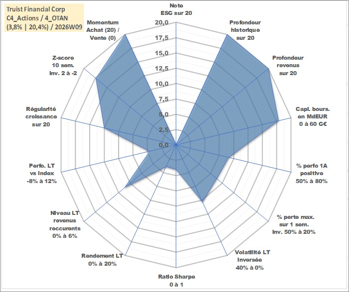 Site dédié aux investisseursPage dédiée sur site financeAnalyse des valorisations hebdomadaires de l'action Truist Financial Corp. Cet actif est cote en USD. Les valorisations sont en contrevaleur EURO et couvrent les semaines 1997W01 a 2026W09. Les revenus de cet actif financier sont pris en compte depuis la semaine 1997W02. La note ESG de cet actif n'est pas connue.