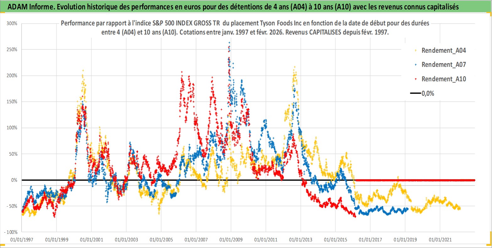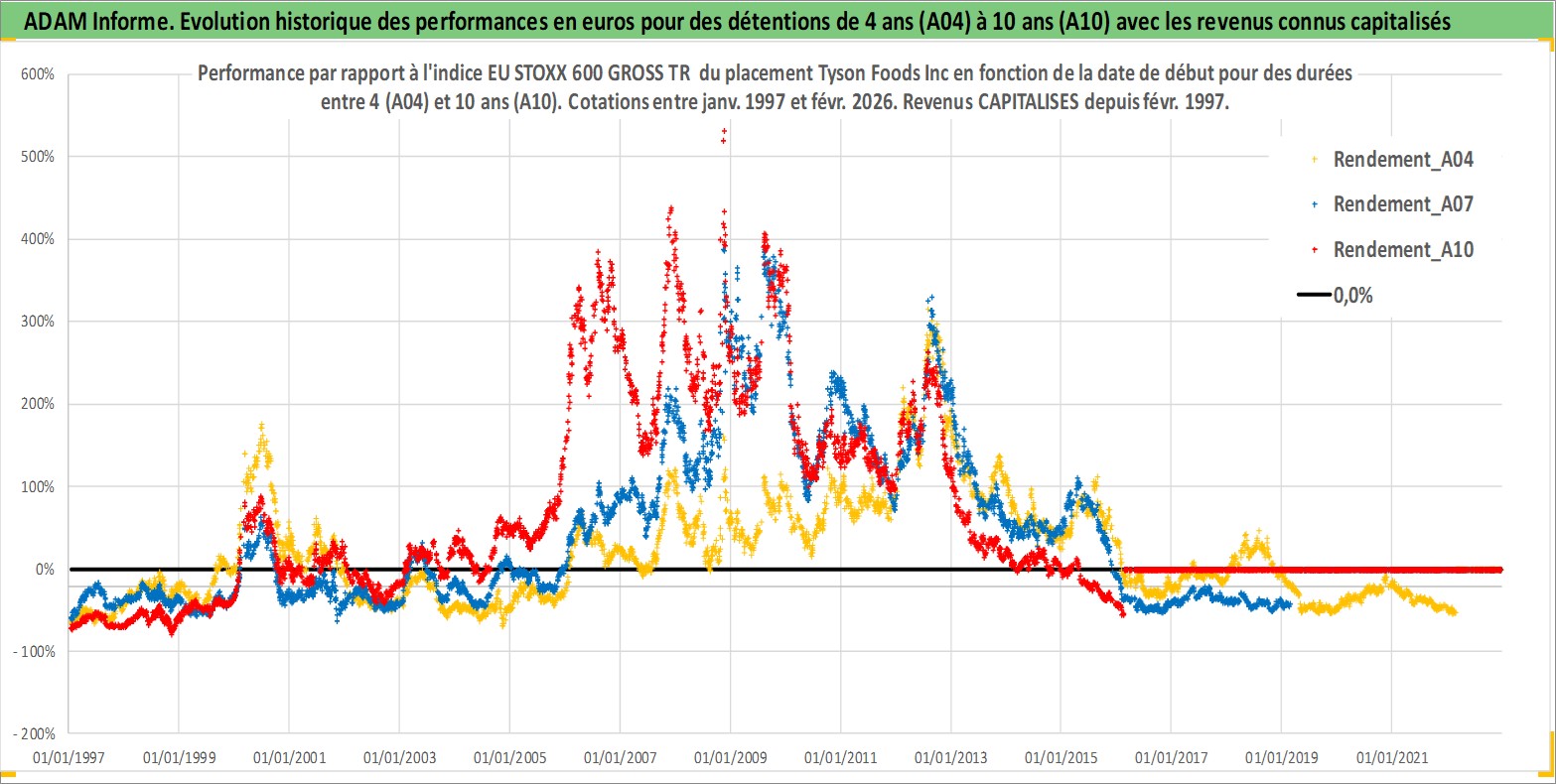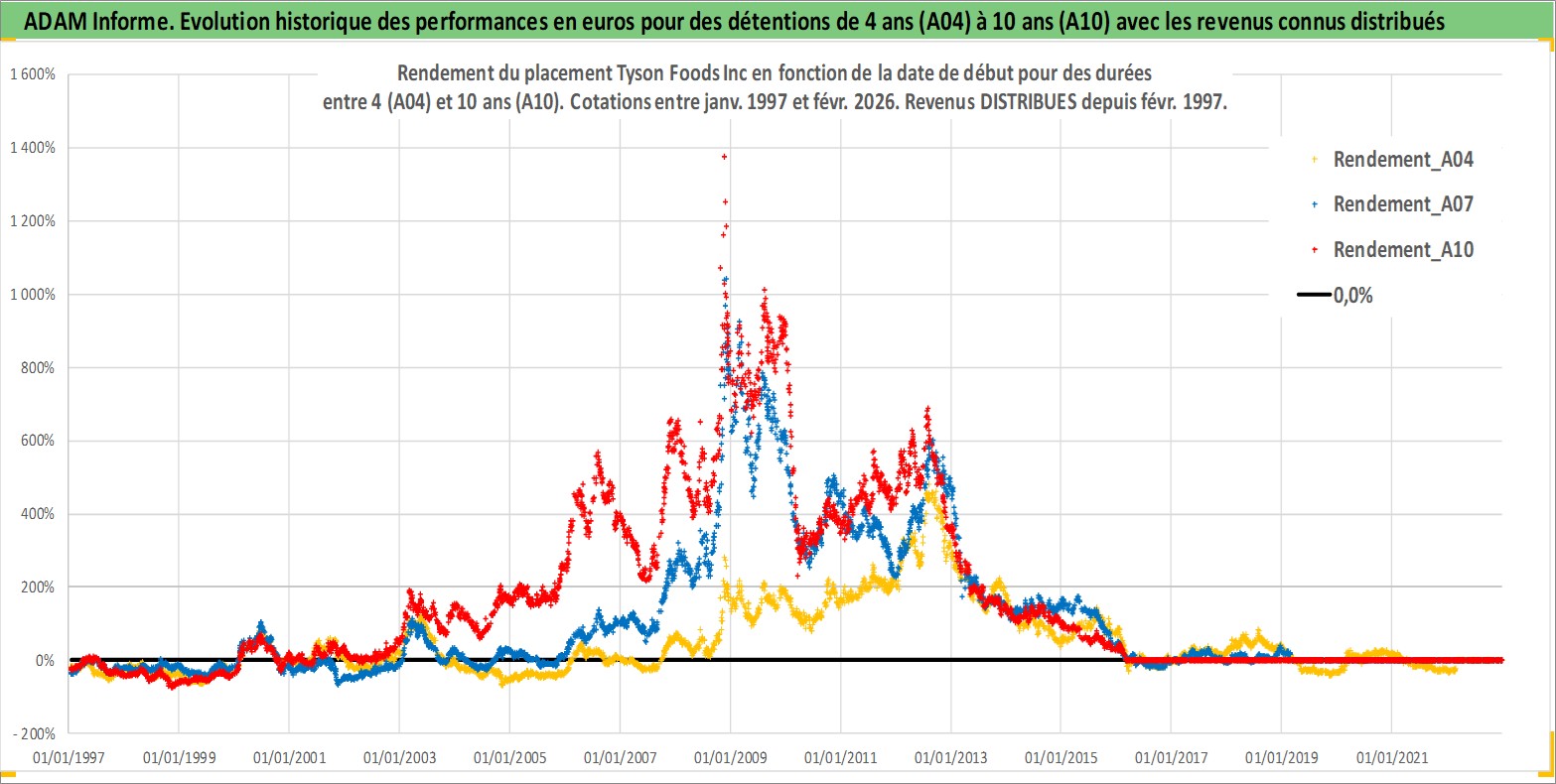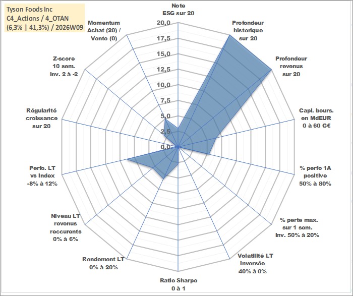 Site dédié aux investisseursPage dédiée sur site financeAnalyse des valorisations hebdomadaires de l'action Tyson Foods Inc. Cet actif est cote en USD. Les valorisations sont en contrevaleur EURO et couvrent les semaines 1997W01 a 2026W09. Les revenus de cet actif financier sont pris en compte depuis la semaine 1997W09. La note globale ESG de cet actif est estimee a 3.0 (apres rebasage entre 0 et 20).
