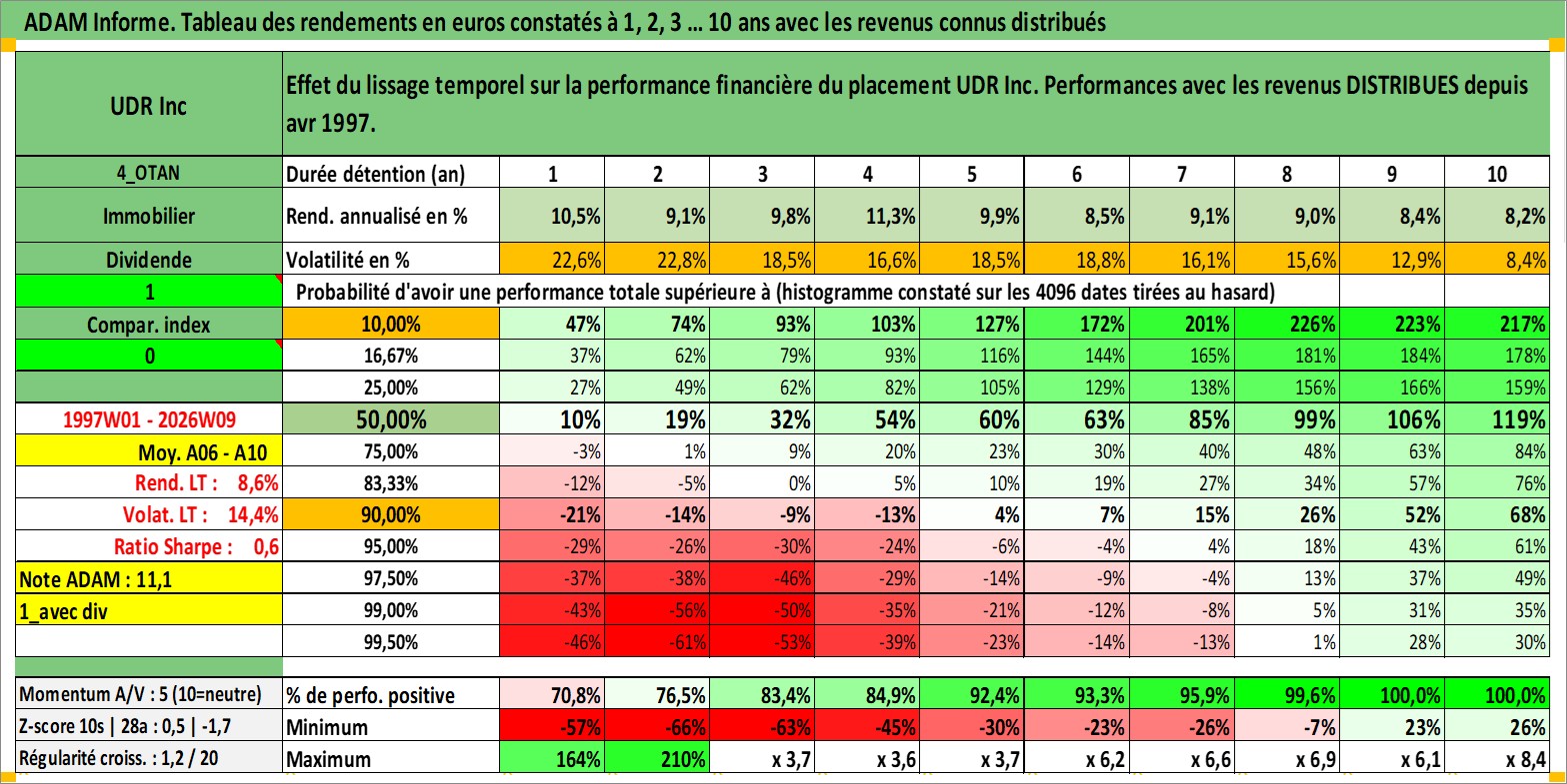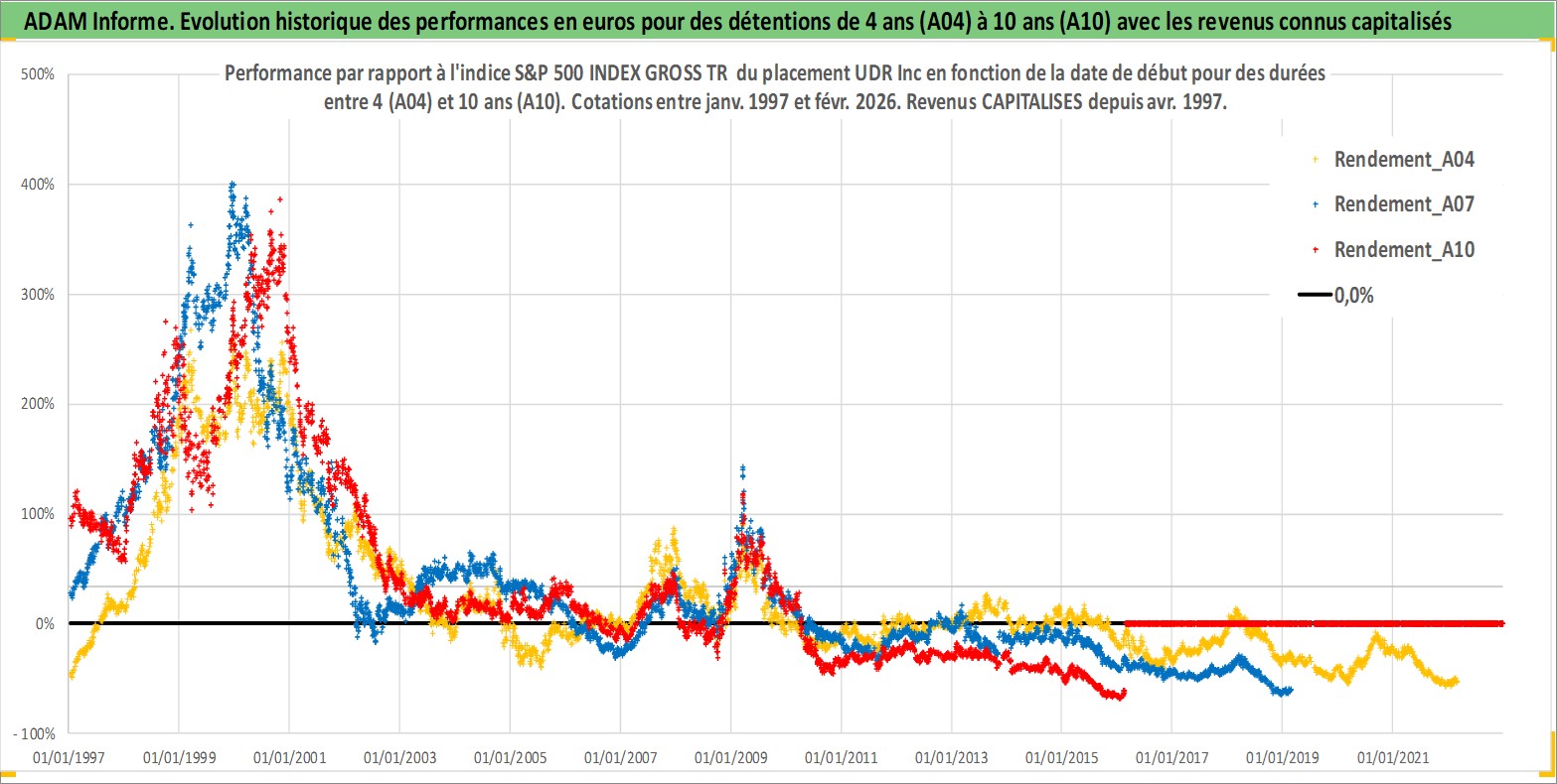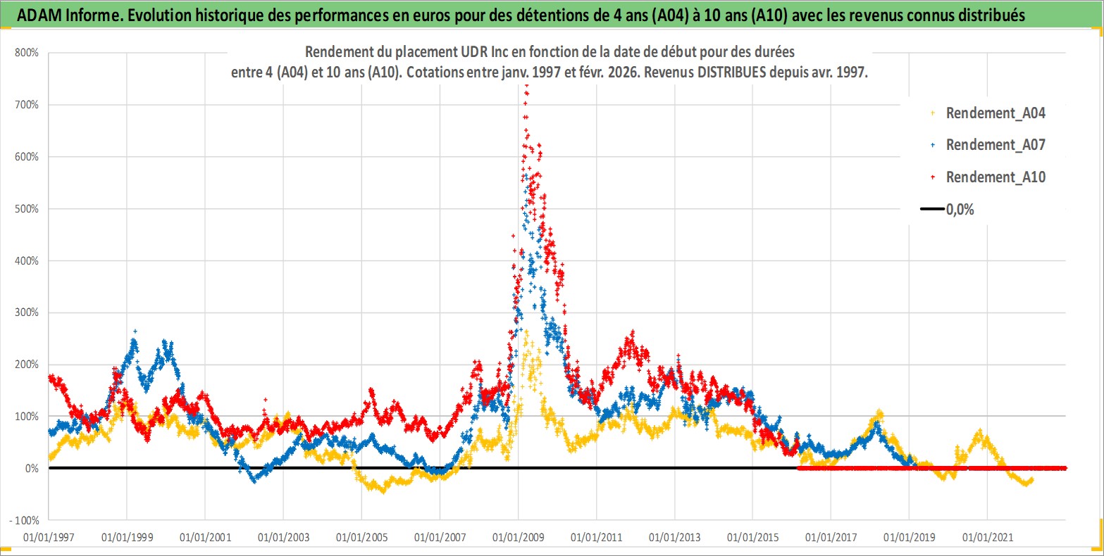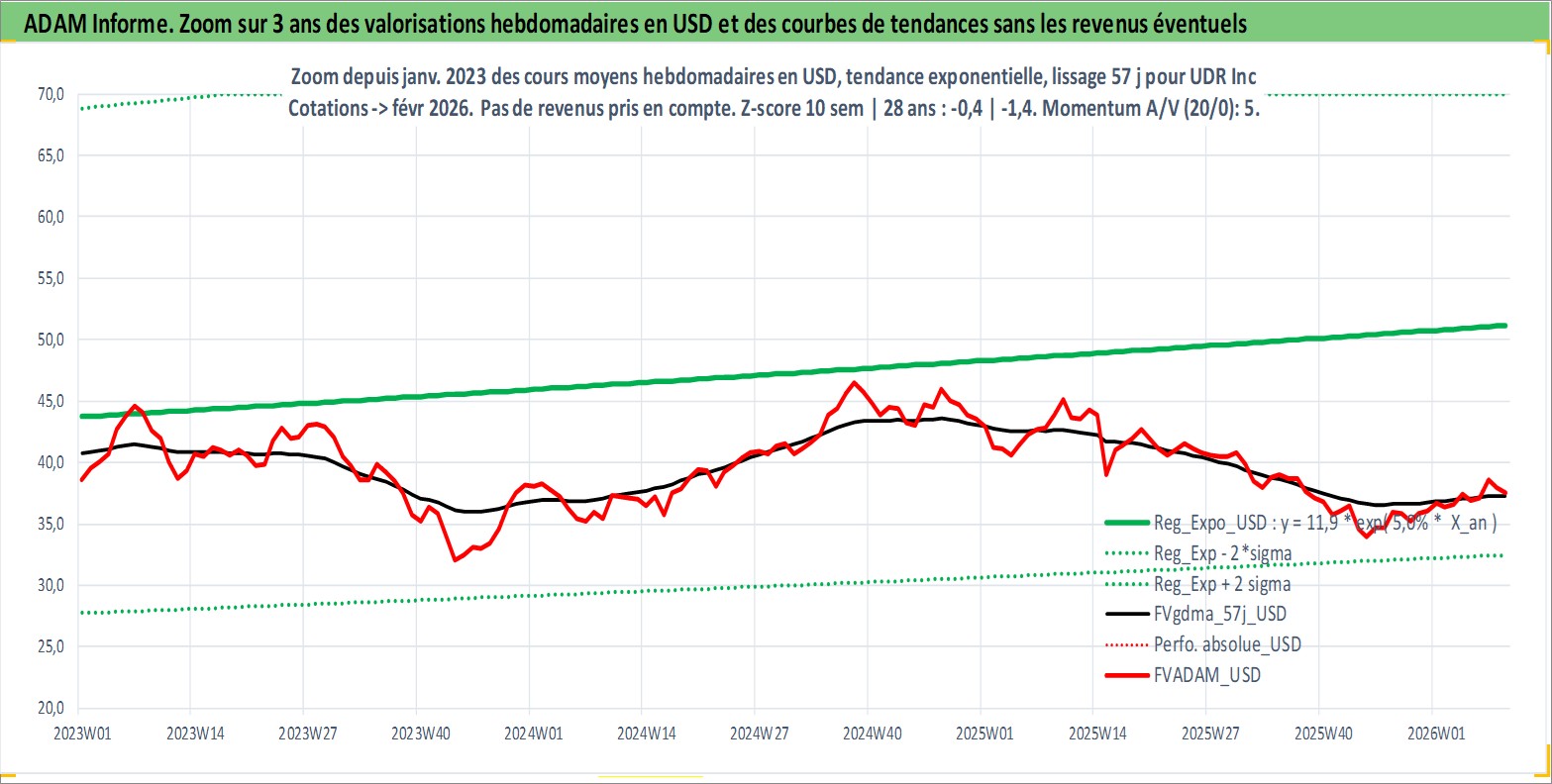 Site dédié aux investisseursPage dédiée sur site financeAnalyse des valorisations hebdomadaires de l'action UDR Inc. Cet actif est cote en USD. Les valorisations sont en contrevaleur EURO et couvrent les semaines 1997W01 a 2026W09. Les revenus de cet actif financier sont pris en compte depuis la semaine 1997W15. La note globale ESG de cet actif est estimee a 15.0 (apres rebasage entre 0 et 20).