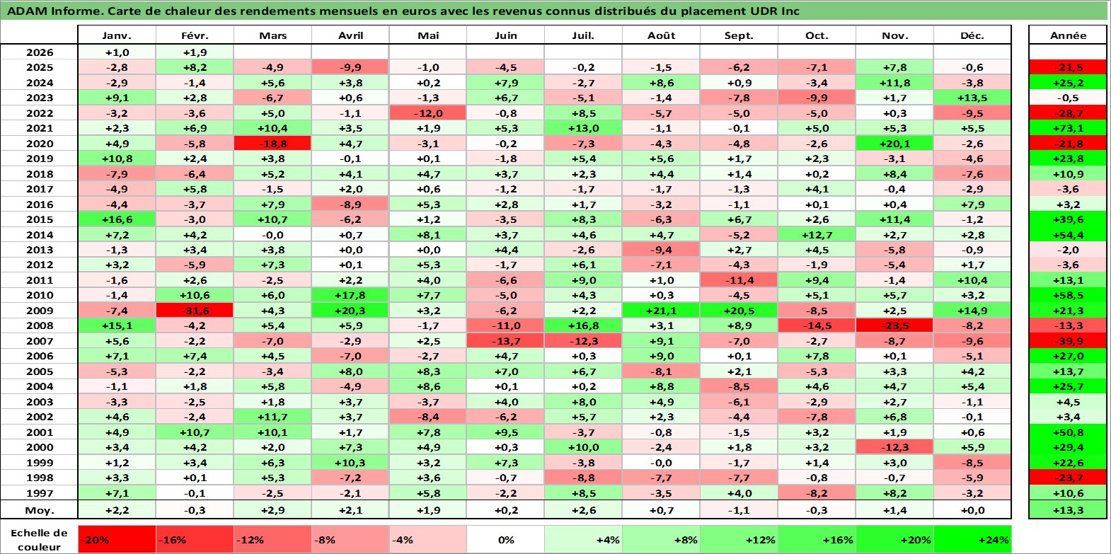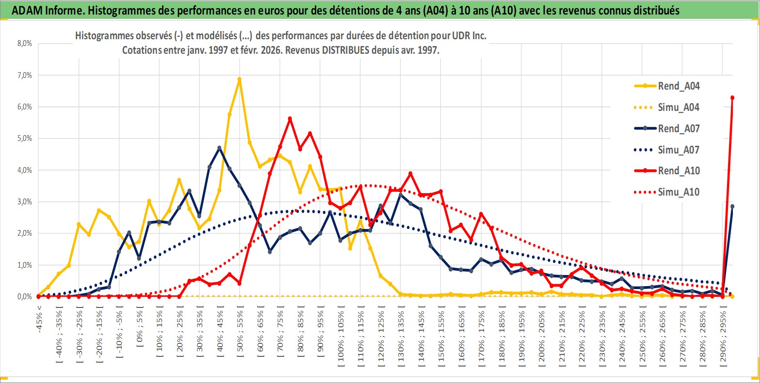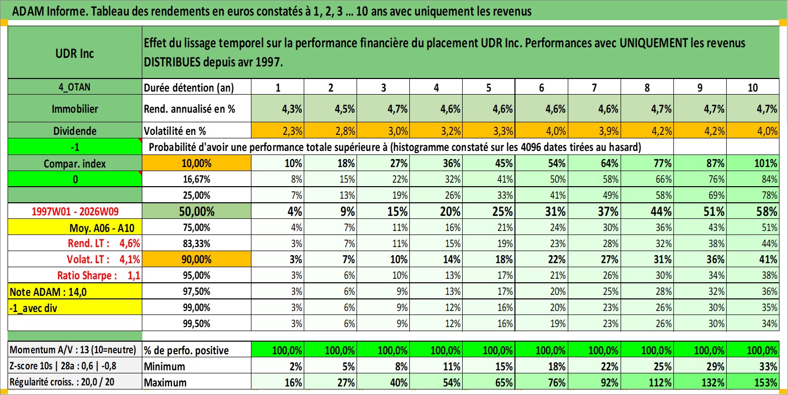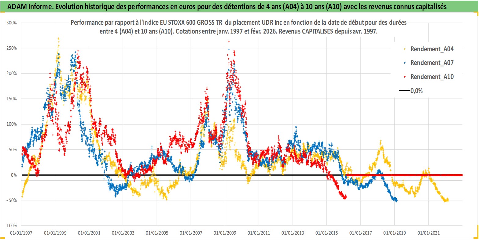 Site dédié aux investisseursPage dédiée sur site financeAnalyse des valorisations hebdomadaires de l'action UDR Inc. Cet actif est cote en USD. Les valorisations sont en contrevaleur EURO et couvrent les semaines 1997W01 a 2026W09. Les revenus de cet actif financier sont pris en compte depuis la semaine 1997W15. La note globale ESG de cet actif est estimee a 15.0 (apres rebasage entre 0 et 20).