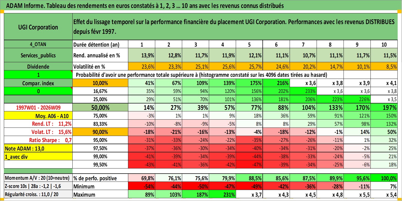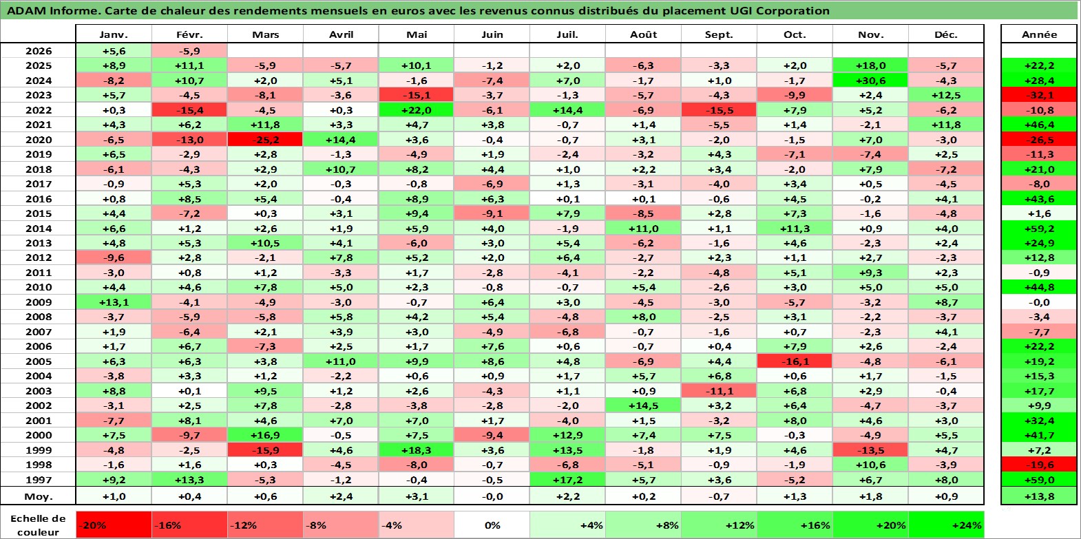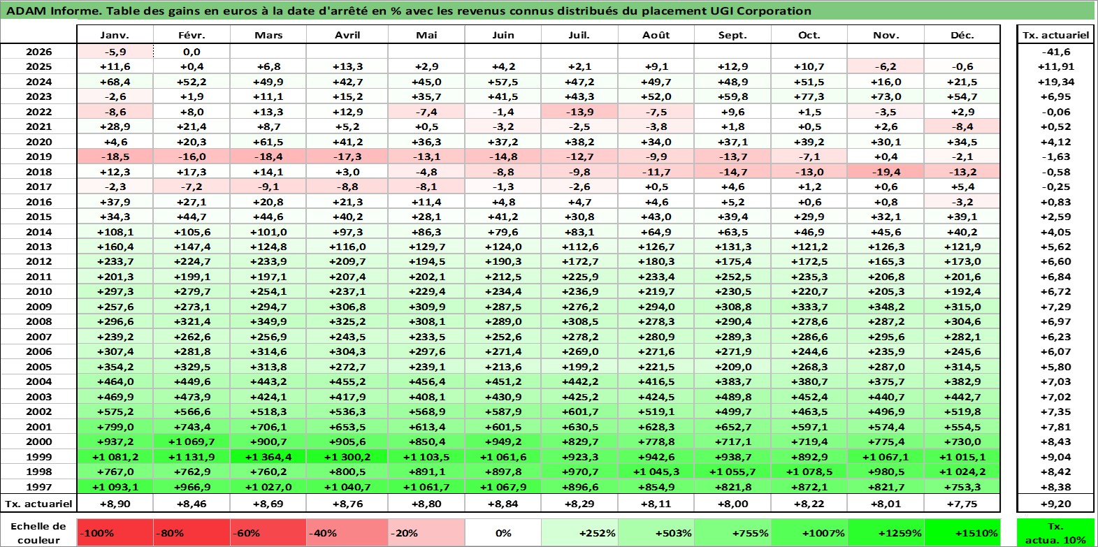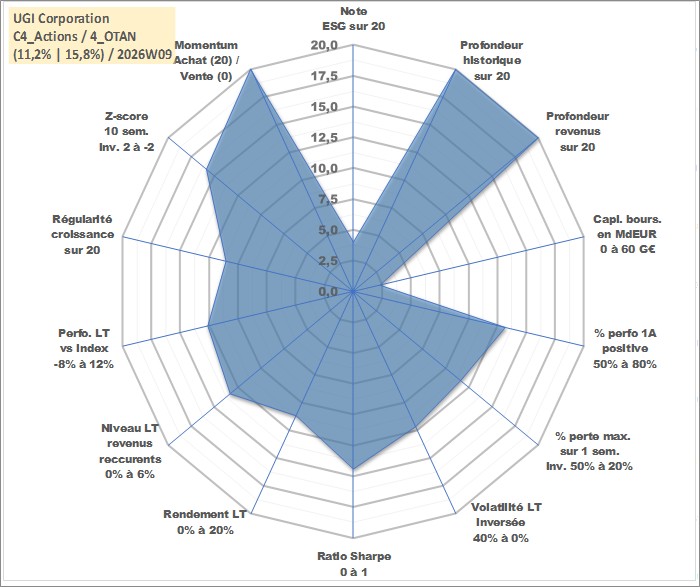 Site dédié aux investisseursPage dédiée sur site financeAnalyse des valorisations hebdomadaires de l'action UGI Corporation. Cet actif est cote en USD. Les valorisations sont en contrevaleur EURO et couvrent les semaines 1997W01 a 2026W09. Les revenus de cet actif financier sont pris en compte depuis la semaine 1997W09. La note globale ESG de cet actif est estimee a 4.0 (apres rebasage entre 0 et 20).