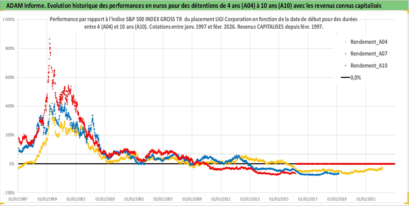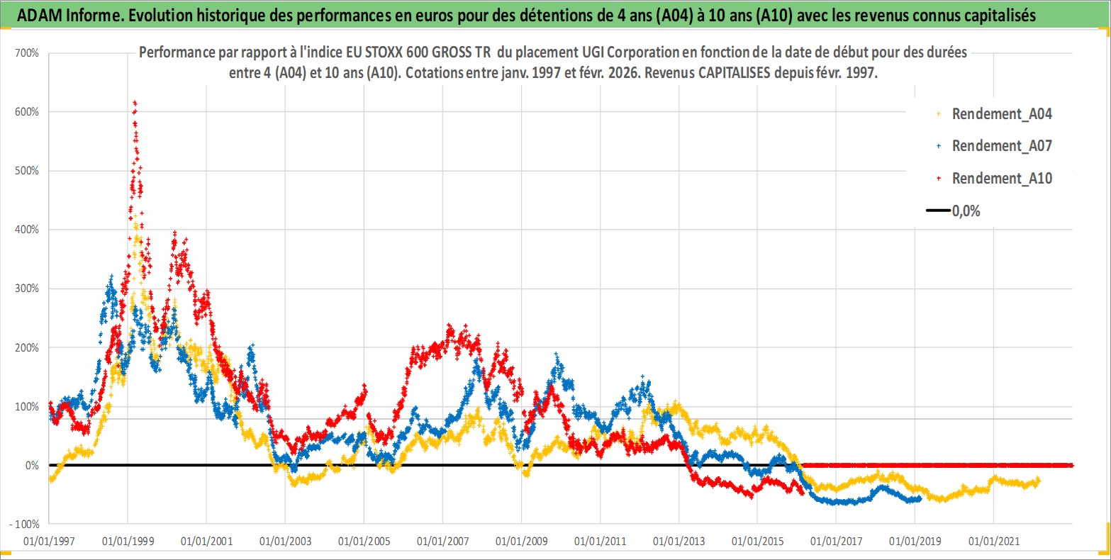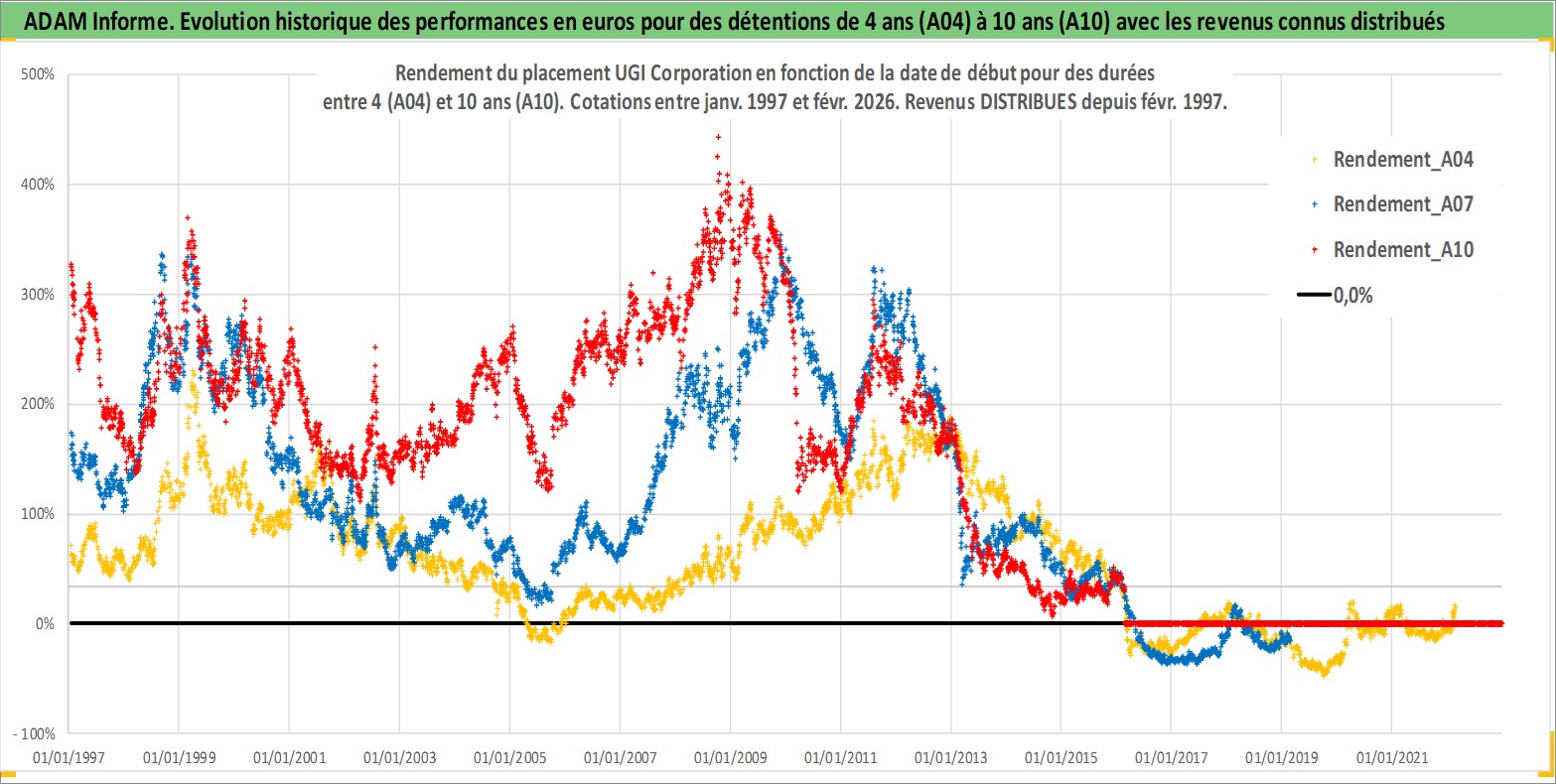 Site dédié aux investisseursPage dédiée sur site financeAnalyse des valorisations hebdomadaires de l'action UGI Corporation. Cet actif est cote en USD. Les valorisations sont en contrevaleur EURO et couvrent les semaines 1997W01 a 2026W09. Les revenus de cet actif financier sont pris en compte depuis la semaine 1997W09. La note globale ESG de cet actif est estimee a 4.0 (apres rebasage entre 0 et 20).
