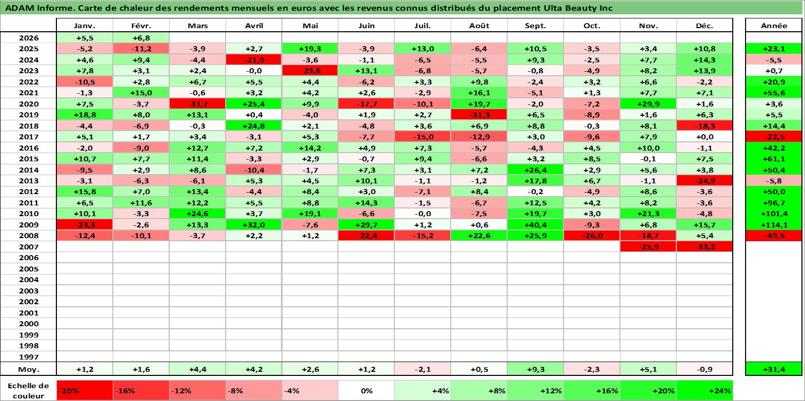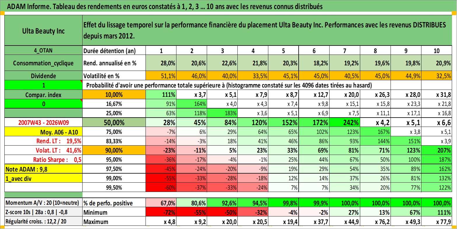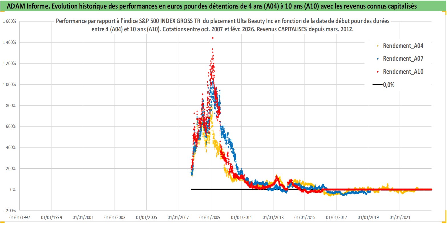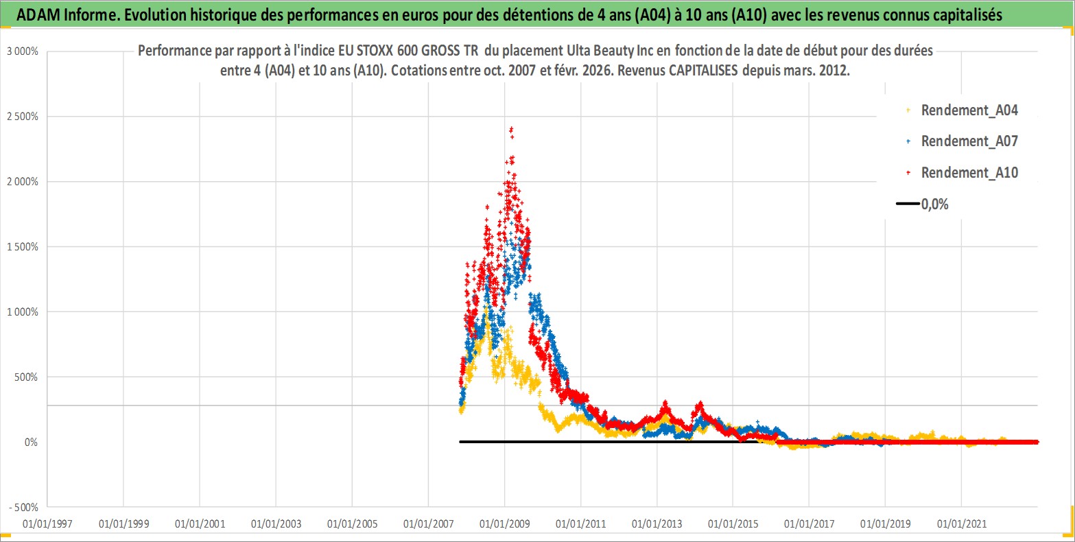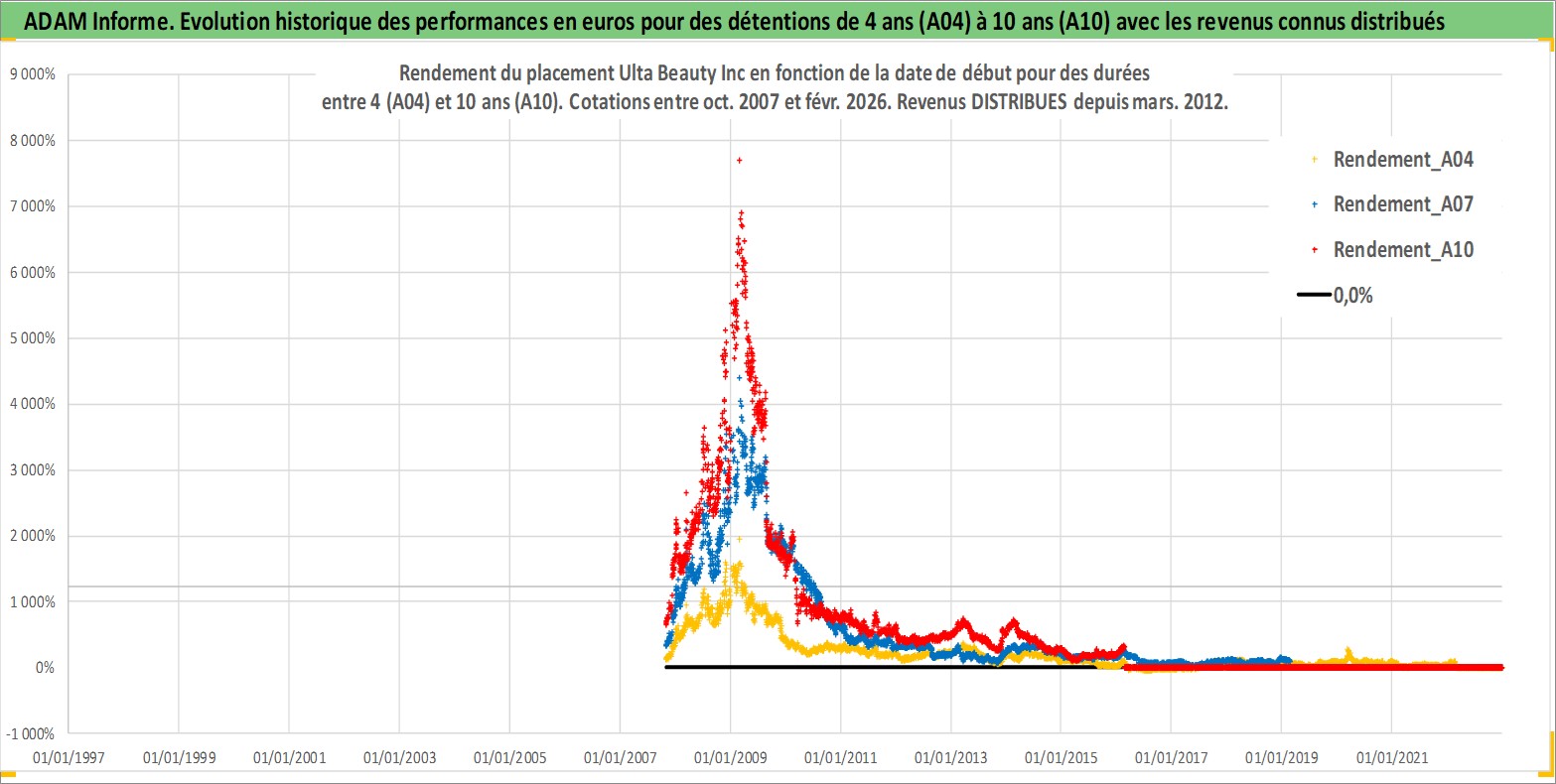 Site dédié aux investisseursPage dédiée sur site financeAnalyse des valorisations hebdomadaires de l'action Ulta Beauty Inc. Cet actif est cote en USD. Les valorisations sont en contrevaleur EURO et couvrent les semaines 2007W43 a 2026W09. Les revenus de cet actif financier sont pris en compte depuis la semaine 2012W11. La note globale ESG de cet actif est estimee a 13.0 (apres rebasage entre 0 et 20).