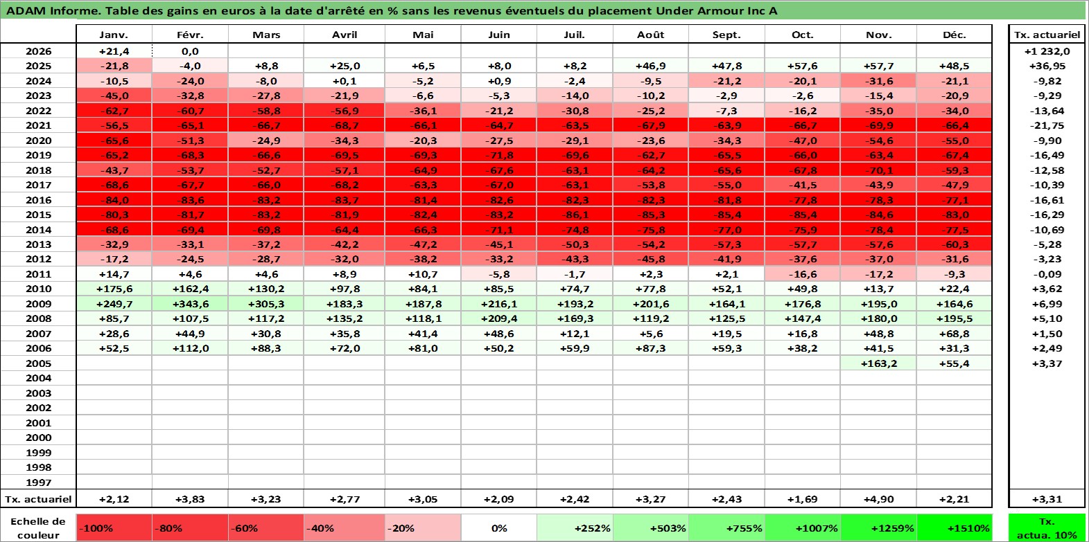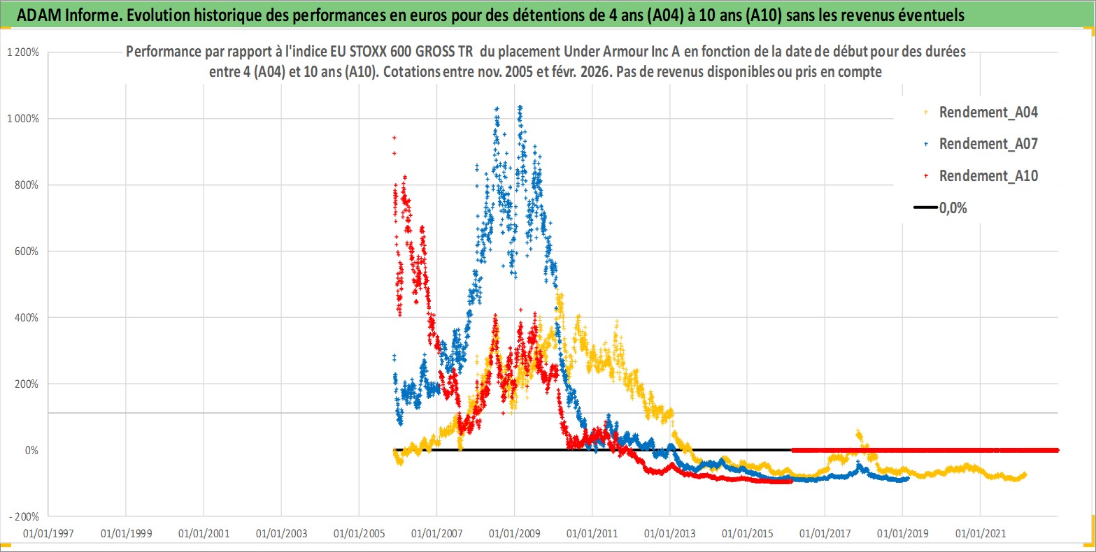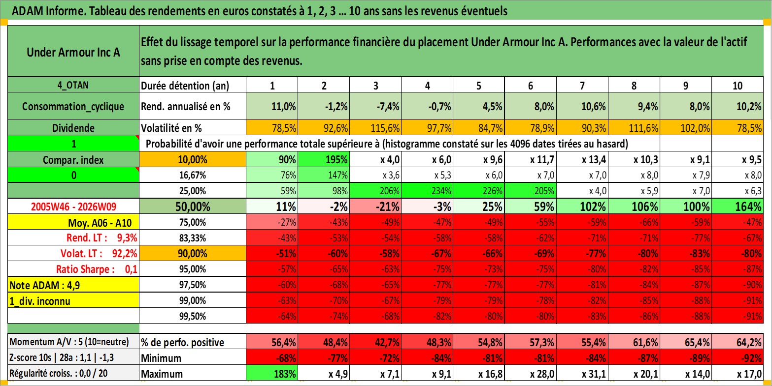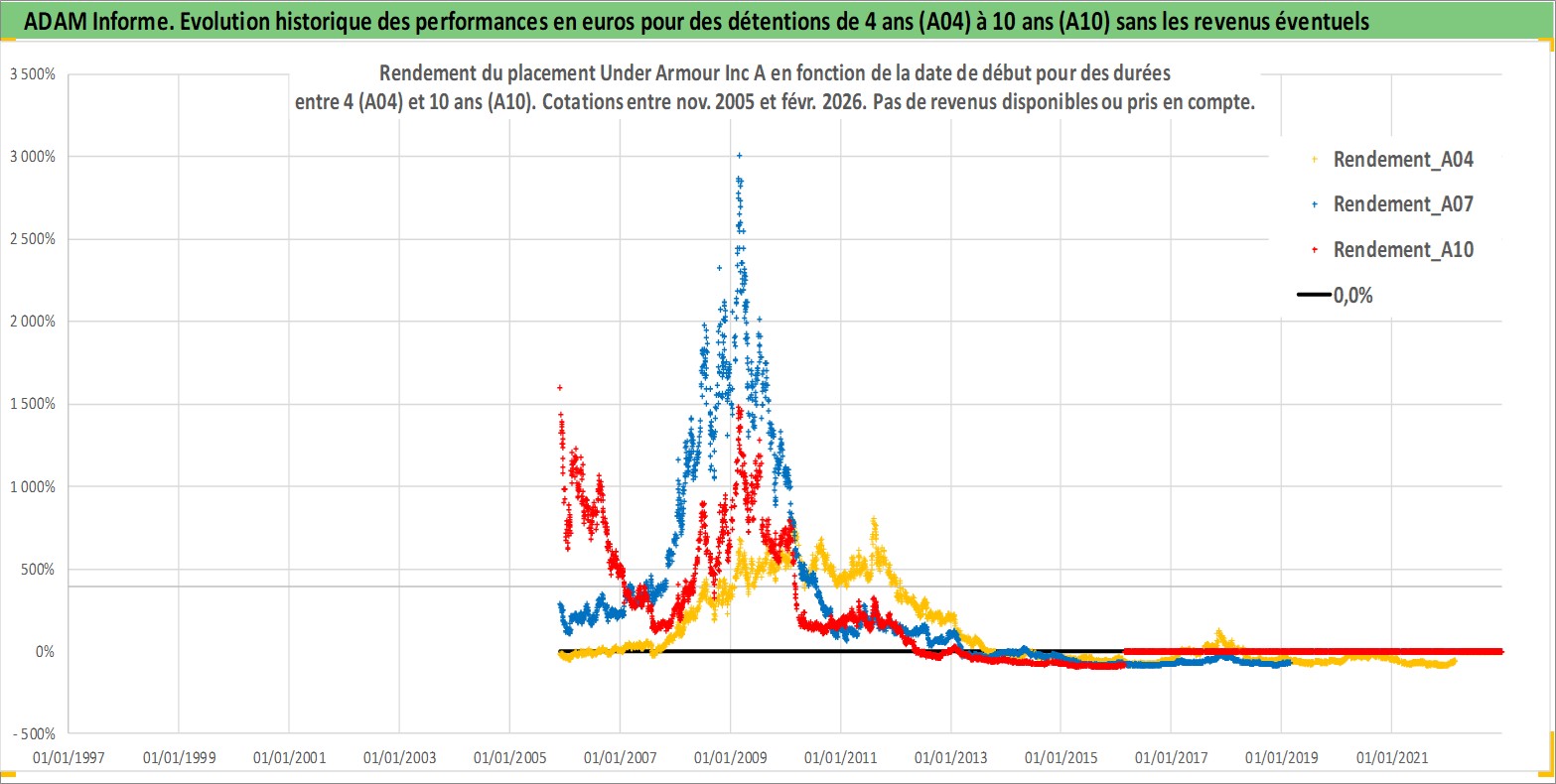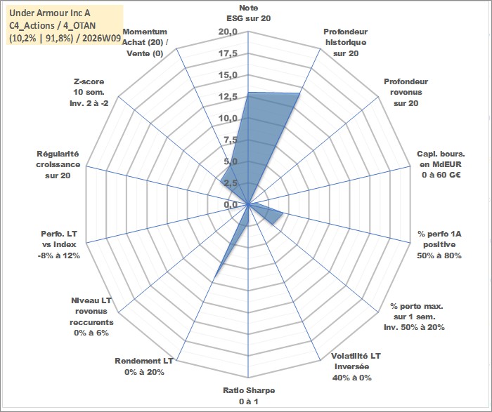 Site dédié aux investisseursPage dédiée sur site financeAnalyse des valorisations hebdomadaires de l'action Under Armour Inc A. Cet actif est cote en USD. Les valorisations sont en contrevaleur EURO et couvrent les semaines 2005W46 a 2026W09. Les revenus de cet actif financier ne sont pas connus car non existants ou non disponibles sur le site Yahoo Finance. La note globale ESG de cet actif est estimee a 13.0 (apres rebasage entre 0 et 20).