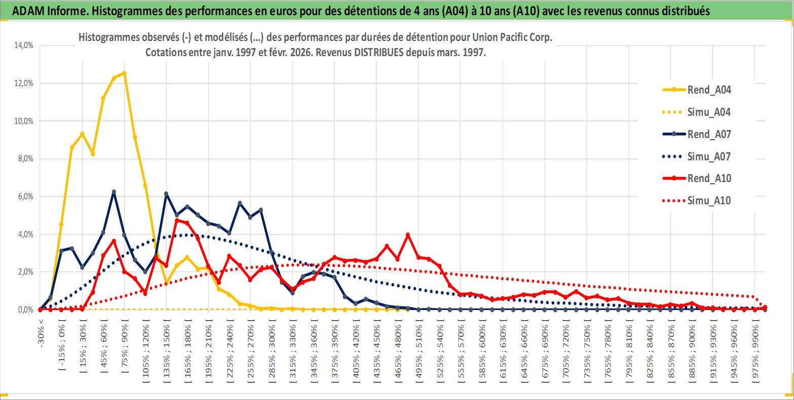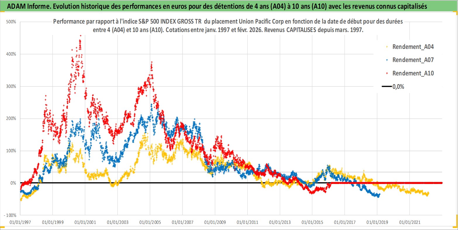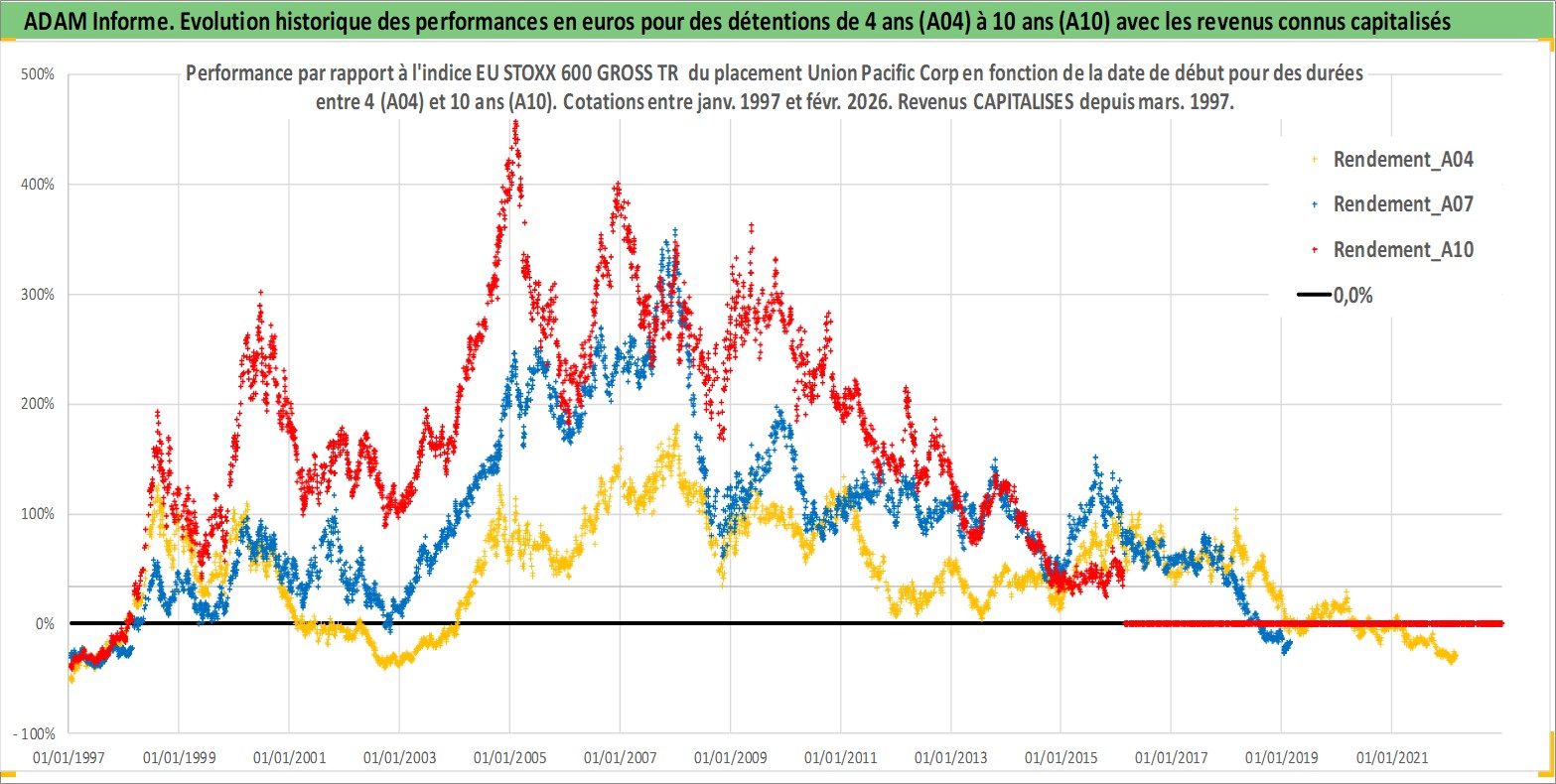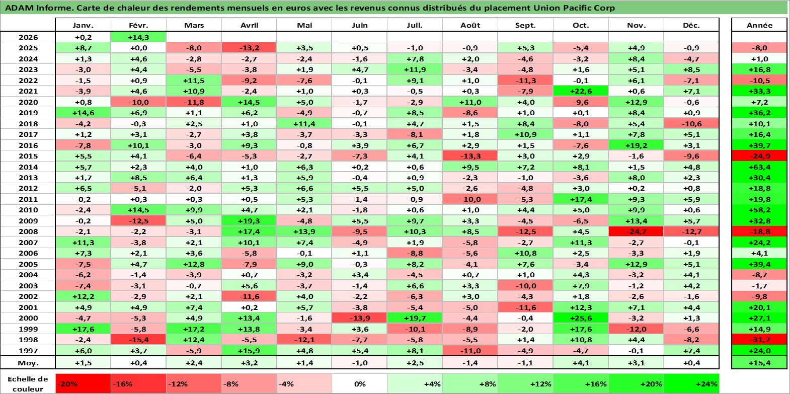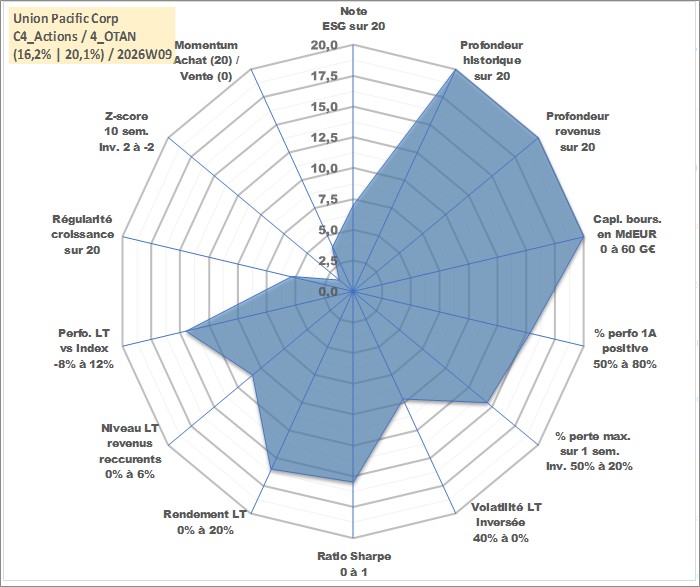 Site dédié aux investisseursPage dédiée sur site financeAnalyse des valorisations hebdomadaires de l'action Union Pacific Corp. Cet actif est cote en USD. Les valorisations sont en contrevaleur EURO et couvrent les semaines 1997W01 a 2026W09. Les revenus de cet actif financier sont pris en compte depuis la semaine 1997W11. La note globale ESG de cet actif est estimee a 7.0 (apres rebasage entre 0 et 20).