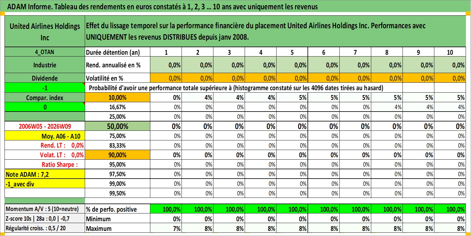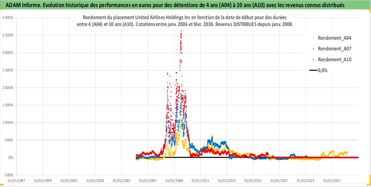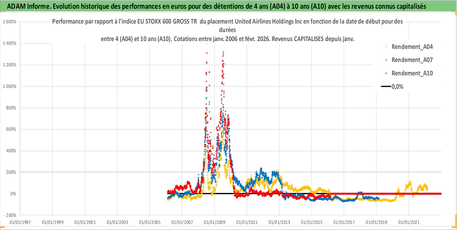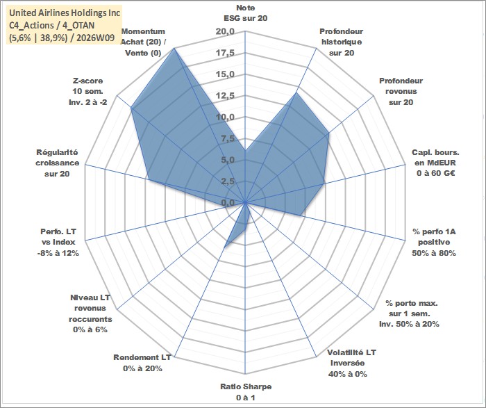 Site dédié aux investisseursPage dédiée sur site financeAnalyse des valorisations hebdomadaires de l'action United Airlines Holdings Inc. Cet actif est cote en USD. Les valorisations sont en contrevaleur EURO et couvrent les semaines 2006W05 a 2026W09. Les revenus de cet actif financier sont pris en compte depuis la semaine 2008W02. La note globale ESG de cet actif est estimee a 6.0 (apres rebasage entre 0 et 20).