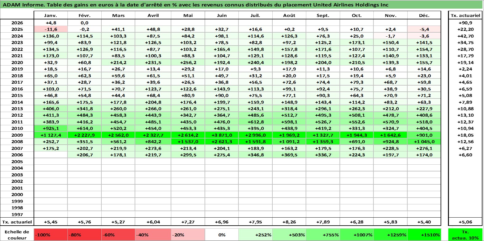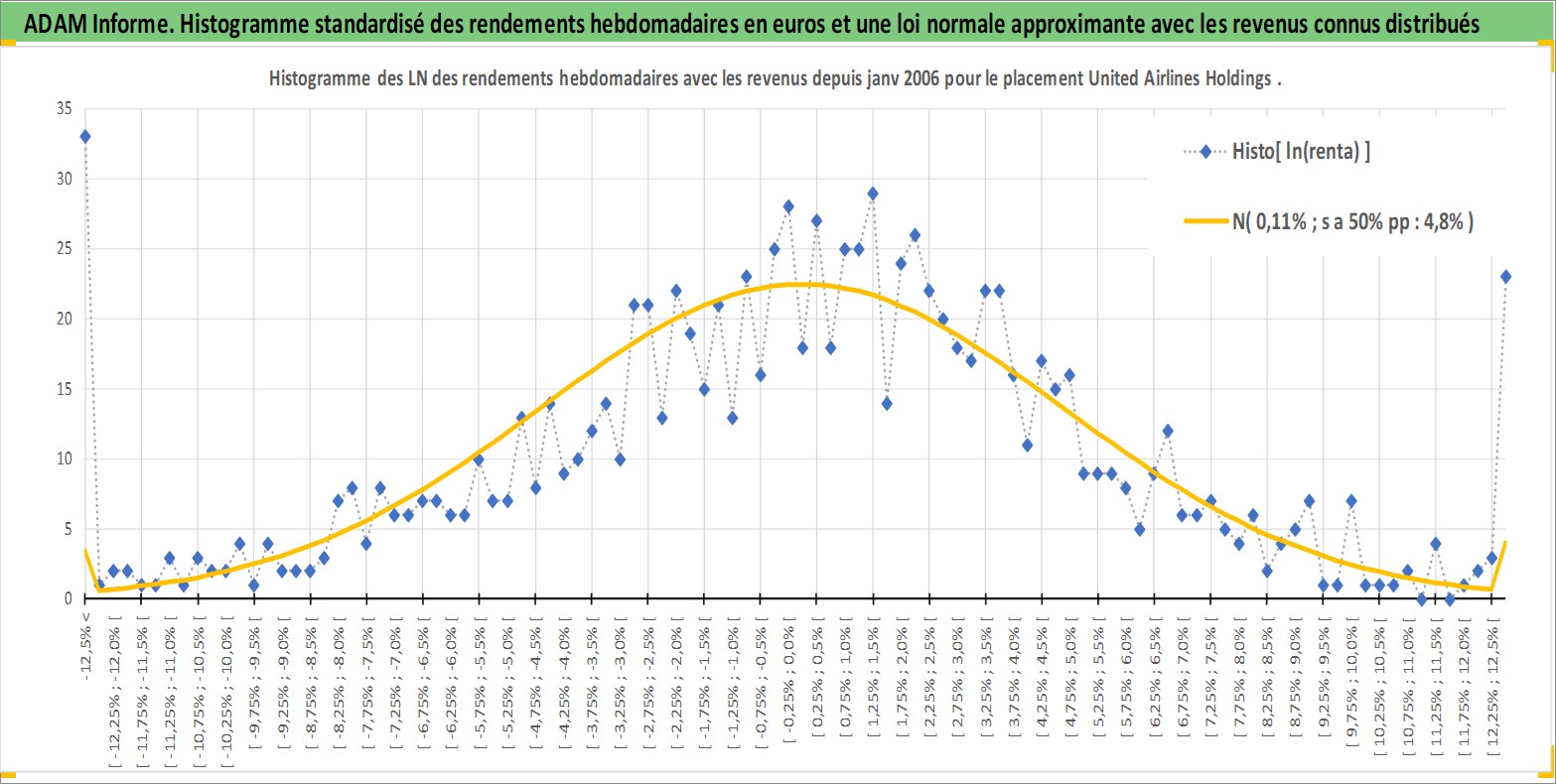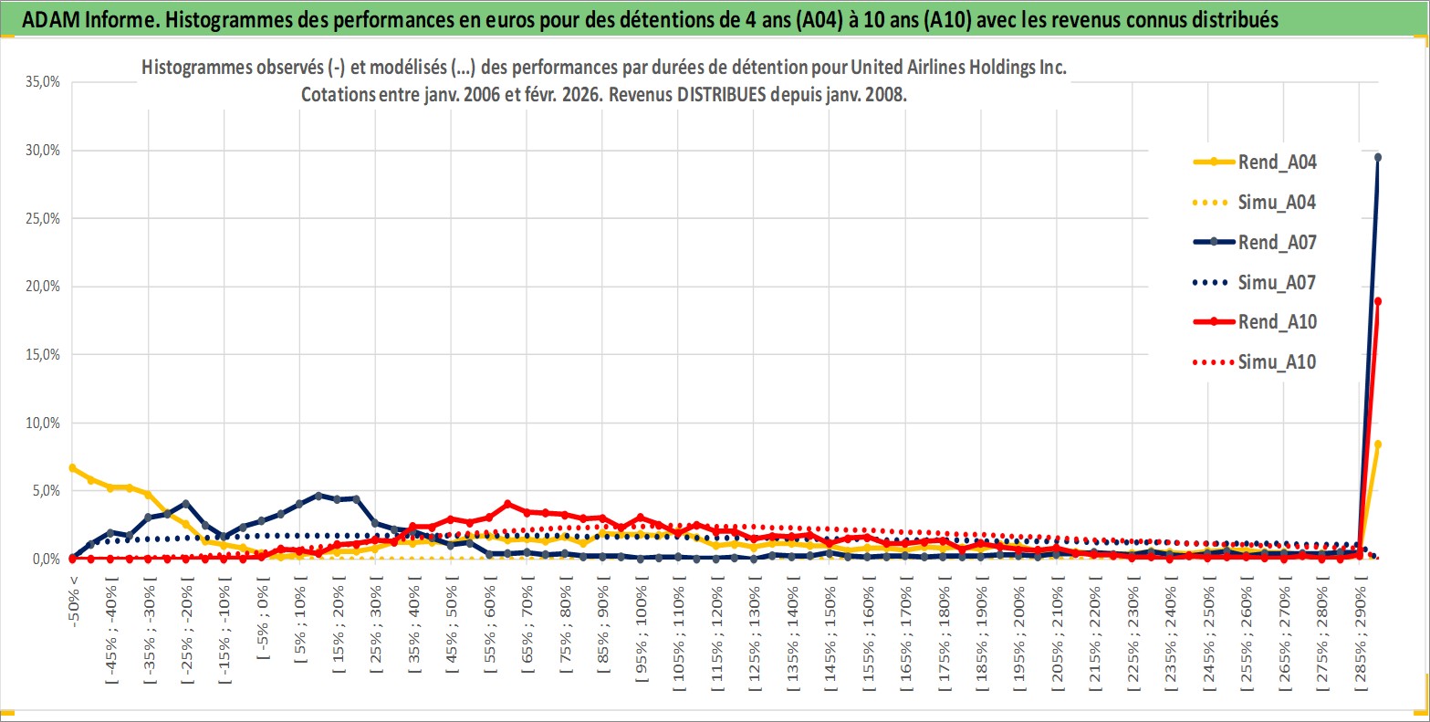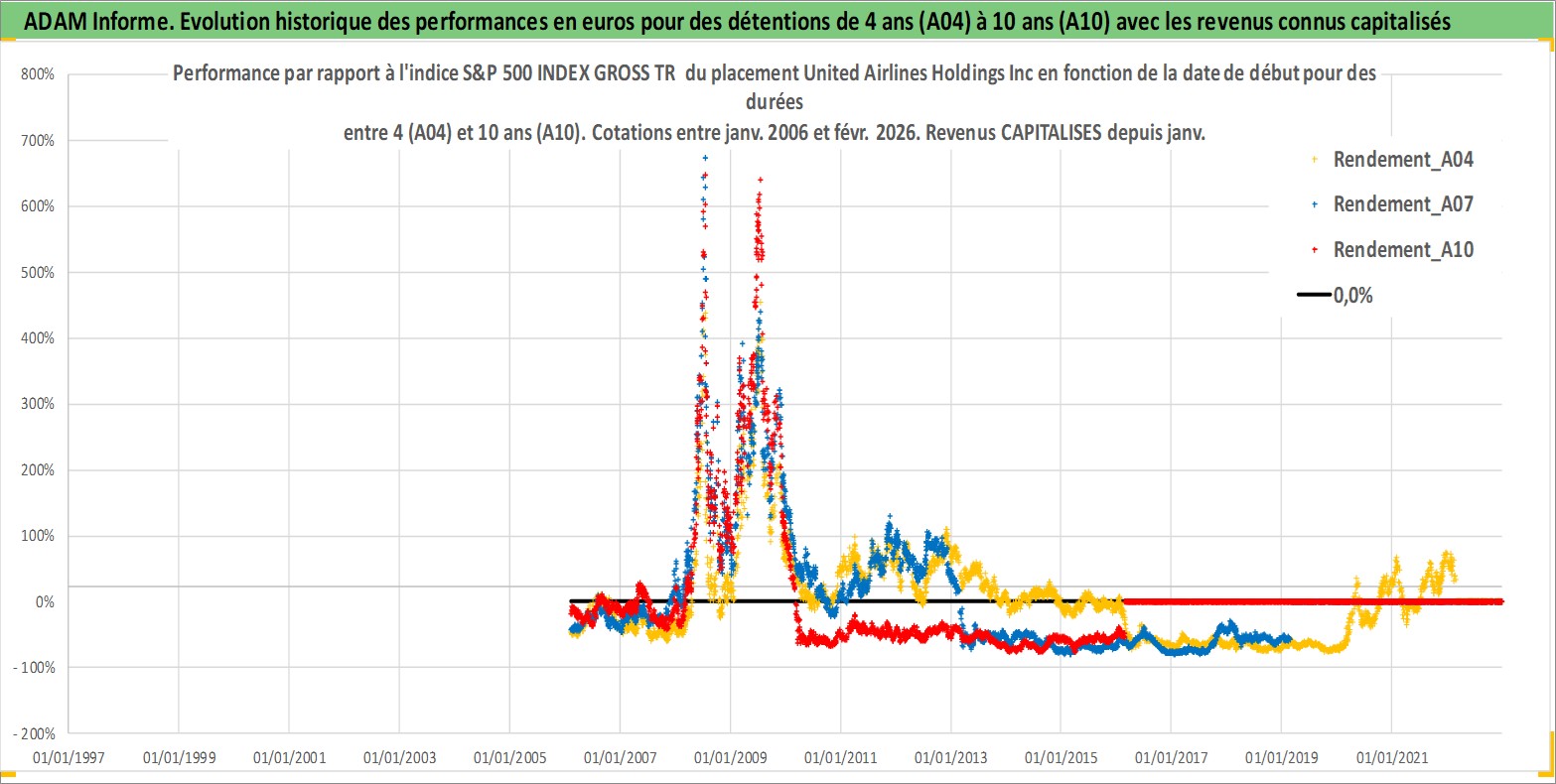 Site dédié aux investisseursPage dédiée sur site financeAnalyse des valorisations hebdomadaires de l'action United Airlines Holdings Inc. Cet actif est cote en USD. Les valorisations sont en contrevaleur EURO et couvrent les semaines 2006W05 a 2026W09. Les revenus de cet actif financier sont pris en compte depuis la semaine 2008W02. La note globale ESG de cet actif est estimee a 6.0 (apres rebasage entre 0 et 20).