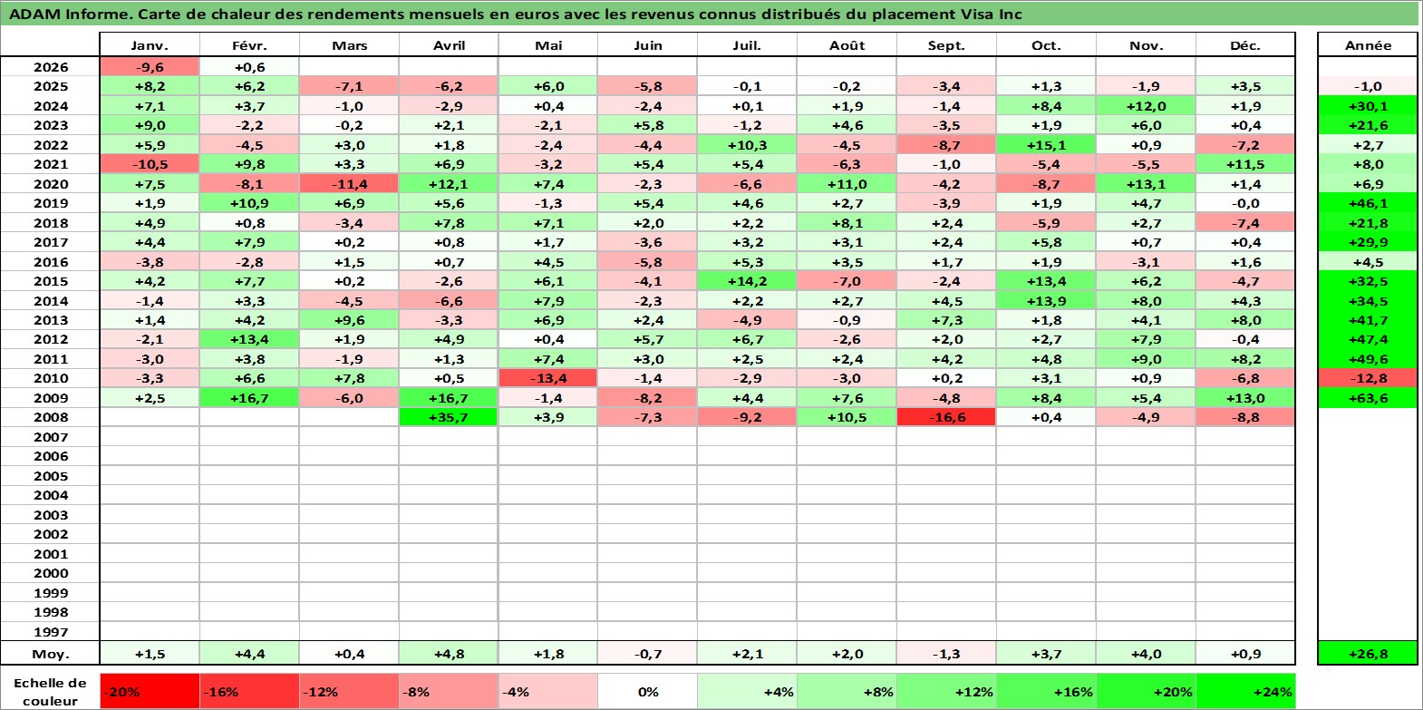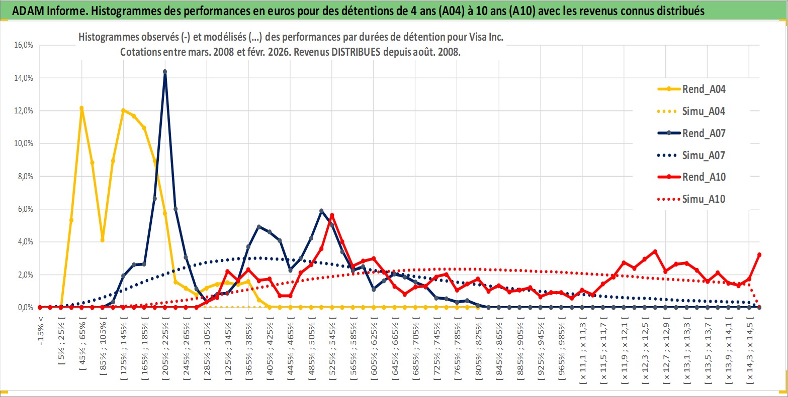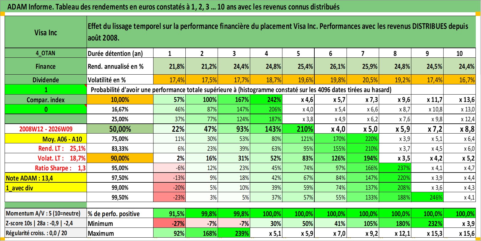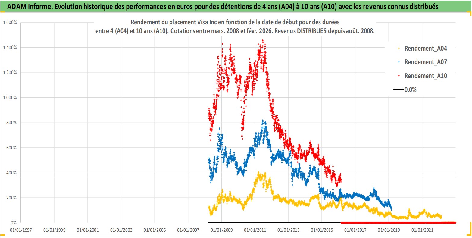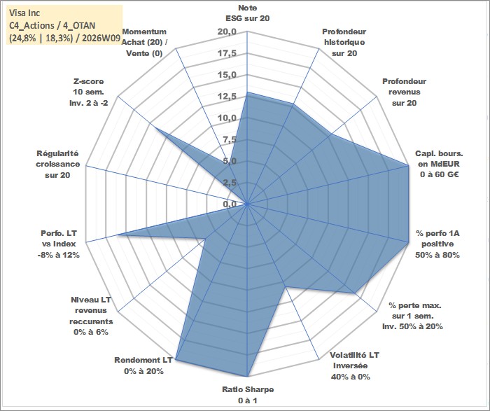 Site dédié aux investisseursPage dédiée sur site financeAnalyse des valorisations hebdomadaires de l'action Visa Inc. Cet actif est cote en USD. Les valorisations sont en contrevaleur EURO et couvrent les semaines 2008W12 a 2026W09. Les revenus de cet actif financier sont pris en compte depuis la semaine 2008W33. La note globale ESG de cet actif est estimee a 13.0 (apres rebasage entre 0 et 20).