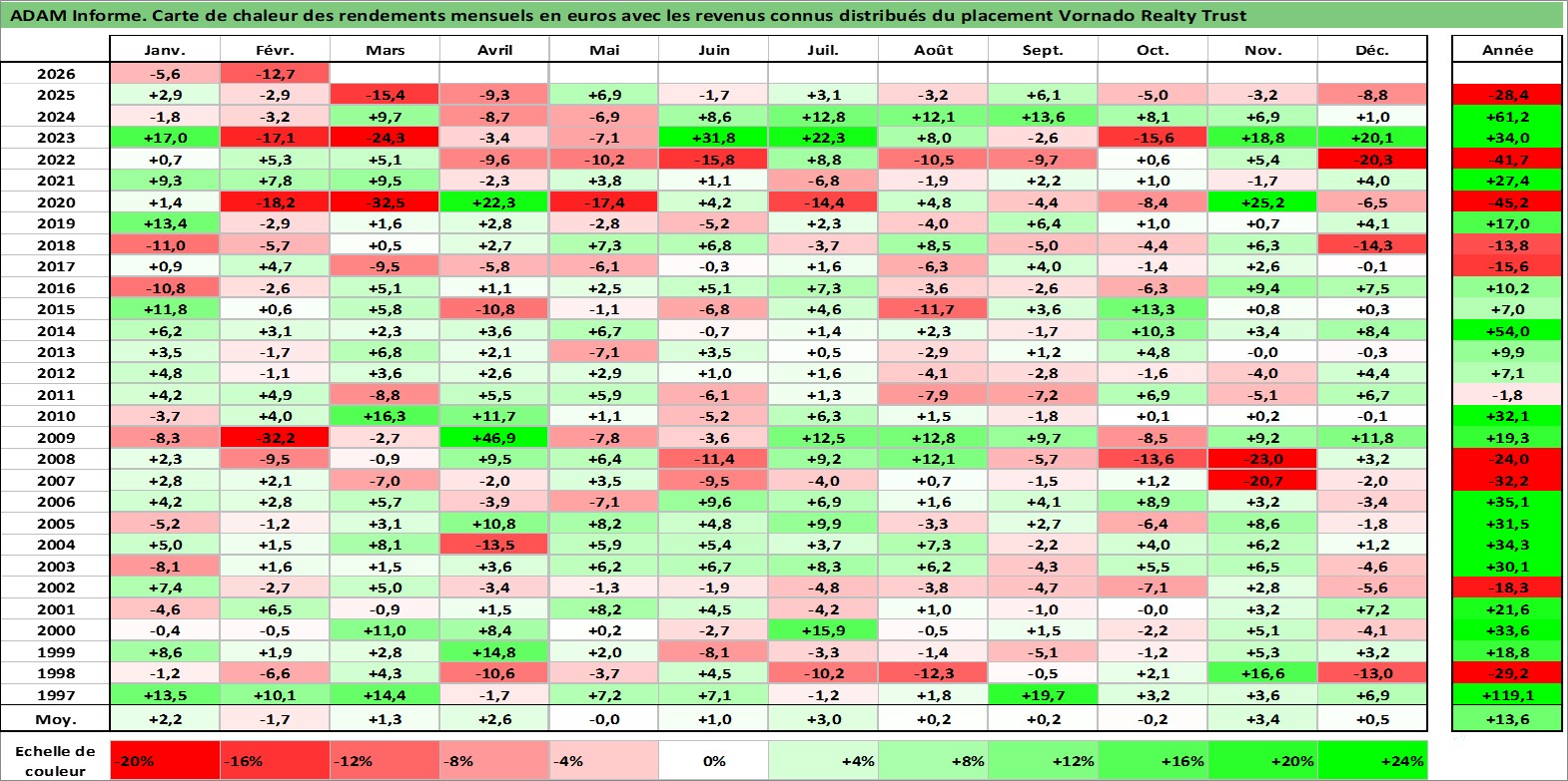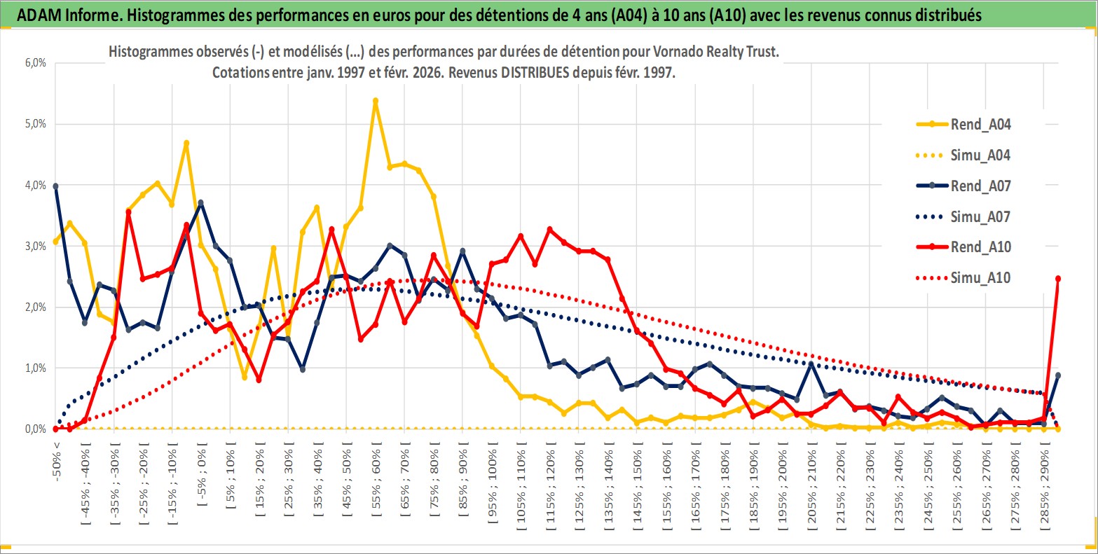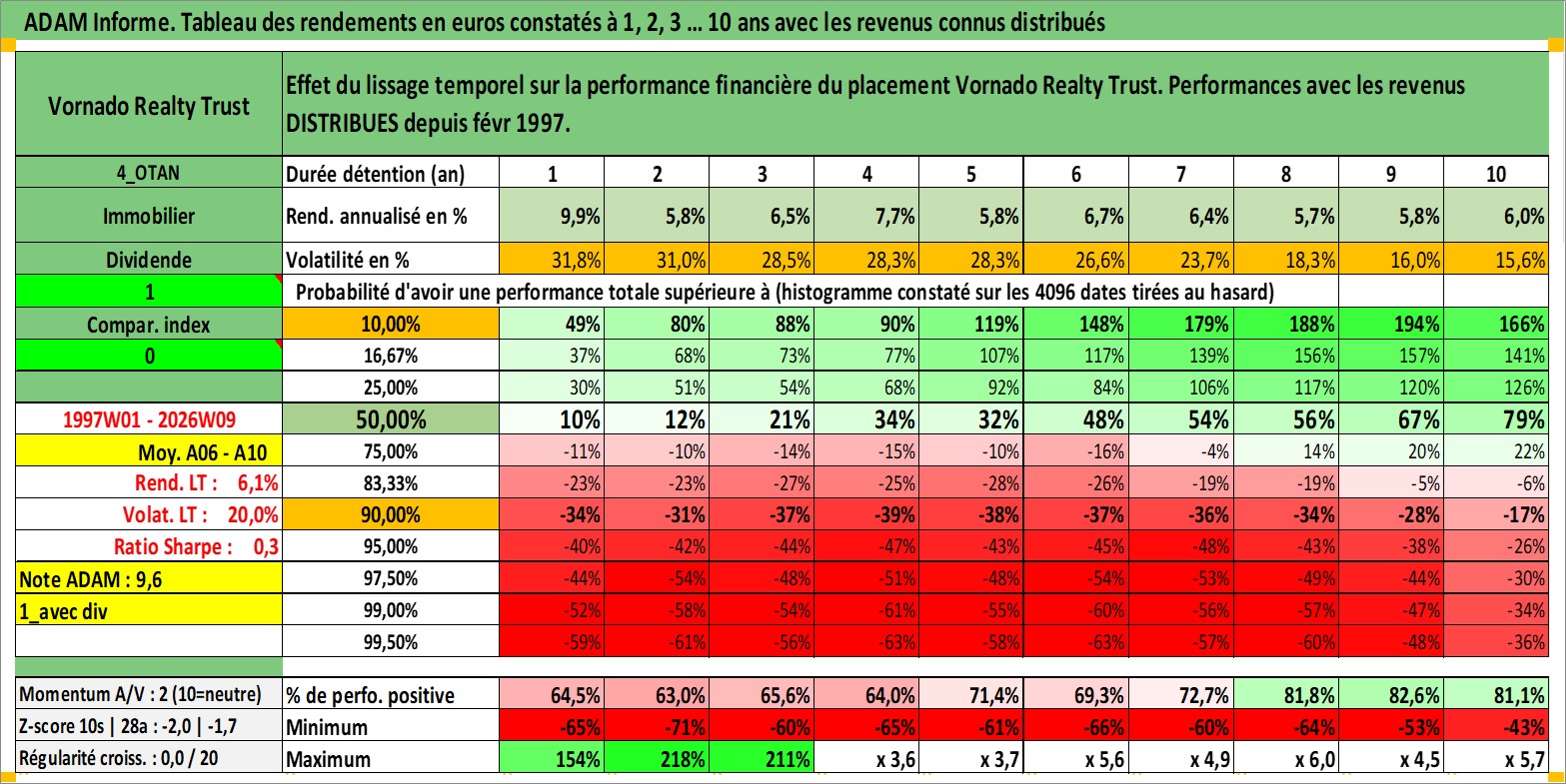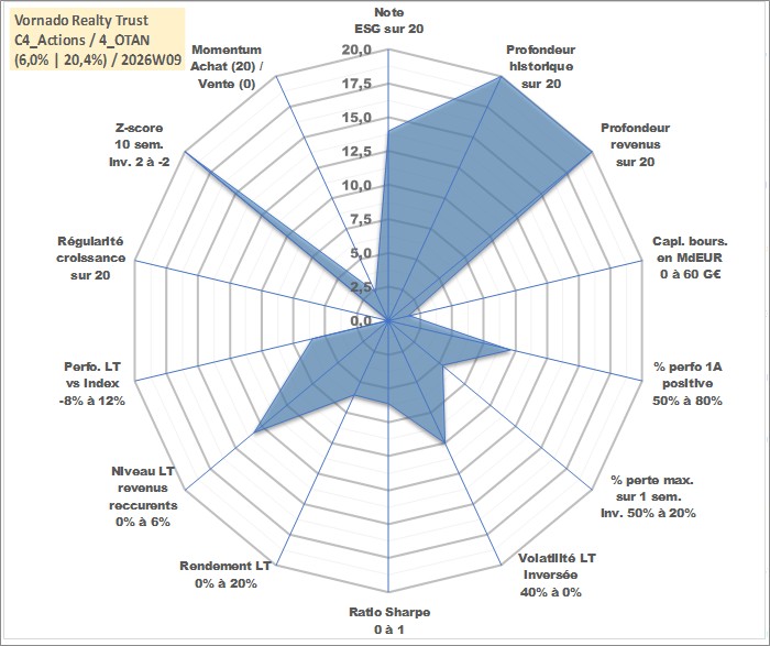 Site dédié aux investisseursPage dédiée sur site financeAnalyse des valorisations hebdomadaires de l'action Vornado Realty Trust. Cet actif est cote en USD. Les valorisations sont en contrevaleur EURO et couvrent les semaines 1997W01 a 2026W09. Les revenus de cet actif financier sont pris en compte depuis la semaine 1997W06. La note globale ESG de cet actif est estimee a 14.0 (apres rebasage entre 0 et 20).