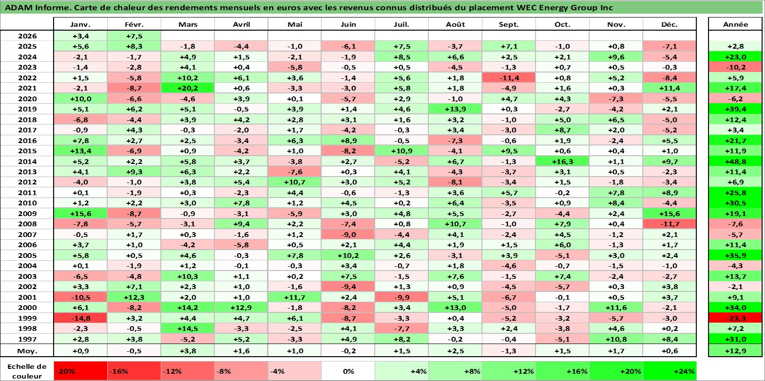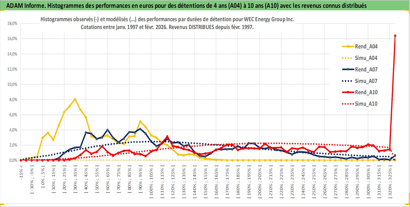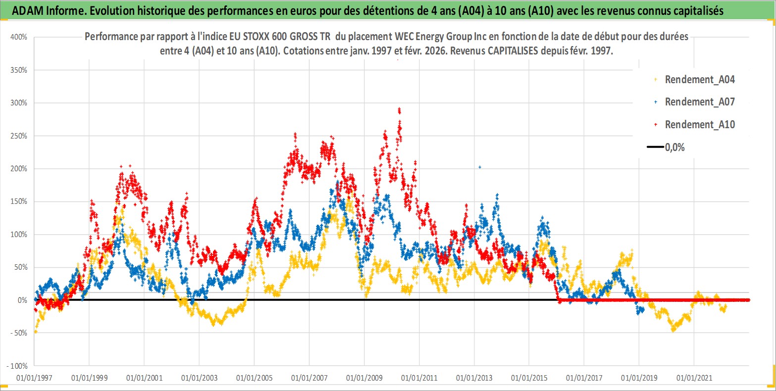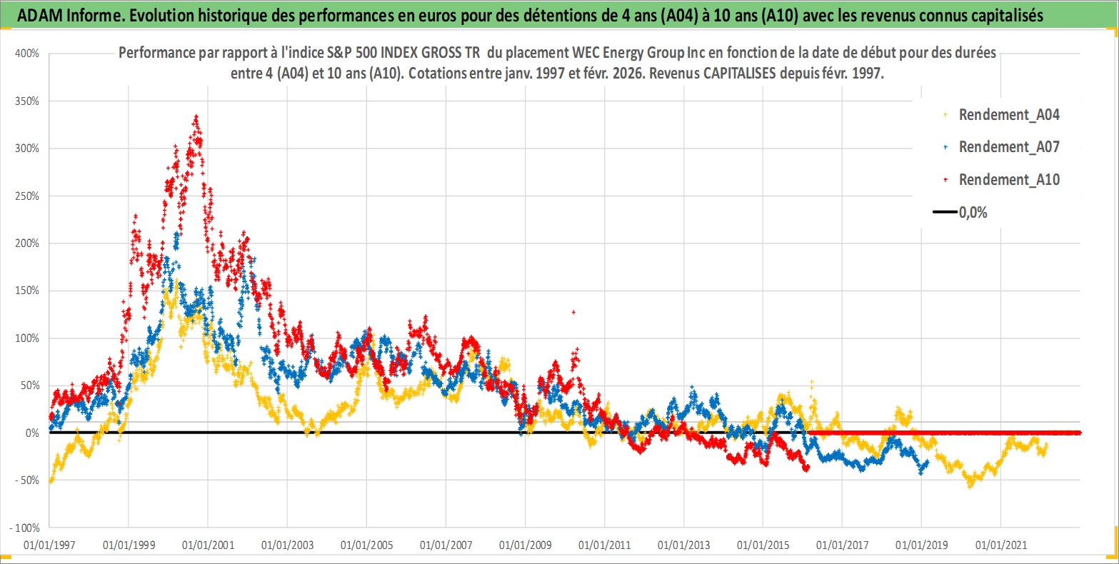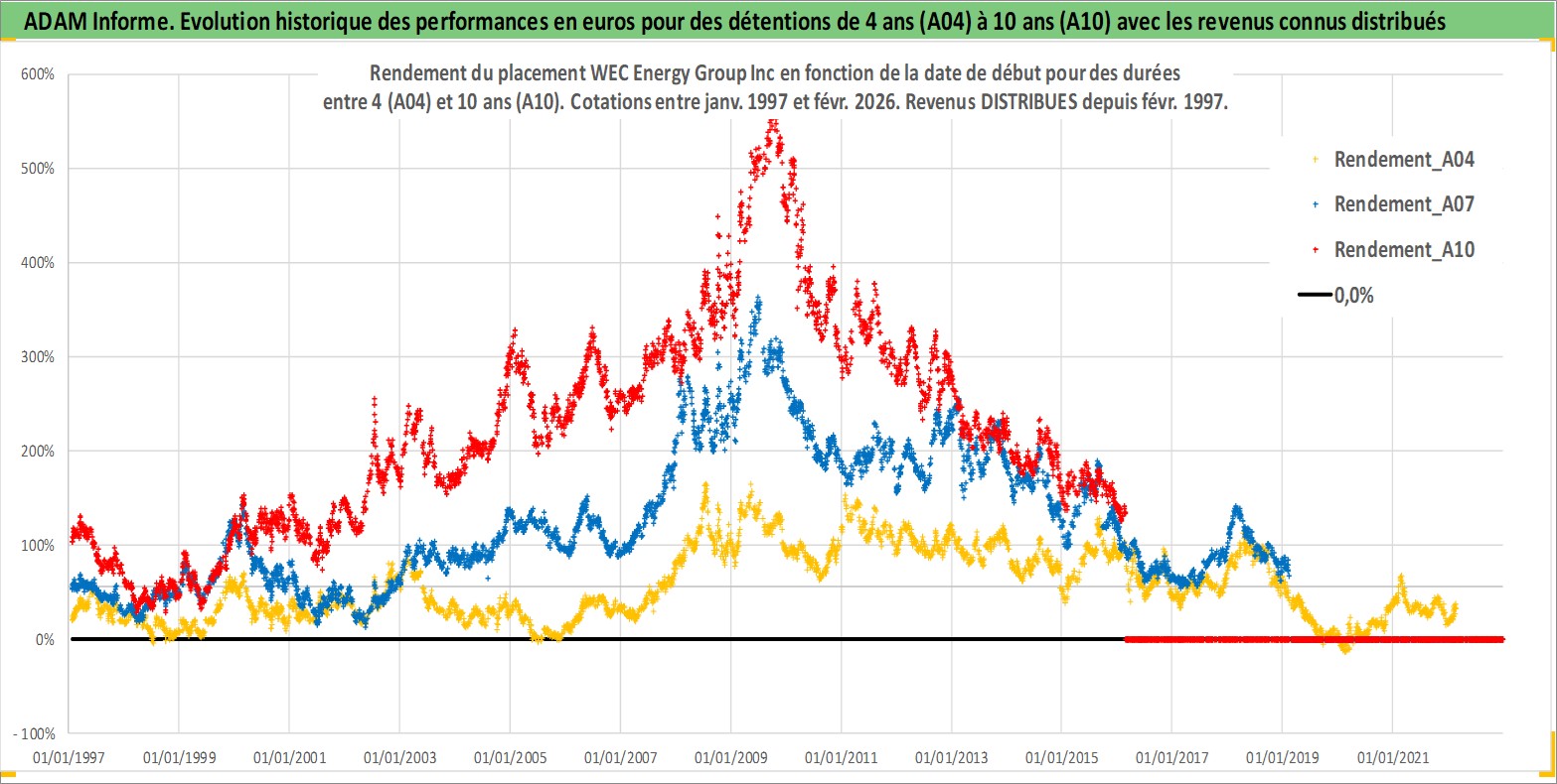 Site dédié aux investisseursPage dédiée sur site financeAnalyse des valorisations hebdomadaires de l'action WEC Energy Group Inc. Cet actif est cote en USD. Les valorisations sont en contrevaleur EURO et couvrent les semaines 1997W01 a 2026W09. Les revenus de cet actif financier sont pris en compte depuis la semaine 1997W07. La note globale ESG de cet actif est estimee a 7.0 (apres rebasage entre 0 et 20).