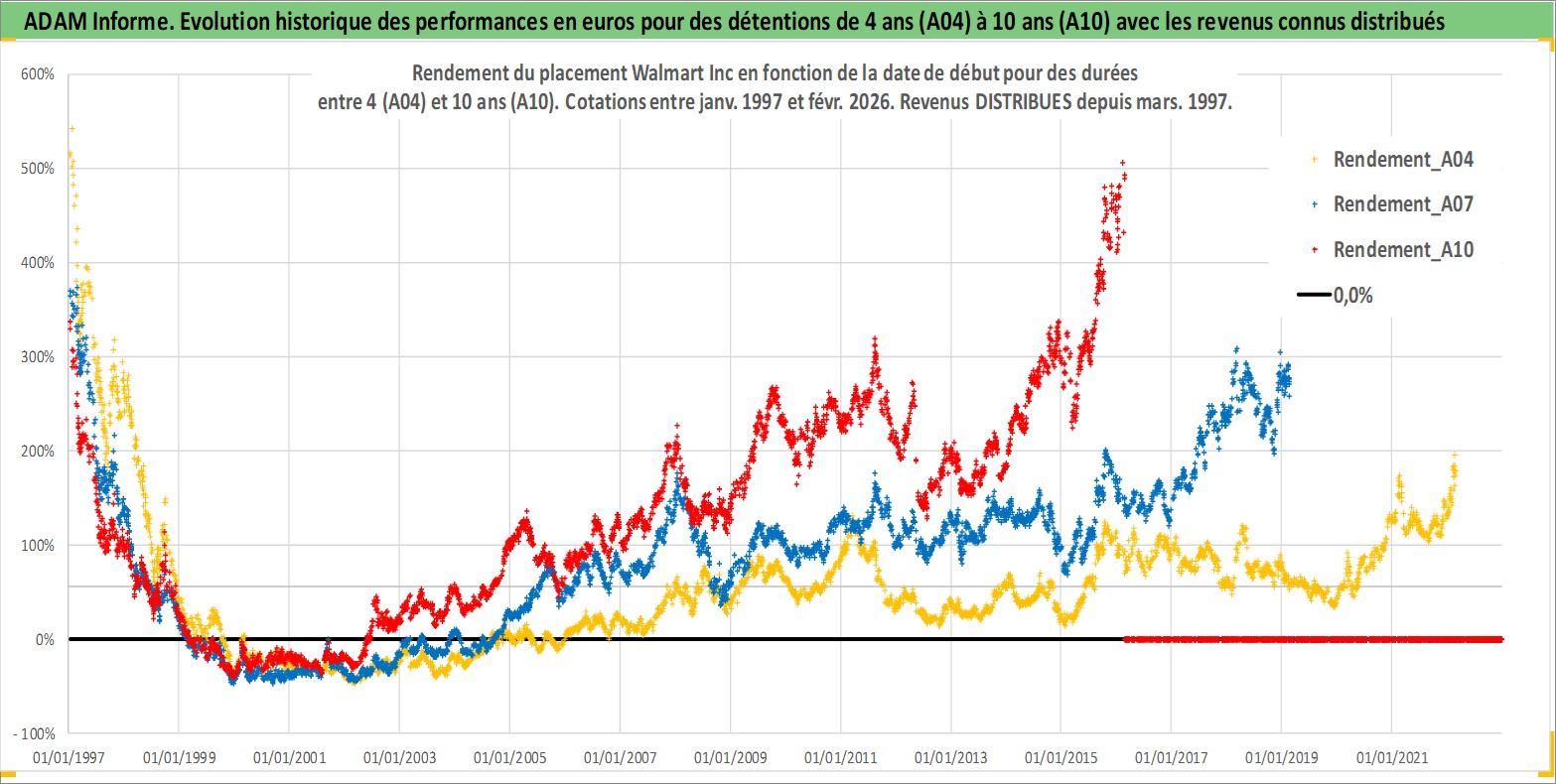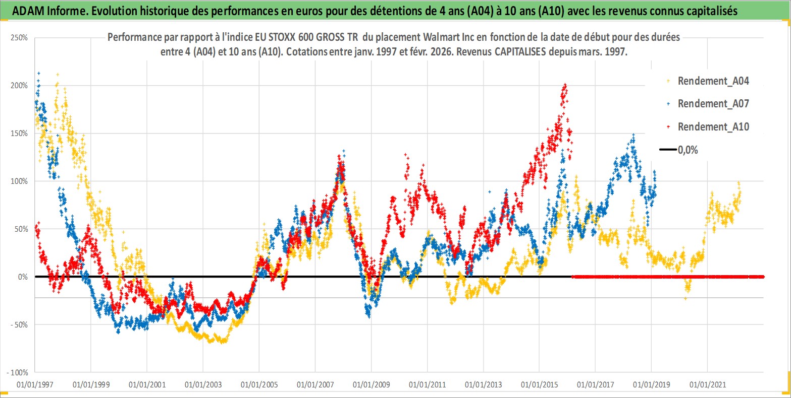 Site dédié aux investisseursPage dédiée sur site financeAnalyse des valorisations hebdomadaires de l'action Walmart Inc. Cet actif est cote en USD. Les valorisations sont en contrevaleur EURO et couvrent les semaines 1997W01 a 2026W09. Les revenus de cet actif financier sont pris en compte depuis la semaine 1997W12. La note globale ESG de cet actif est estimee a 7.0 (apres rebasage entre 0 et 20).