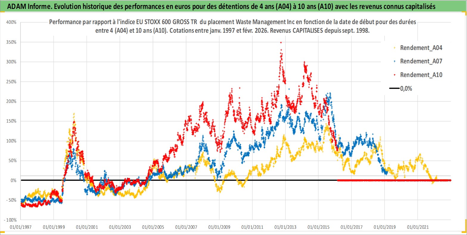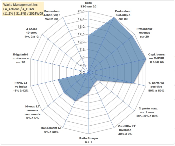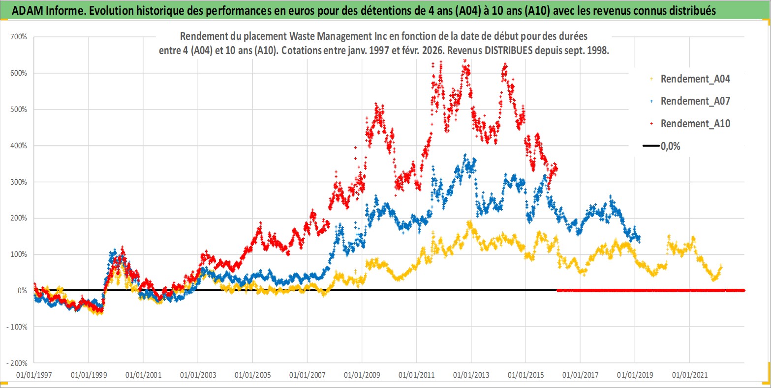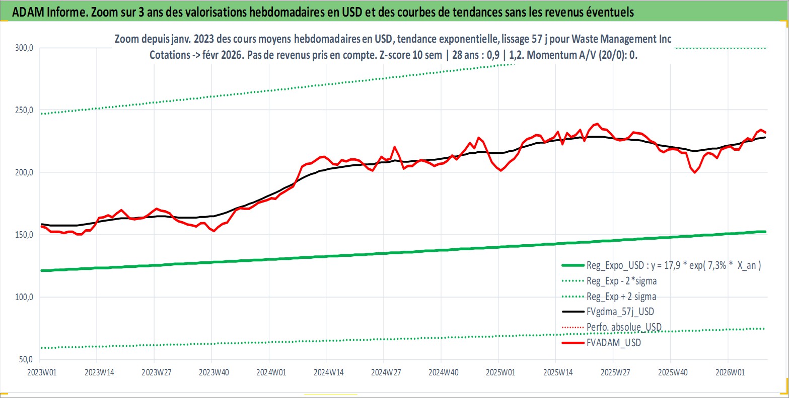 Site dédié aux investisseursPage dédiée sur site financeAnalyse des valorisations hebdomadaires de l'action Waste Management Inc. Cet actif est cote en USD. Les valorisations sont en contrevaleur EURO et couvrent les semaines 1997W01 a 2026W09. Les revenus de cet actif financier sont pris en compte depuis la semaine 1998W40. La note globale ESG de cet actif est estimee a 12.0 (apres rebasage entre 0 et 20).