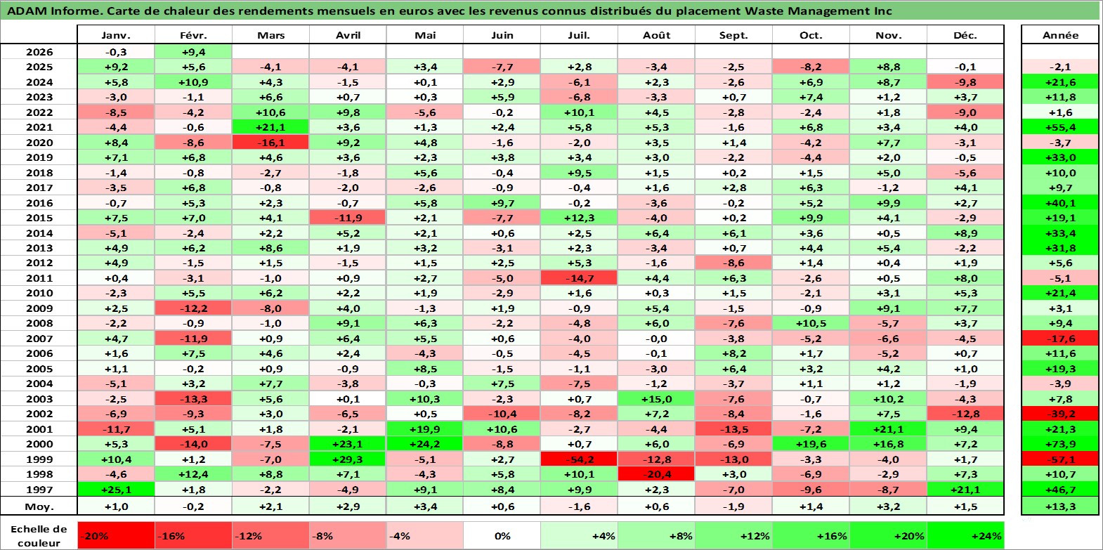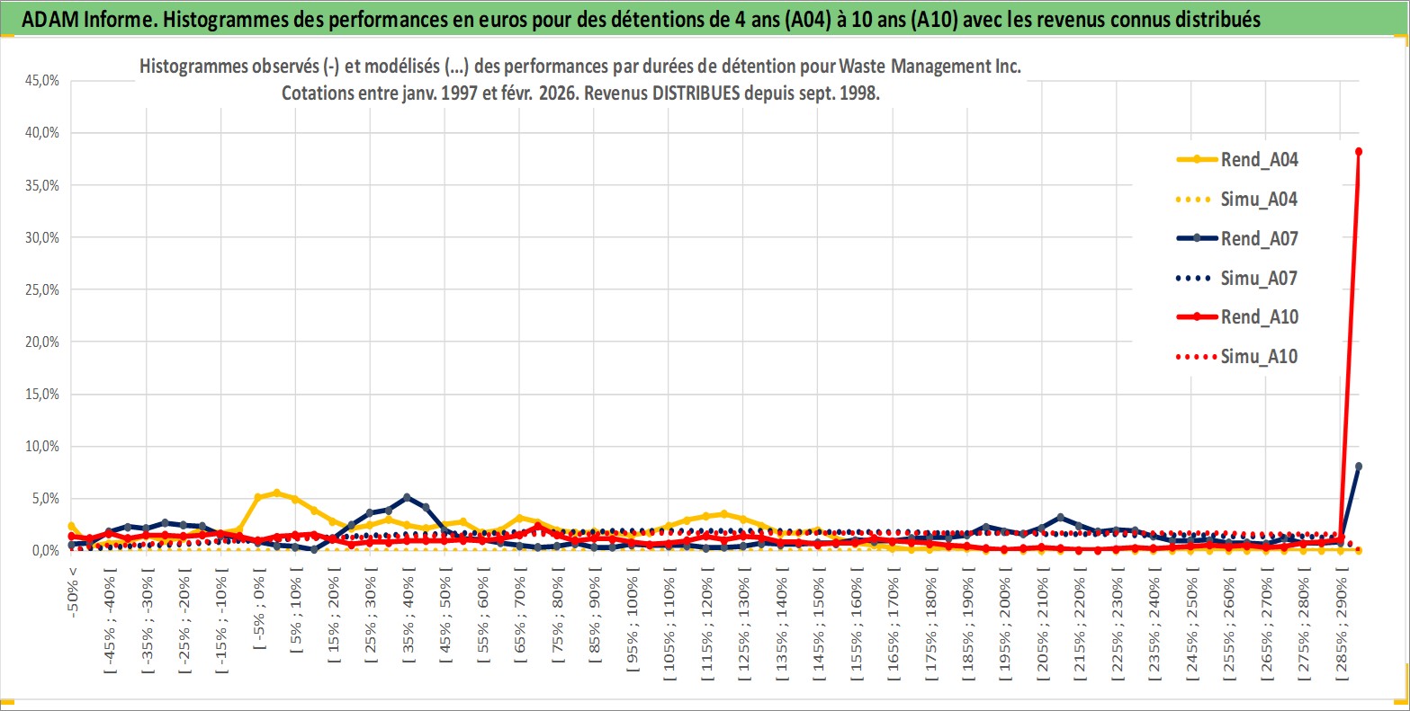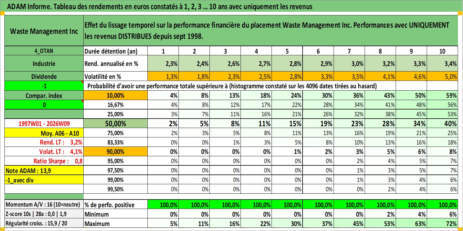 Site dédié aux investisseursPage dédiée sur site financeAnalyse des valorisations hebdomadaires de l'action Waste Management Inc. Cet actif est cote en USD. Les valorisations sont en contrevaleur EURO et couvrent les semaines 1997W01 a 2026W09. Les revenus de cet actif financier sont pris en compte depuis la semaine 1998W40. La note globale ESG de cet actif est estimee a 12.0 (apres rebasage entre 0 et 20).