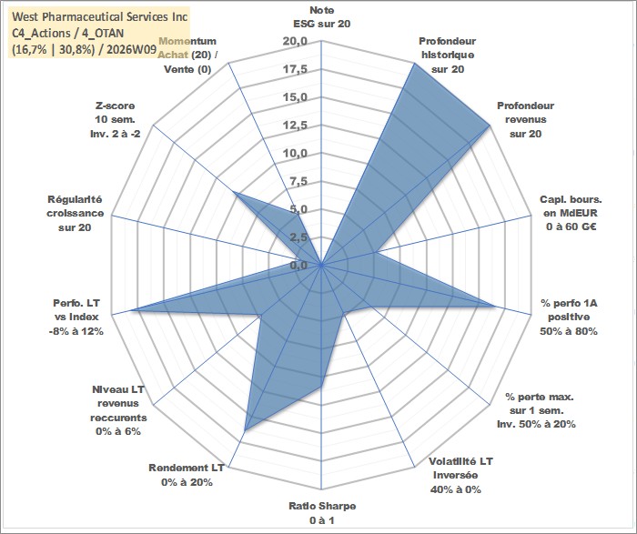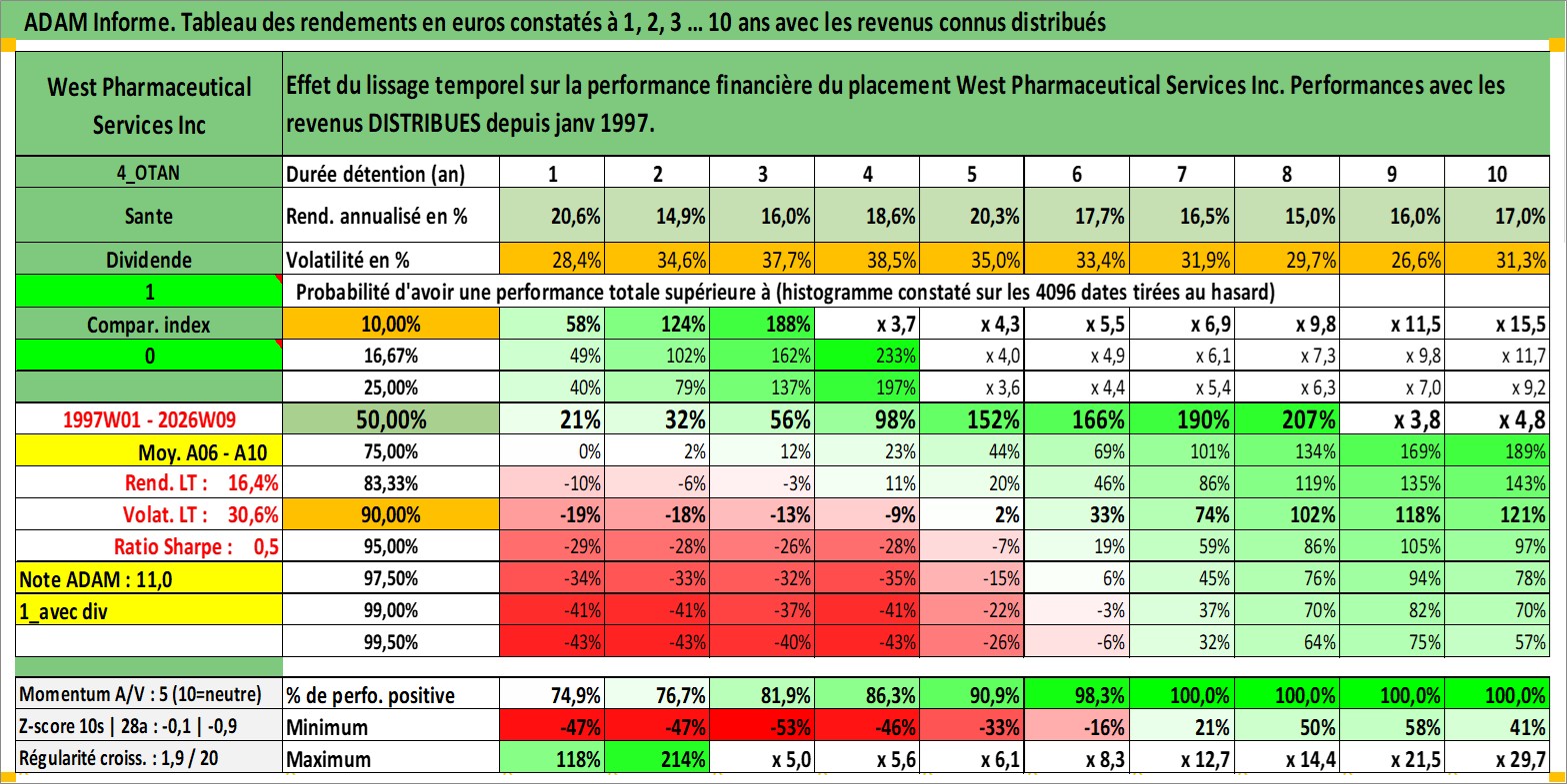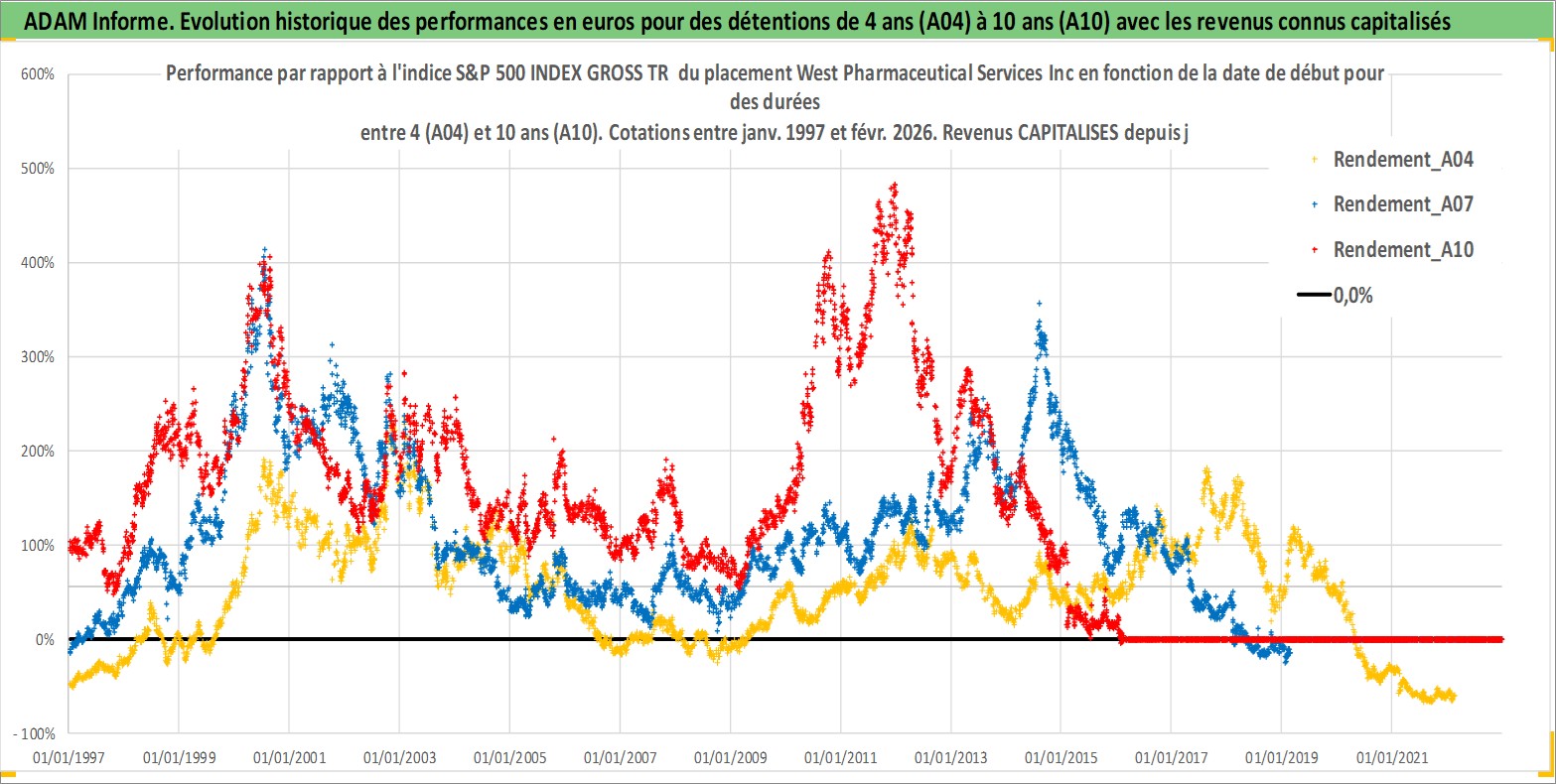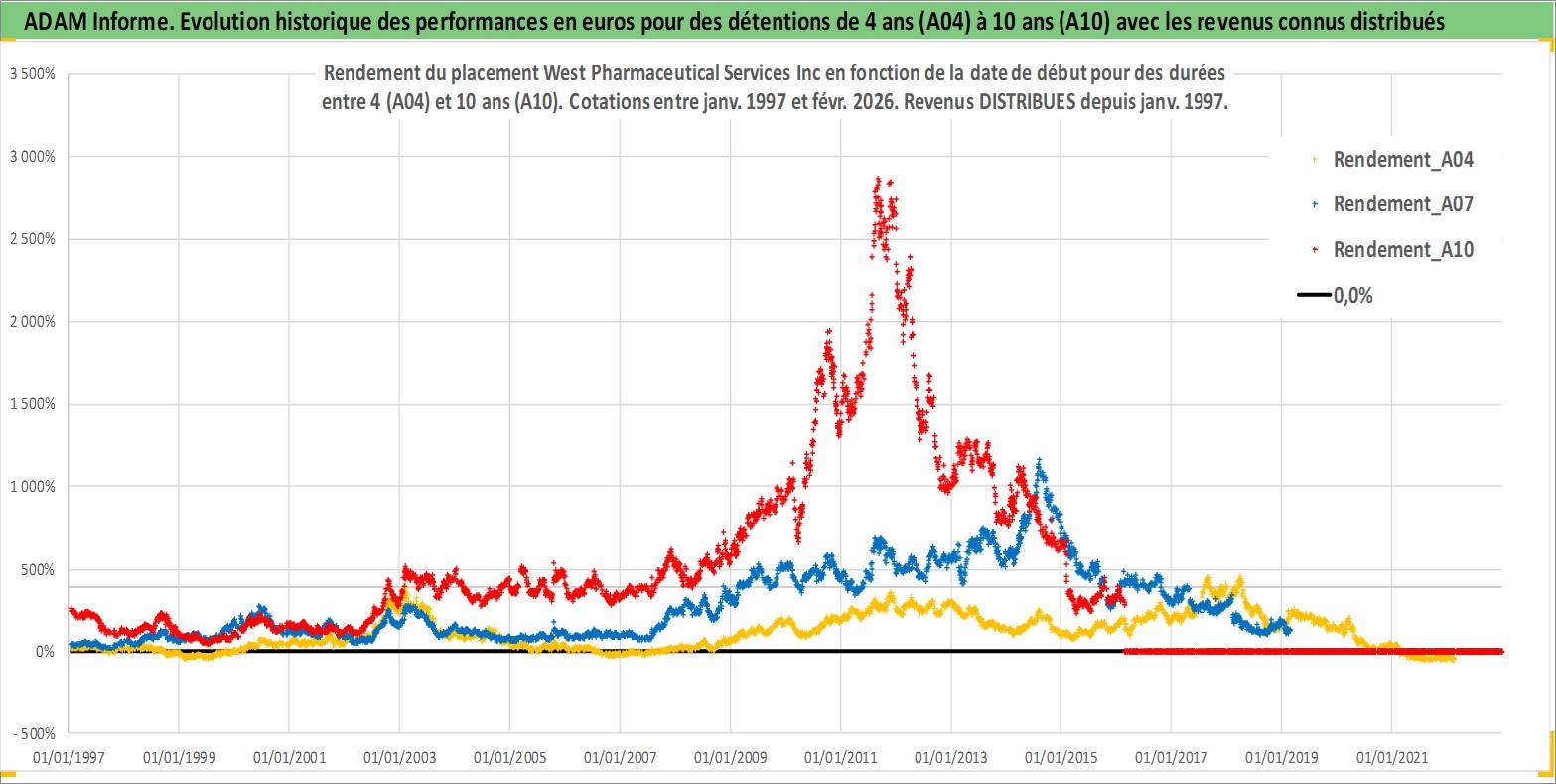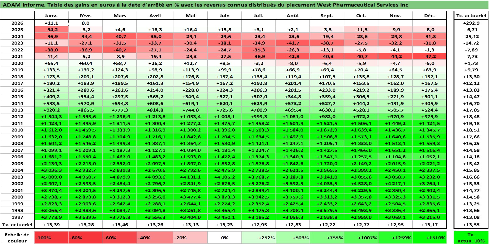 Site dédié aux investisseursPage dédiée sur site financeAnalyse des valorisations hebdomadaires de l'action West Pharmaceutical Services Inc. Cet actif est cote en USD. Les valorisations sont en contrevaleur EURO et couvrent les semaines 1997W01 a 2026W09. Les revenus de cet actif financier sont pris en compte depuis la semaine 1997W03. La note ESG de cet actif n'est pas connue.