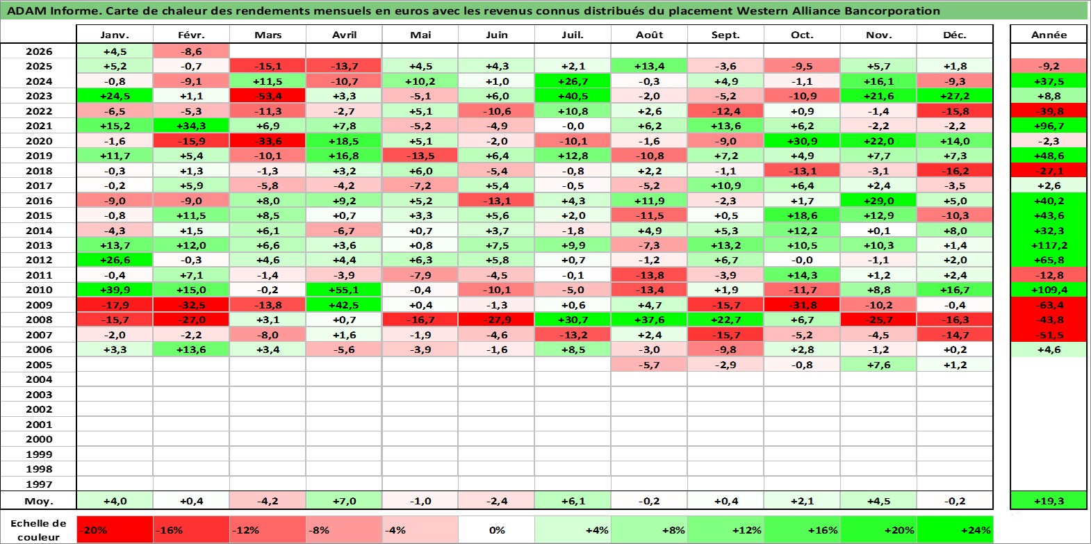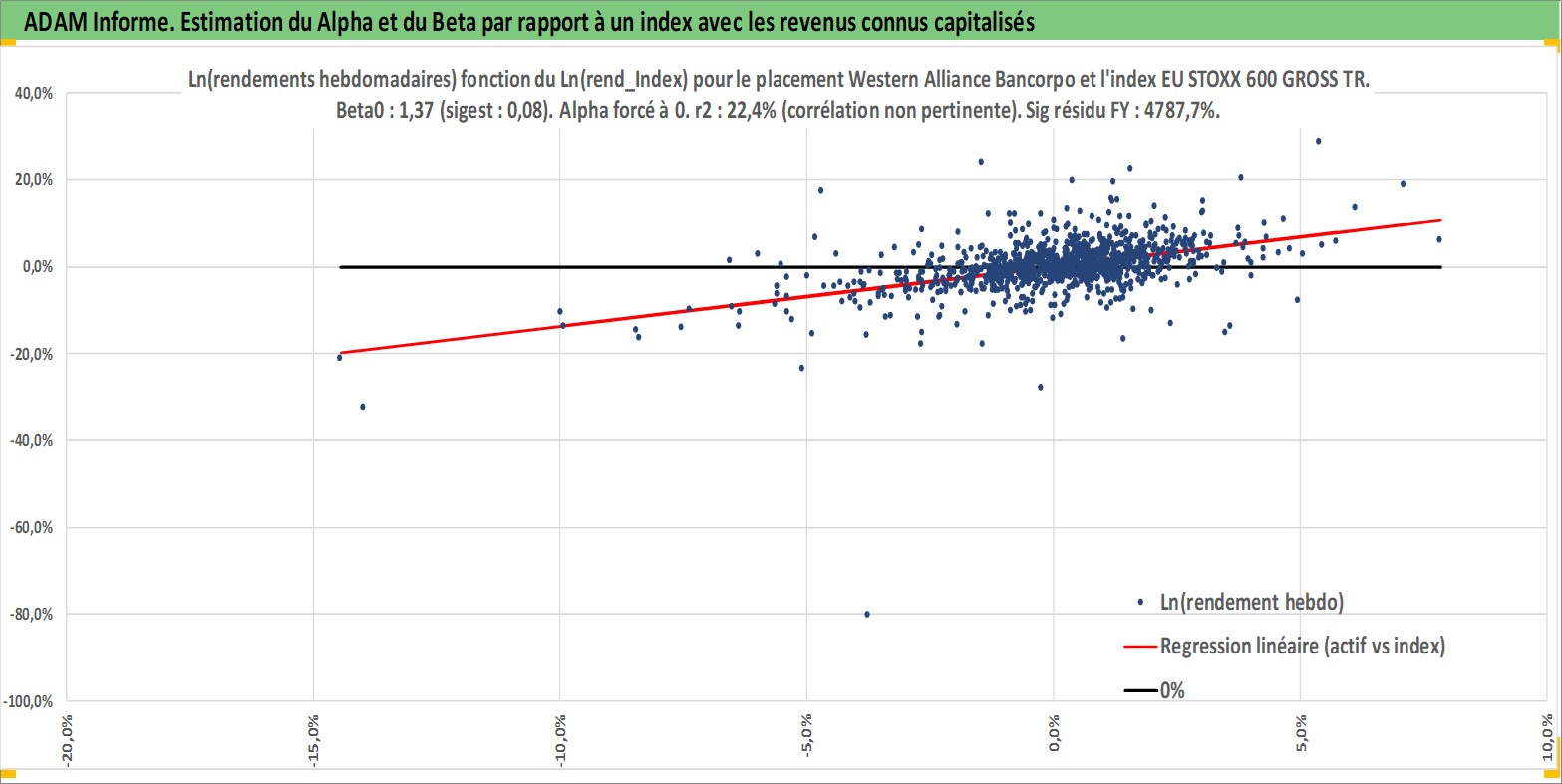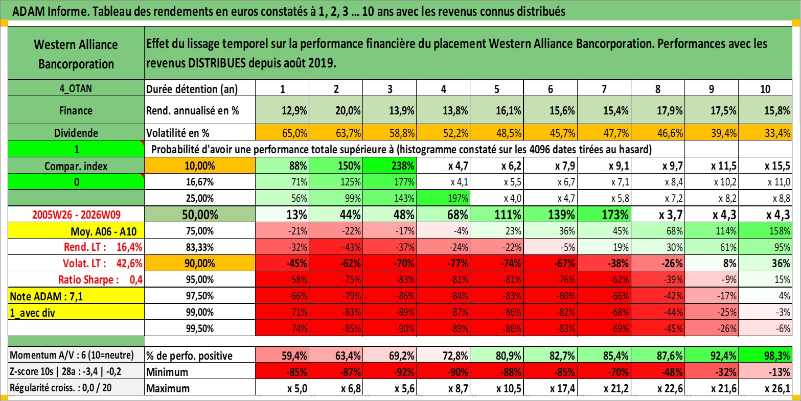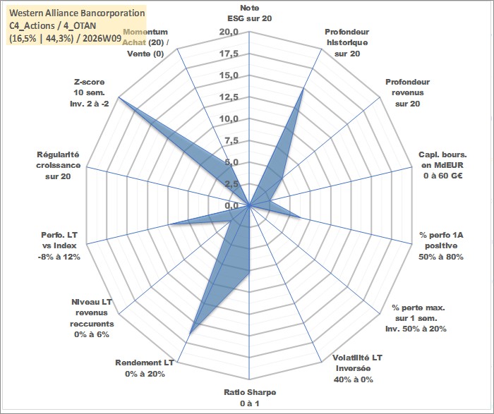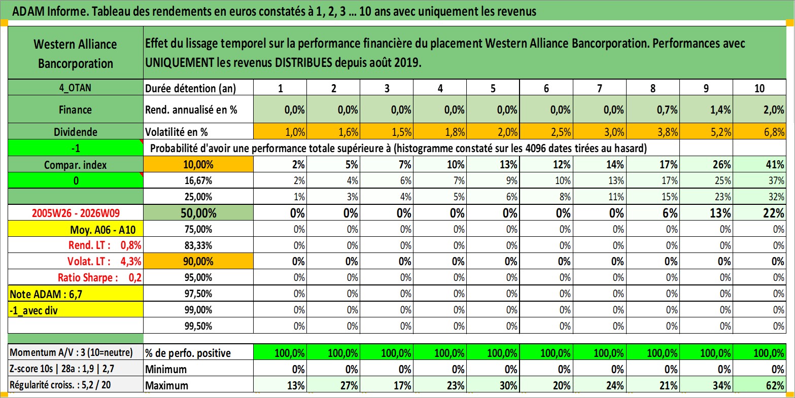 Site dédié aux investisseursPage dédiée sur site financeAnalyse des valorisations hebdomadaires de l'action Western Alliance Bancorporation. Cet actif est cote en USD. Les valorisations sont en contrevaleur EURO et couvrent les semaines 2005W26 a 2026W09. Les revenus de cet actif financier sont pris en compte depuis la semaine 2019W33. La note ESG de cet actif n'est pas connue.