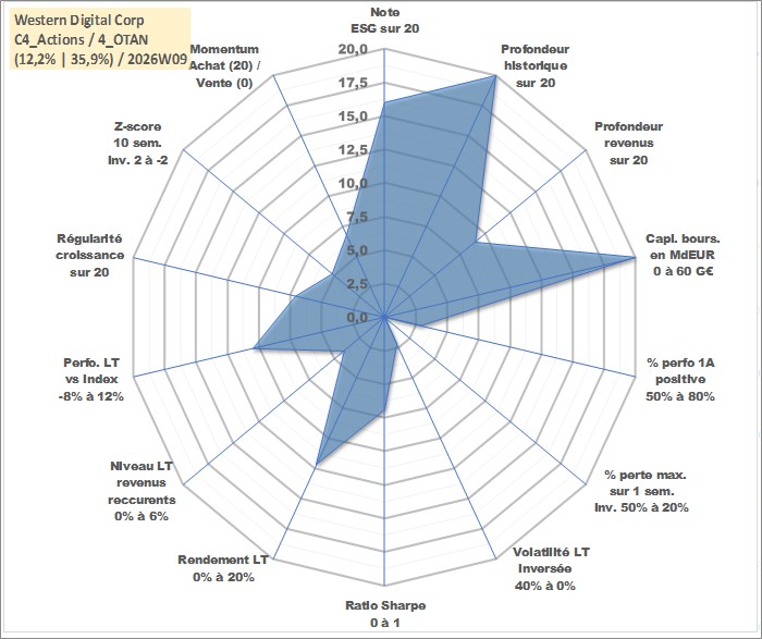 Site dédié aux investisseursPage dédiée sur site financeAnalyse des valorisations hebdomadaires de l'action Western Digital Corp. Cet actif est cote en USD. Les valorisations sont en contrevaleur EURO et couvrent les semaines 1997W01 a 2026W09. Les revenus de cet actif financier sont pris en compte depuis la semaine 2012W39. La note globale ESG de cet actif est estimee a 16.0 (apres rebasage entre 0 et 20).
