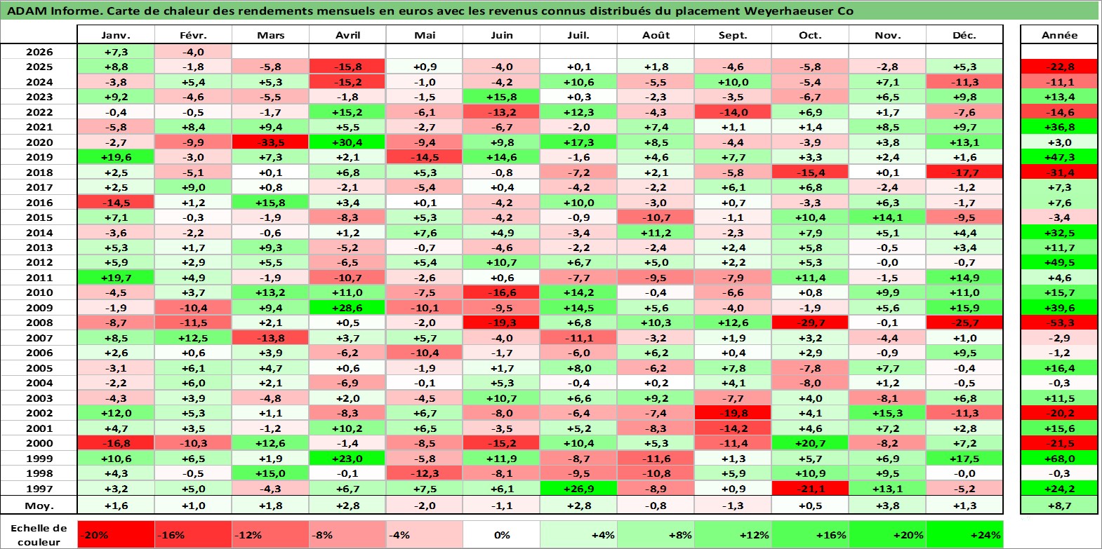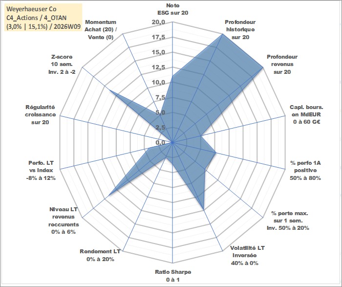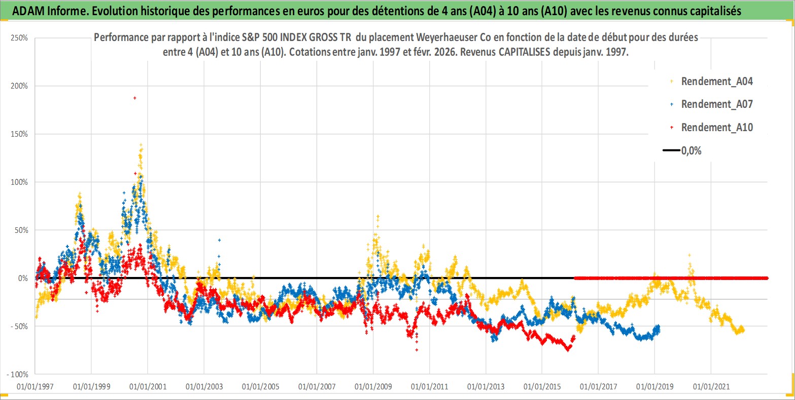 Site dédié aux investisseursPage dédiée sur site financeAnalyse des valorisations hebdomadaires de l'action Weyerhaeuser Co. Cet actif est cote en USD. Les valorisations sont en contrevaleur EURO et couvrent les semaines 1997W01 a 2026W09. Les revenus de cet actif financier sont pris en compte depuis la semaine 1997W05. La note globale ESG de cet actif est estimee a 11.0 (apres rebasage entre 0 et 20).