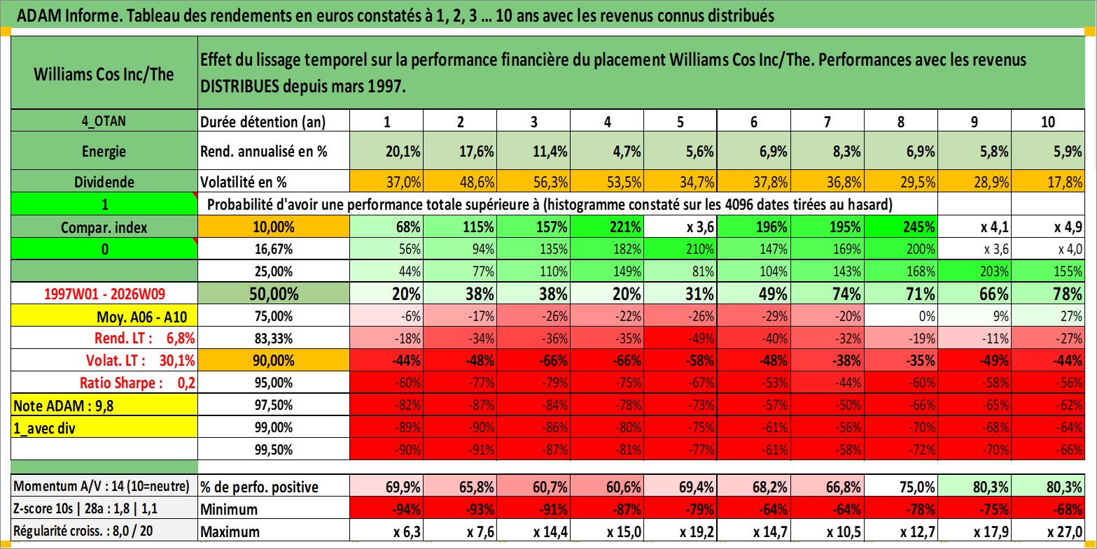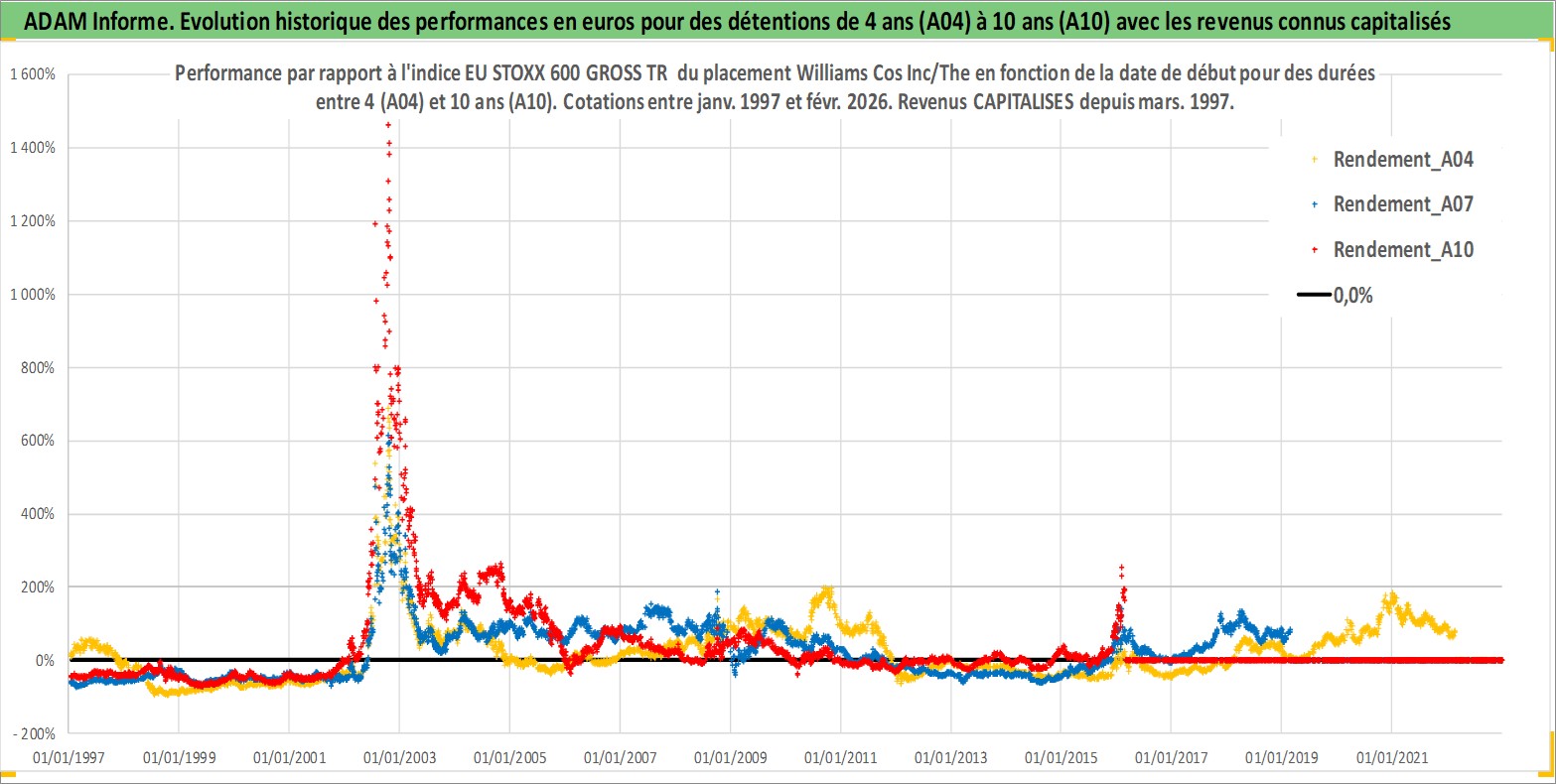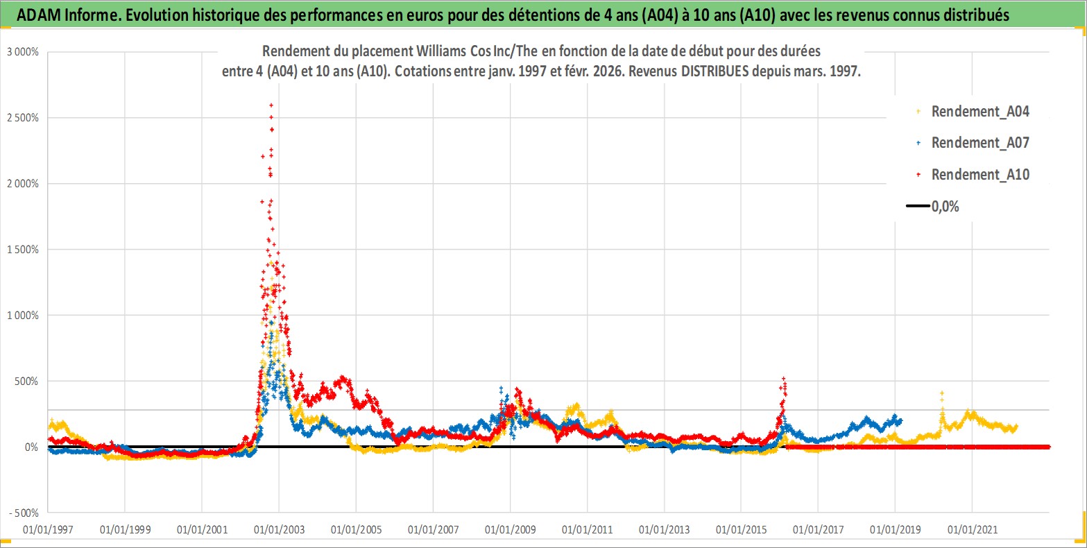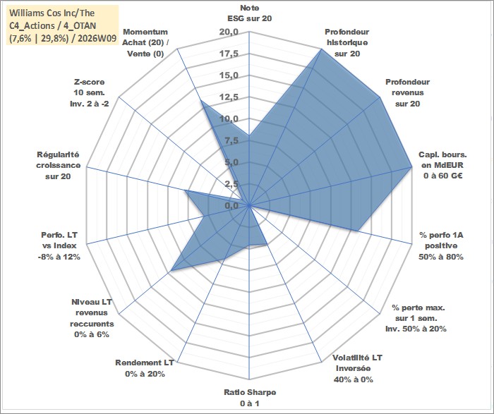 Site dédié aux investisseursPage dédiée sur site financeAnalyse des valorisations hebdomadaires de l'action Williams Cos Inc/The. Cet actif est cote en USD. Les valorisations sont en contrevaleur EURO et couvrent les semaines 1997W01 a 2026W09. Les revenus de cet actif financier sont pris en compte depuis la semaine 1997W10. La note globale ESG de cet actif est estimee a 8.0 (apres rebasage entre 0 et 20).