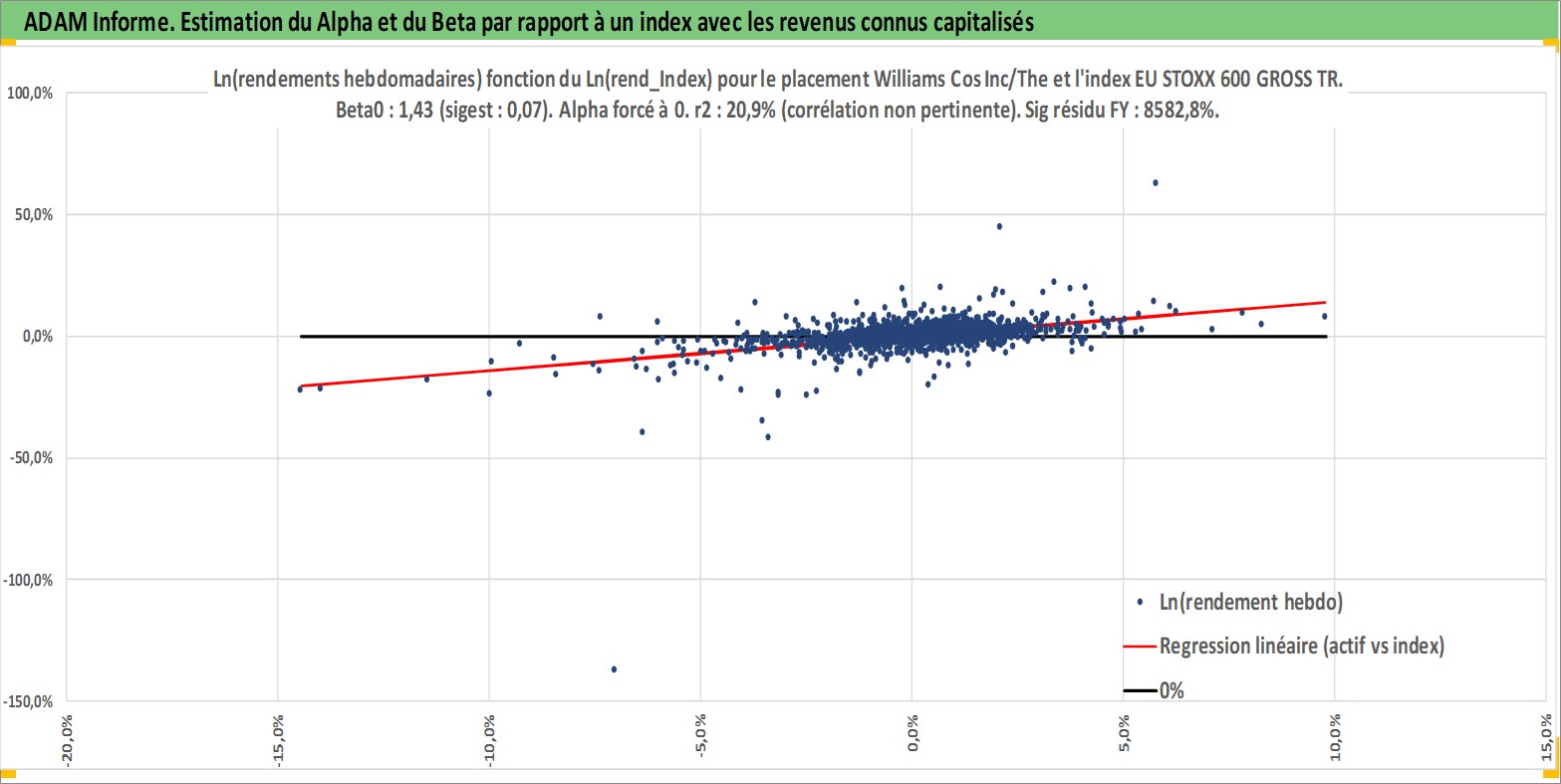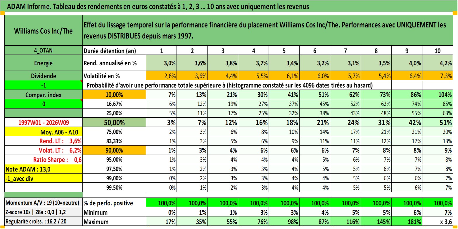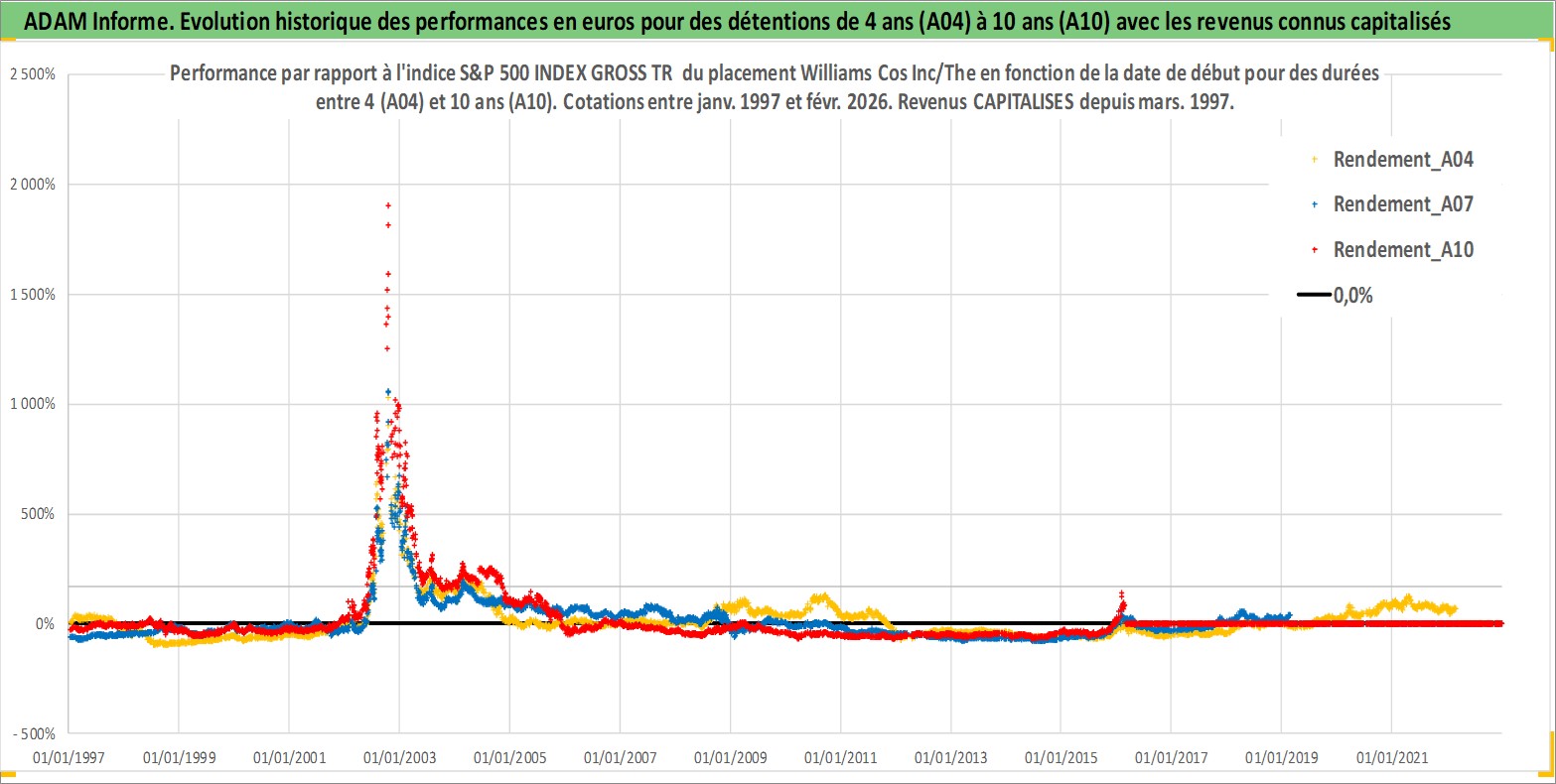 Site dédié aux investisseursPage dédiée sur site financeAnalyse des valorisations hebdomadaires de l'action Williams Cos Inc/The. Cet actif est cote en USD. Les valorisations sont en contrevaleur EURO et couvrent les semaines 1997W01 a 2026W09. Les revenus de cet actif financier sont pris en compte depuis la semaine 1997W10. La note globale ESG de cet actif est estimee a 8.0 (apres rebasage entre 0 et 20).