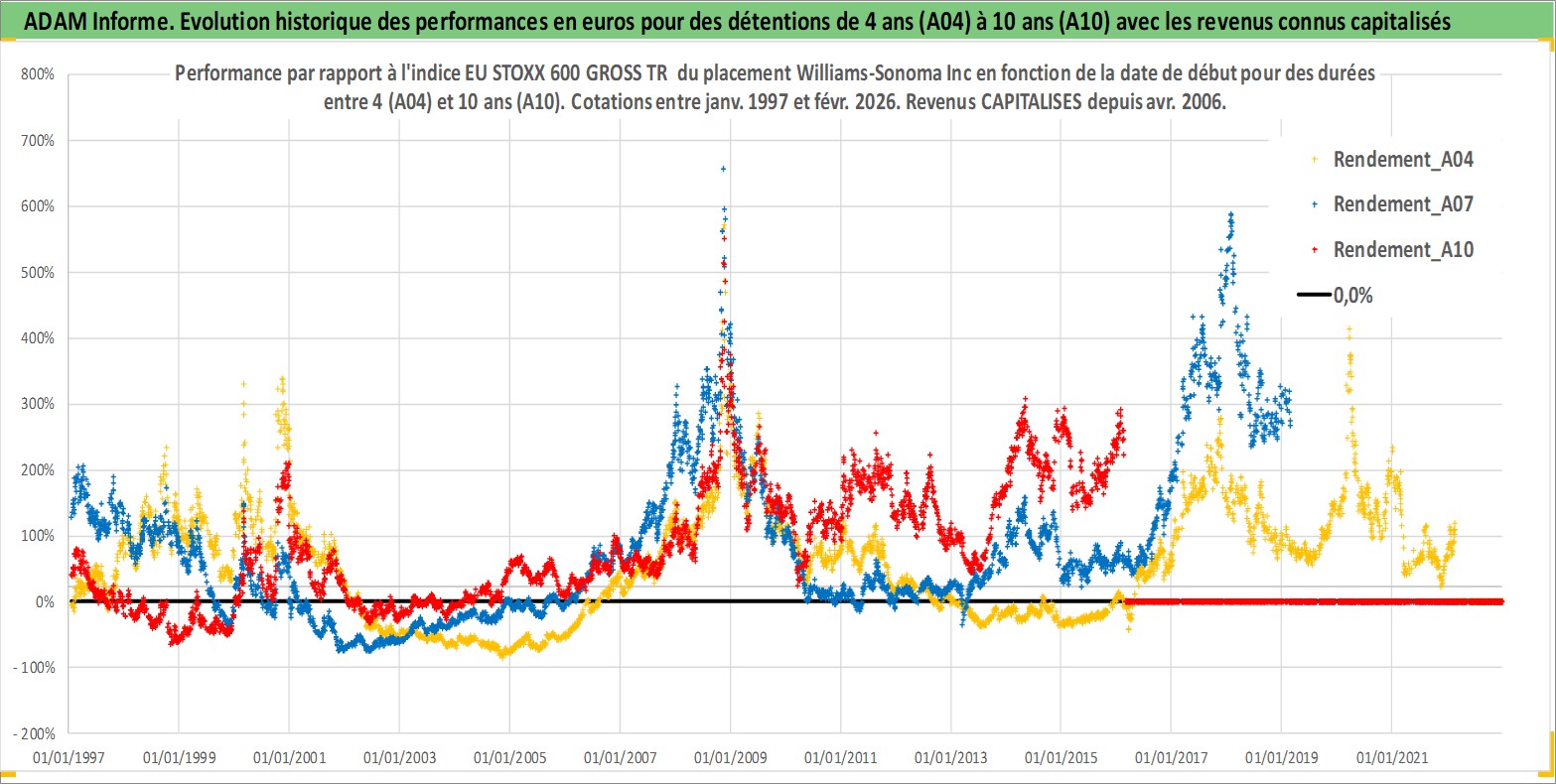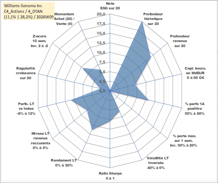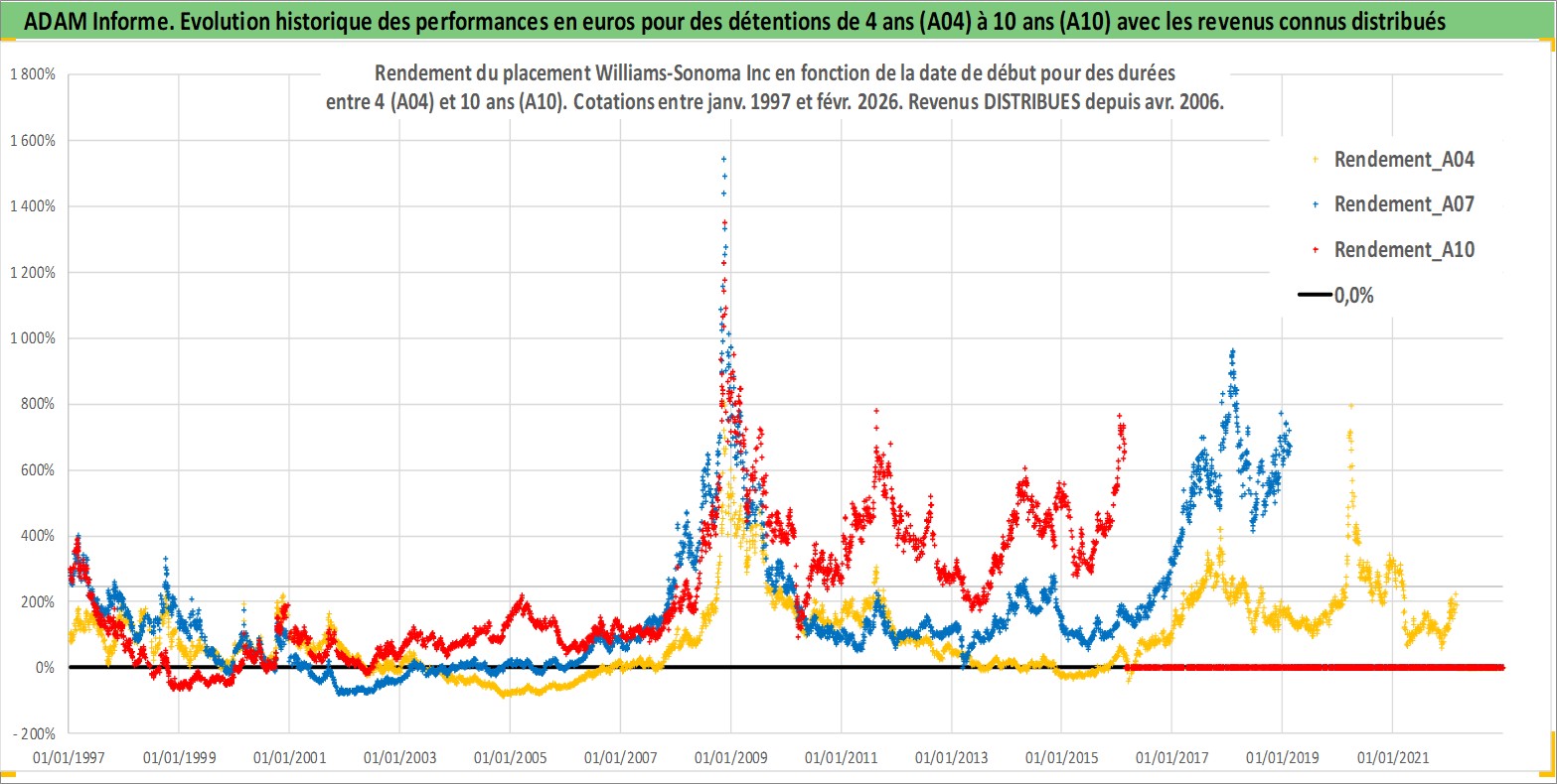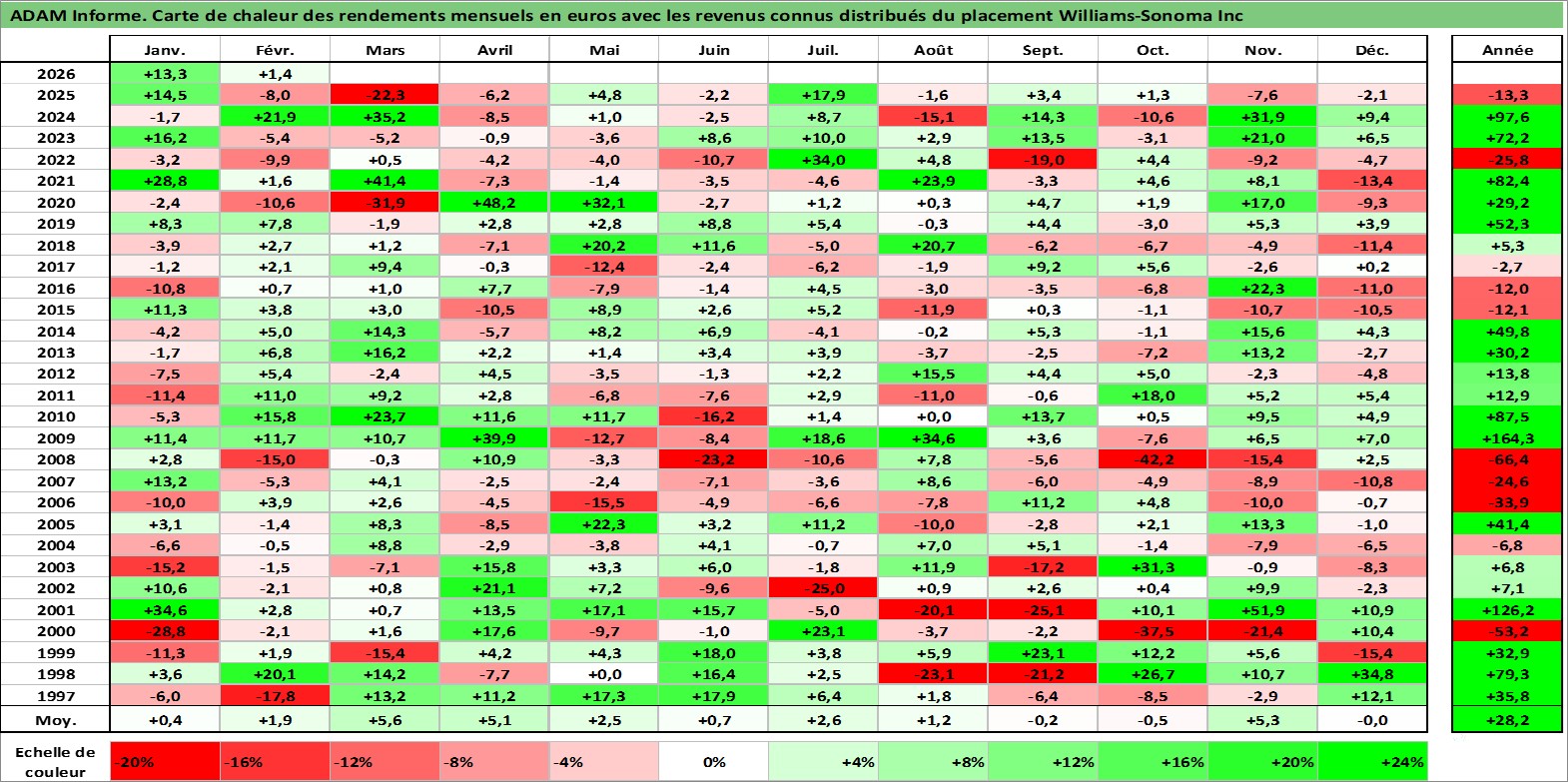 Site dédié aux investisseursPage dédiée sur site financeAnalyse des valorisations hebdomadaires de l'action Williams-Sonoma Inc. Cet actif est cote en USD. Les valorisations sont en contrevaleur EURO et couvrent les semaines 1997W01 a 2026W09. Les revenus de cet actif financier sont pris en compte depuis la semaine 2006W17. La note ESG de cet actif n'est pas connue.
