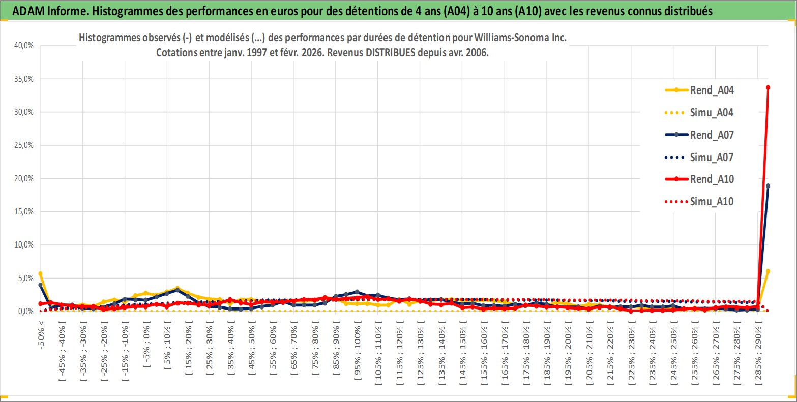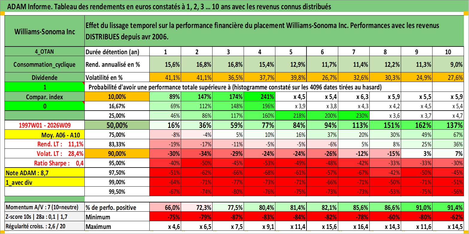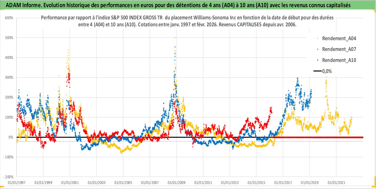 Site dédié aux investisseursPage dédiée sur site financeAnalyse des valorisations hebdomadaires de l'action Williams-Sonoma Inc. Cet actif est cote en USD. Les valorisations sont en contrevaleur EURO et couvrent les semaines 1997W01 a 2026W09. Les revenus de cet actif financier sont pris en compte depuis la semaine 2006W17. La note ESG de cet actif n'est pas connue.