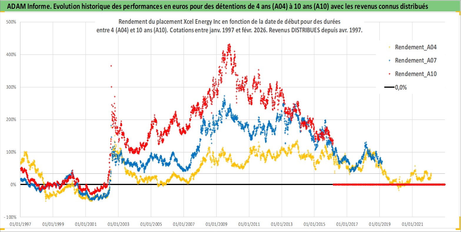 Site dédié aux investisseursPage dédiée sur site financeAnalyse des valorisations hebdomadaires de l'action Xcel Energy Inc. Cet actif est cote en USD. Les valorisations sont en contrevaleur EURO et couvrent les semaines 1997W01 a 2026W09. Les revenus de cet actif financier sont pris en compte depuis la semaine 1997W15. La note globale ESG de cet actif est estimee a 8.0 (apres rebasage entre 0 et 20).