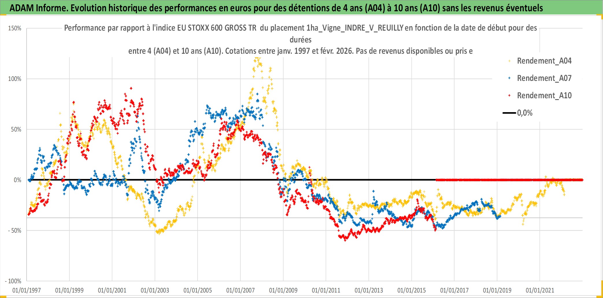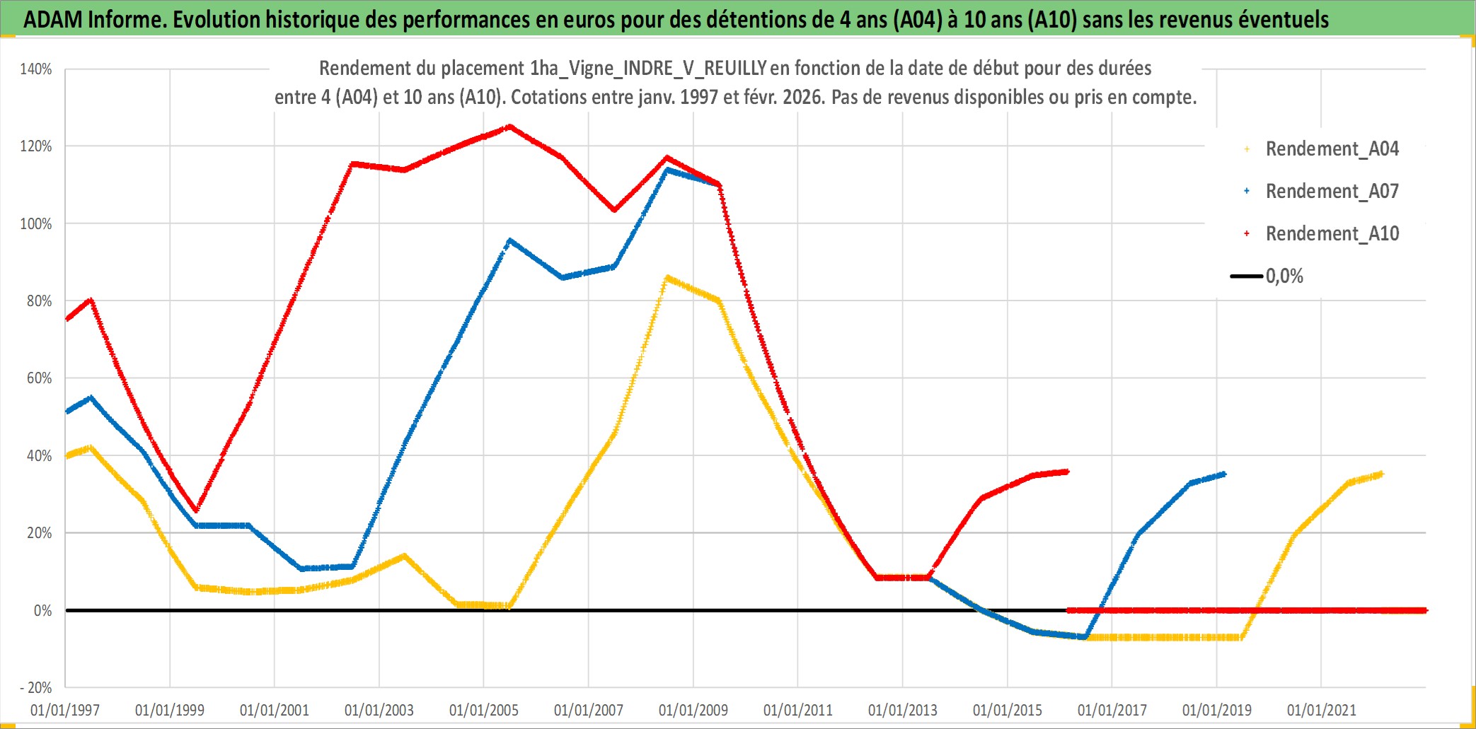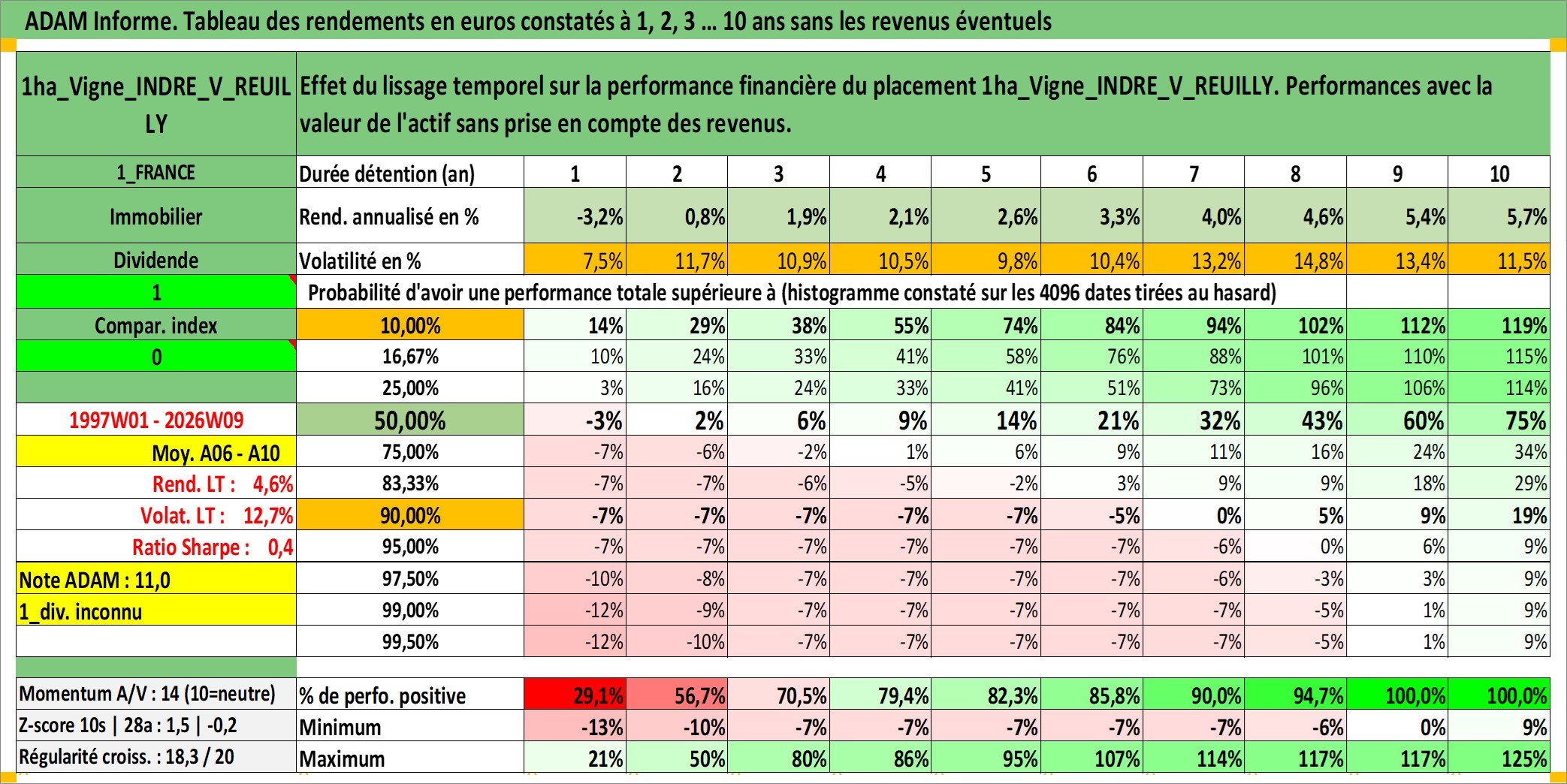 Site dédié aux investisseursPage dédiée sur site financeAnalyse des valorisations hebdomadaires de l'actif 1ha_Vigne_INDRE_V_REUILLY. Cet actif est cote en EUR. Les valorisations couvrent les semaines 1997W01 a 2026W09. Les fermages de ce bien foncier sont pris egaux a 2,5% annuels de la valeur venale du bien.