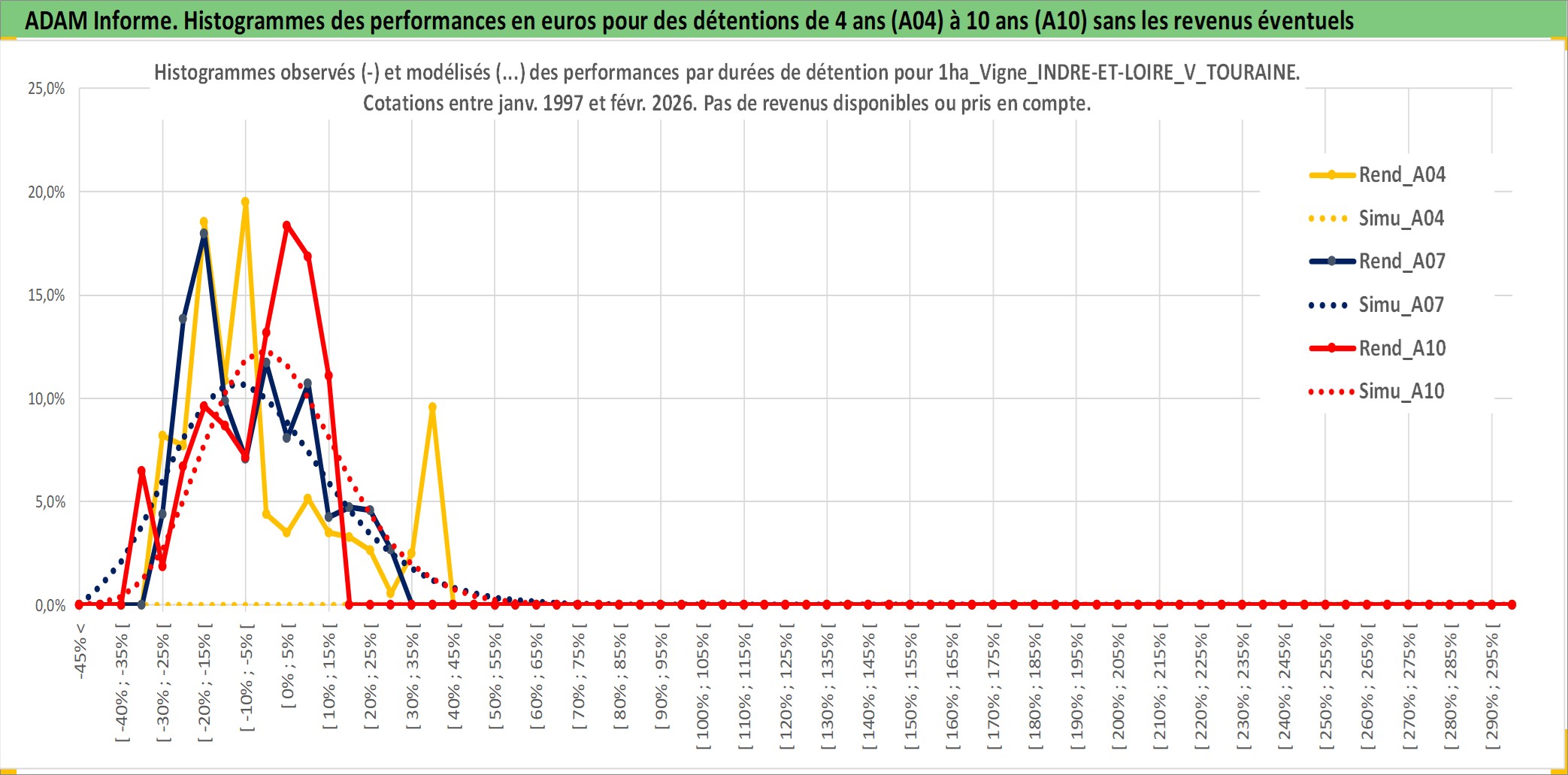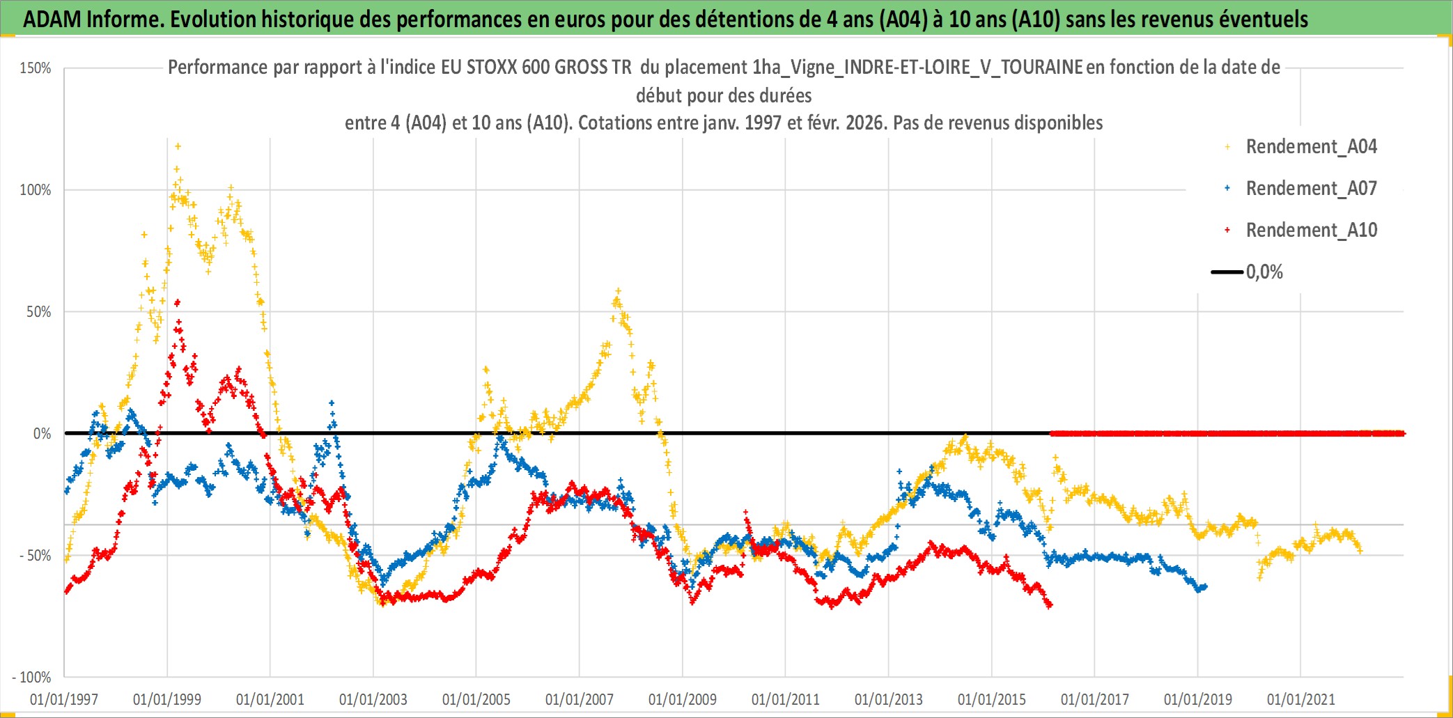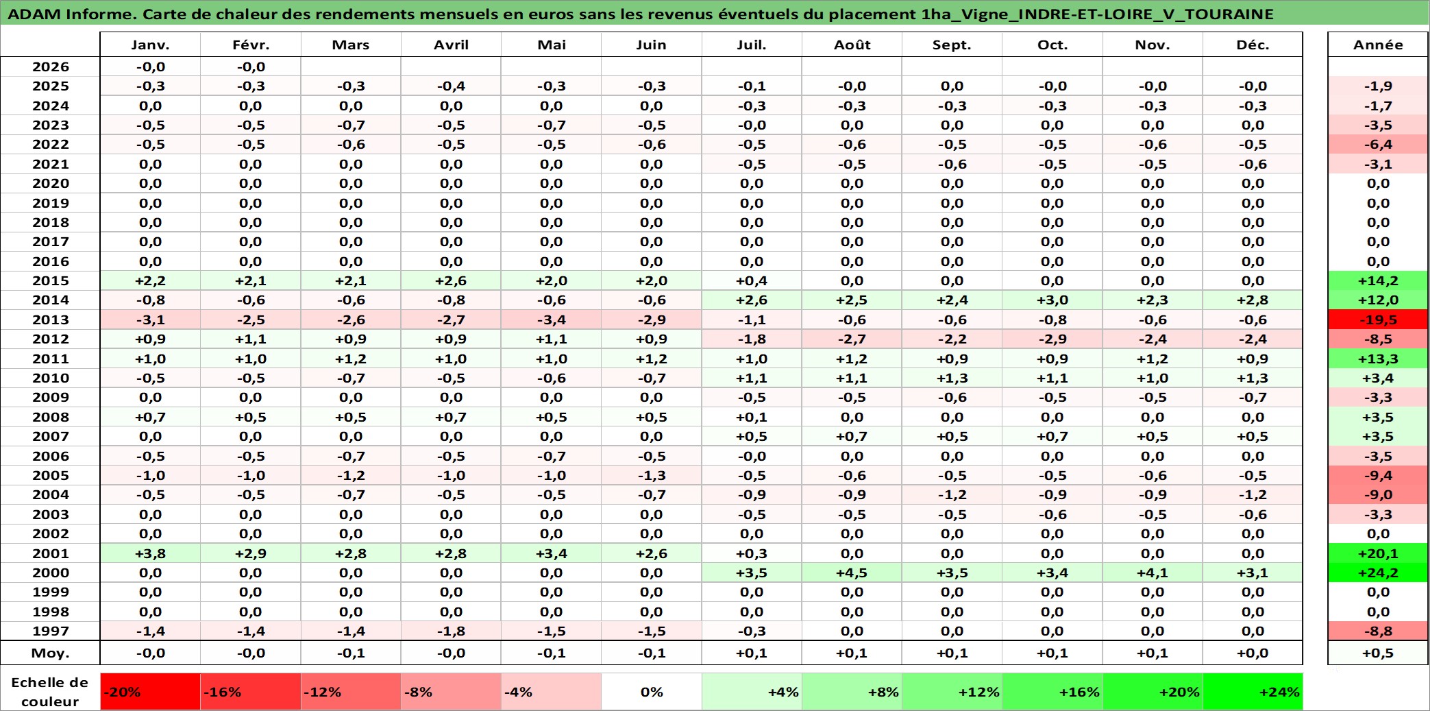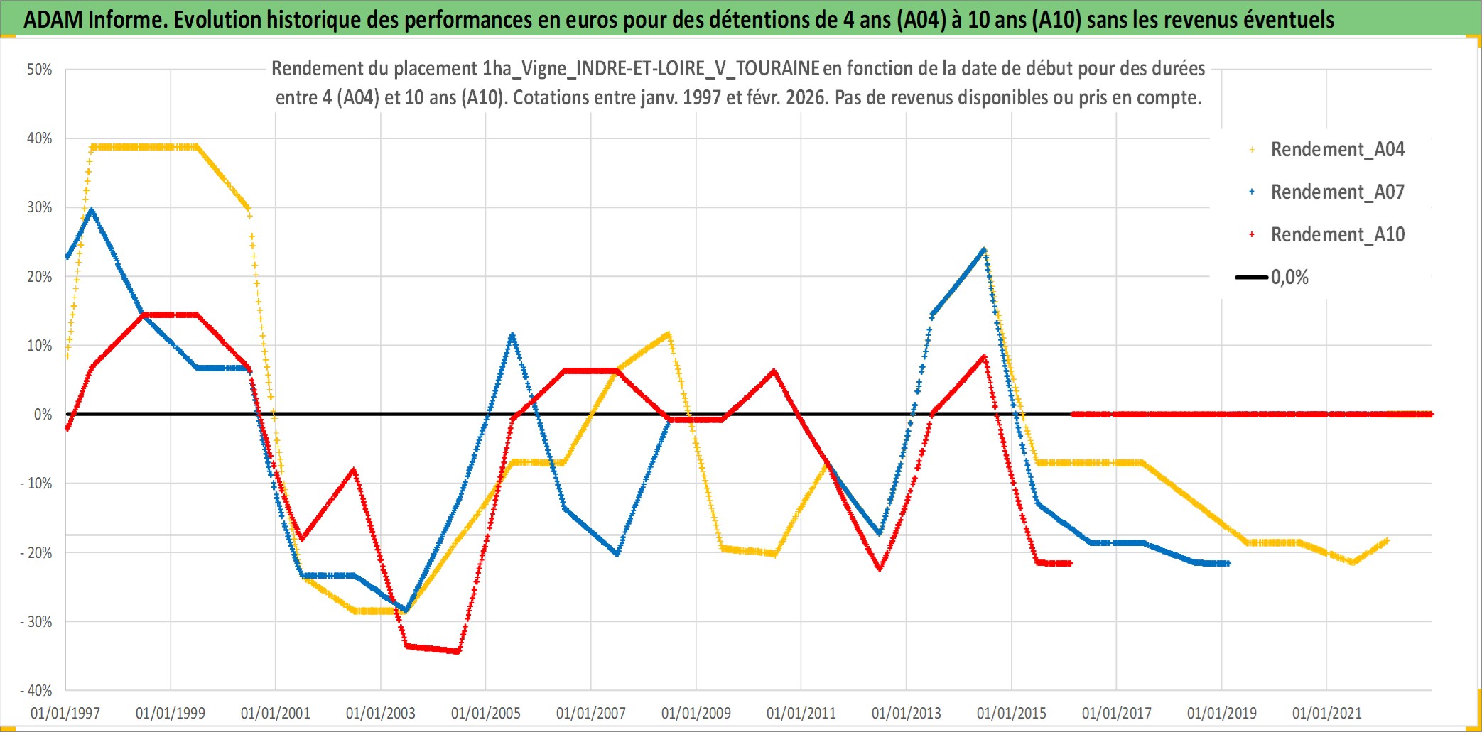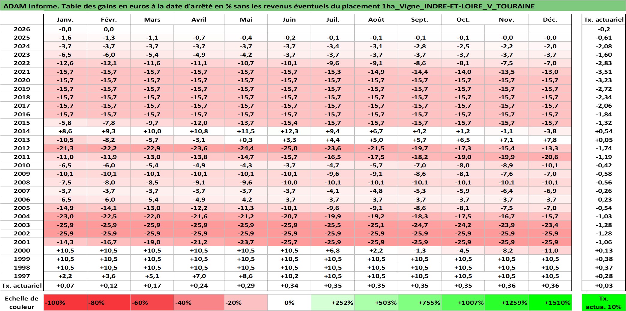 Site dédié aux investisseursPage dédiée sur site financeAnalyse des valorisations hebdomadaires de l'actif 1ha_Vigne_INDRE-ET-LOIRE_V_TOURAINE. Cet actif est cote en EUR. Les valorisations couvrent les semaines 1997W01 a 2026W09. Les fermages de ce bien foncier sont pris egaux a 2,5% annuels de la valeur venale du bien.