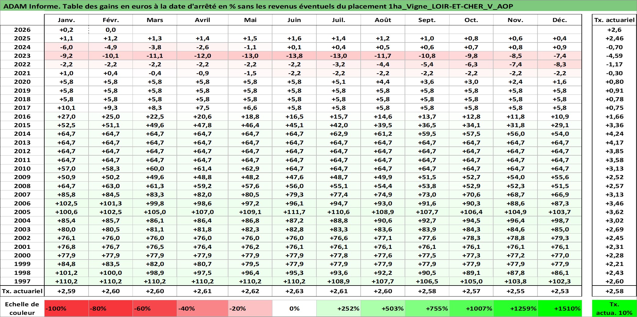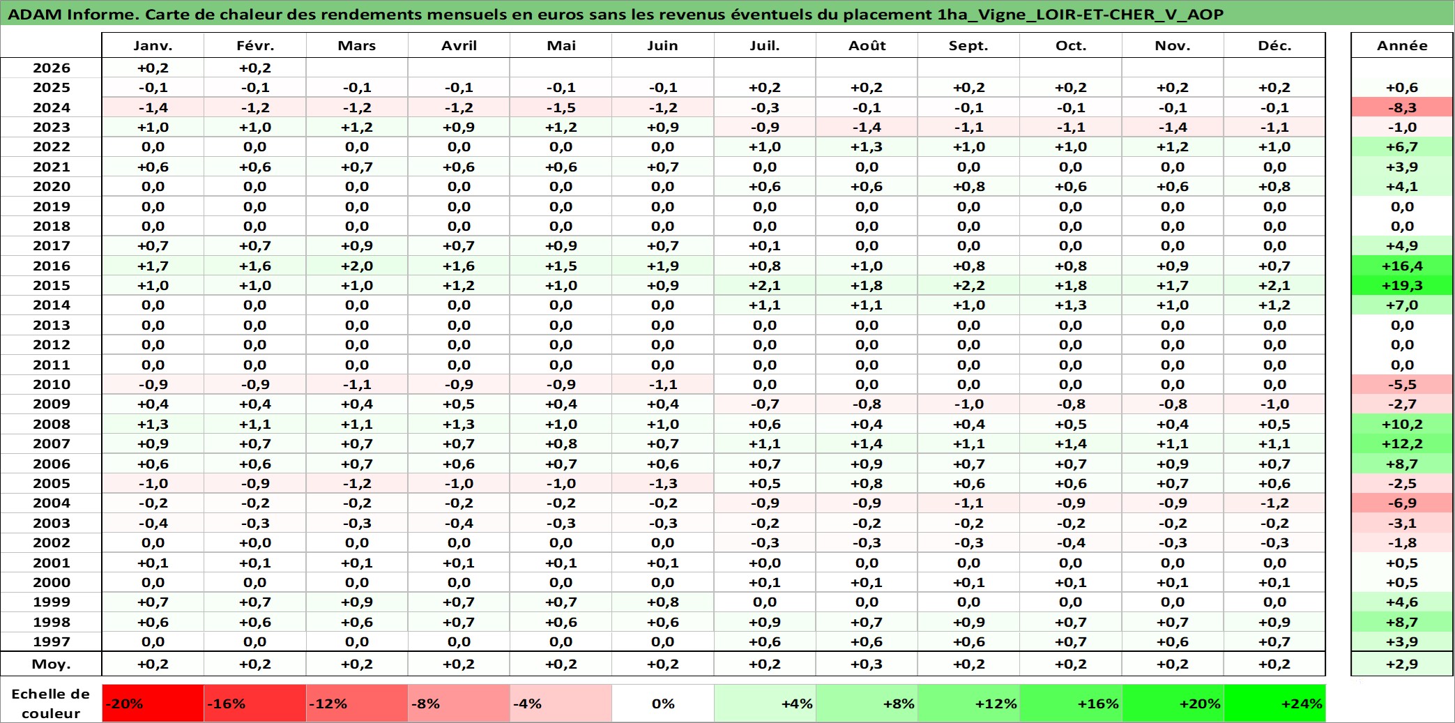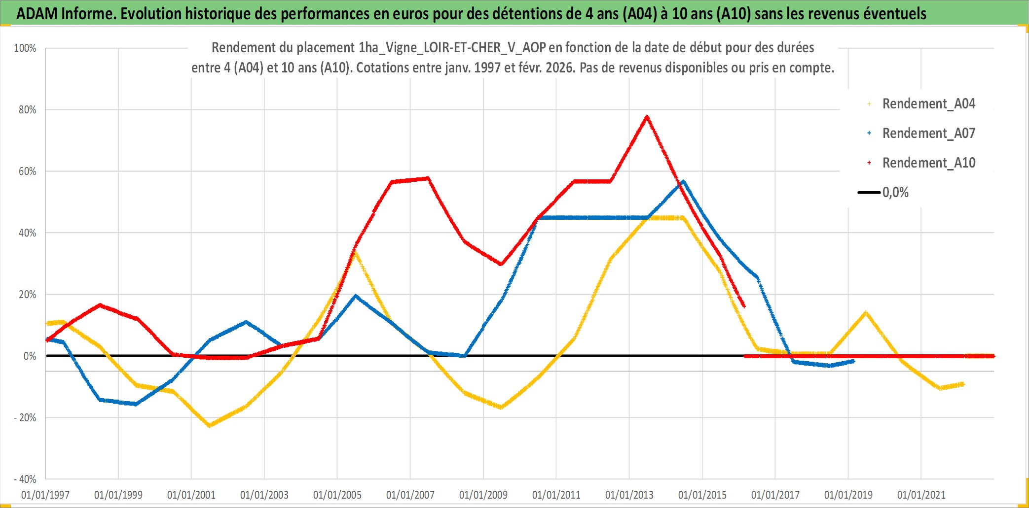 Site dédié aux investisseursPage dédiée sur site financeAnalyse des valorisations hebdomadaires de l'actif 1ha_Vigne_LOIR-ET-CHER_V_AOP. Cet actif est cote en EUR. Les valorisations couvrent les semaines 1997W01 a 2026W09. Les fermages de ce bien foncier sont pris egaux a 2,5% annuels de la valeur venale du bien.