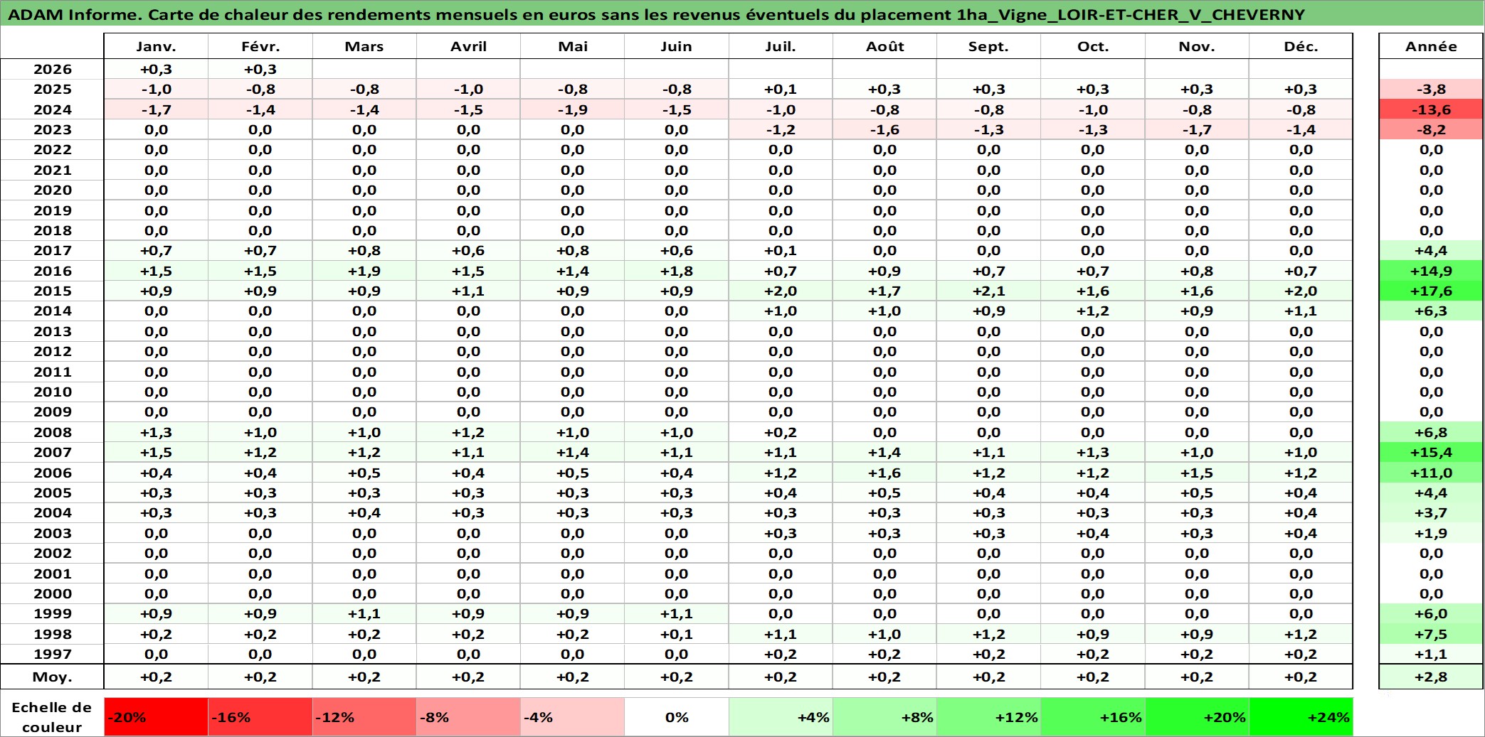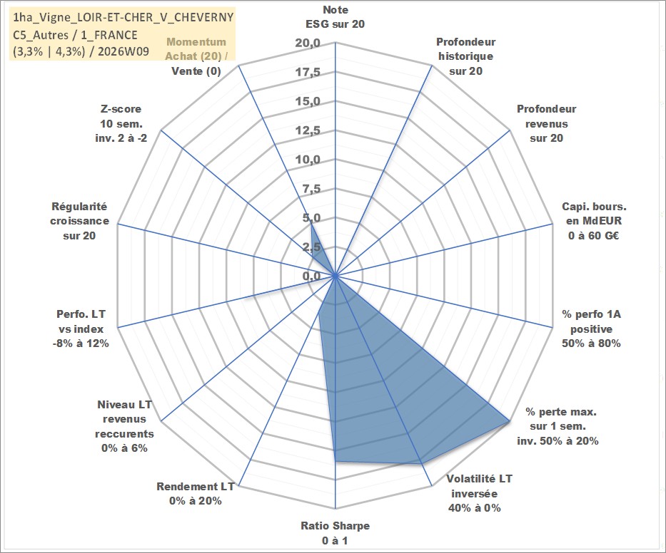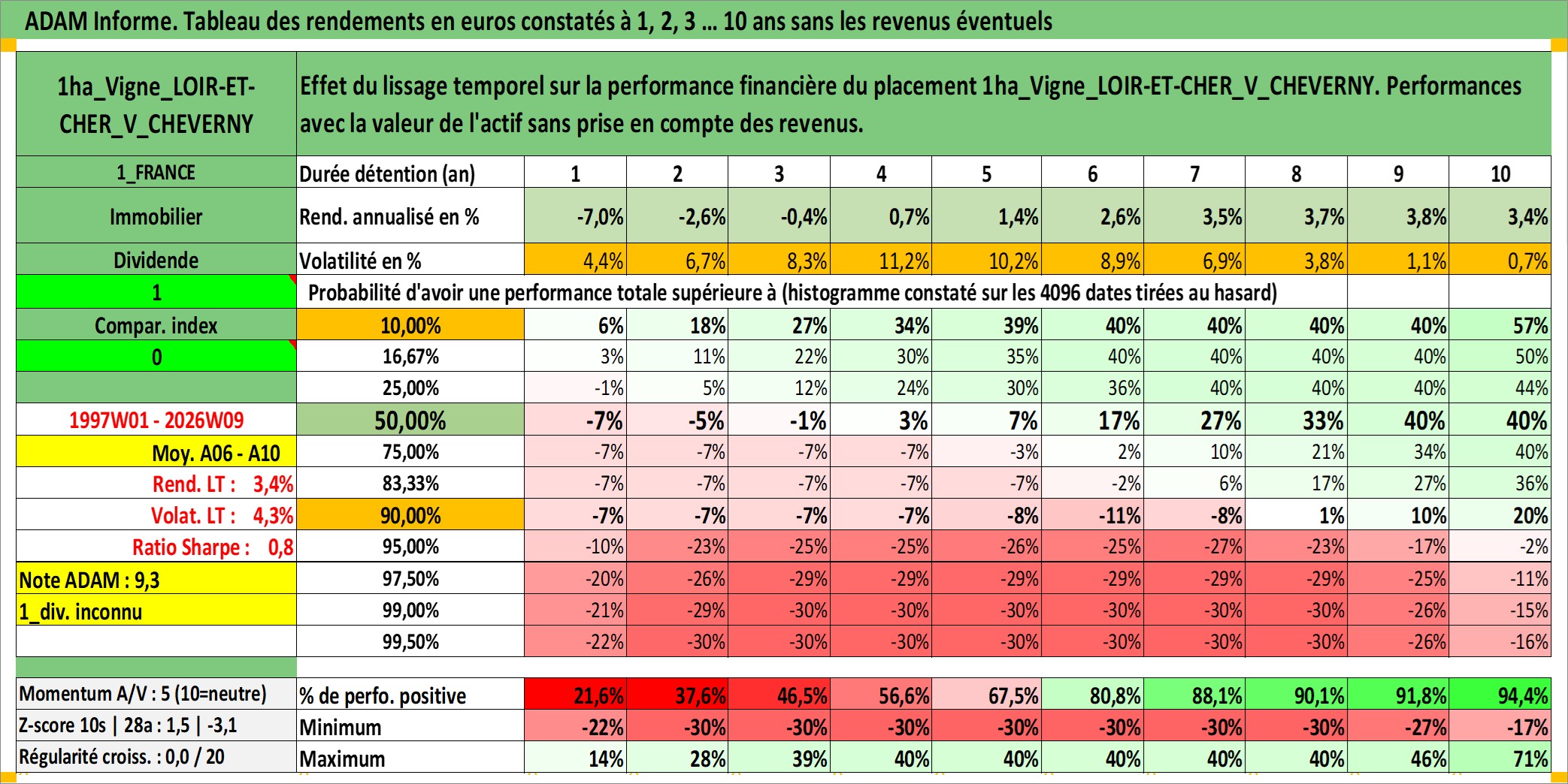 Site dédié aux investisseursPage dédiée sur site financeAnalyse des valorisations hebdomadaires de l'actif 1ha_Vigne_LOIR-ET-CHER_V_CHEVERNY. Cet actif est cote en EUR. Les valorisations couvrent les semaines 1997W01 a 2026W09. Les fermages de ce bien foncier sont pris egaux a 2,5% annuels de la valeur venale du bien.