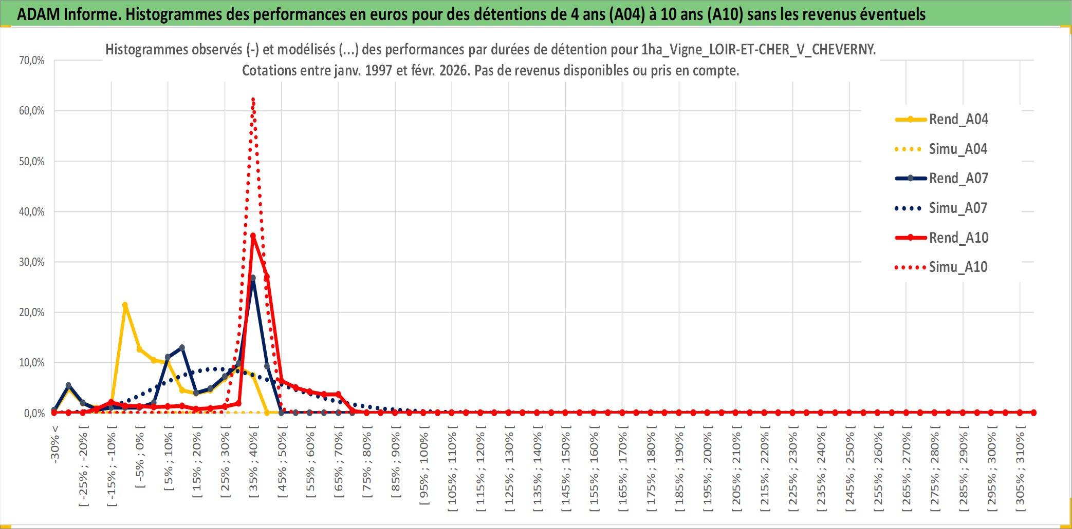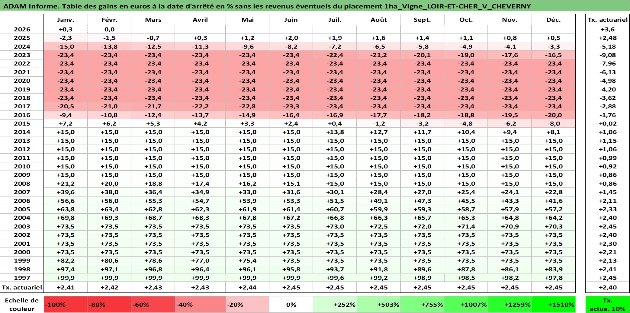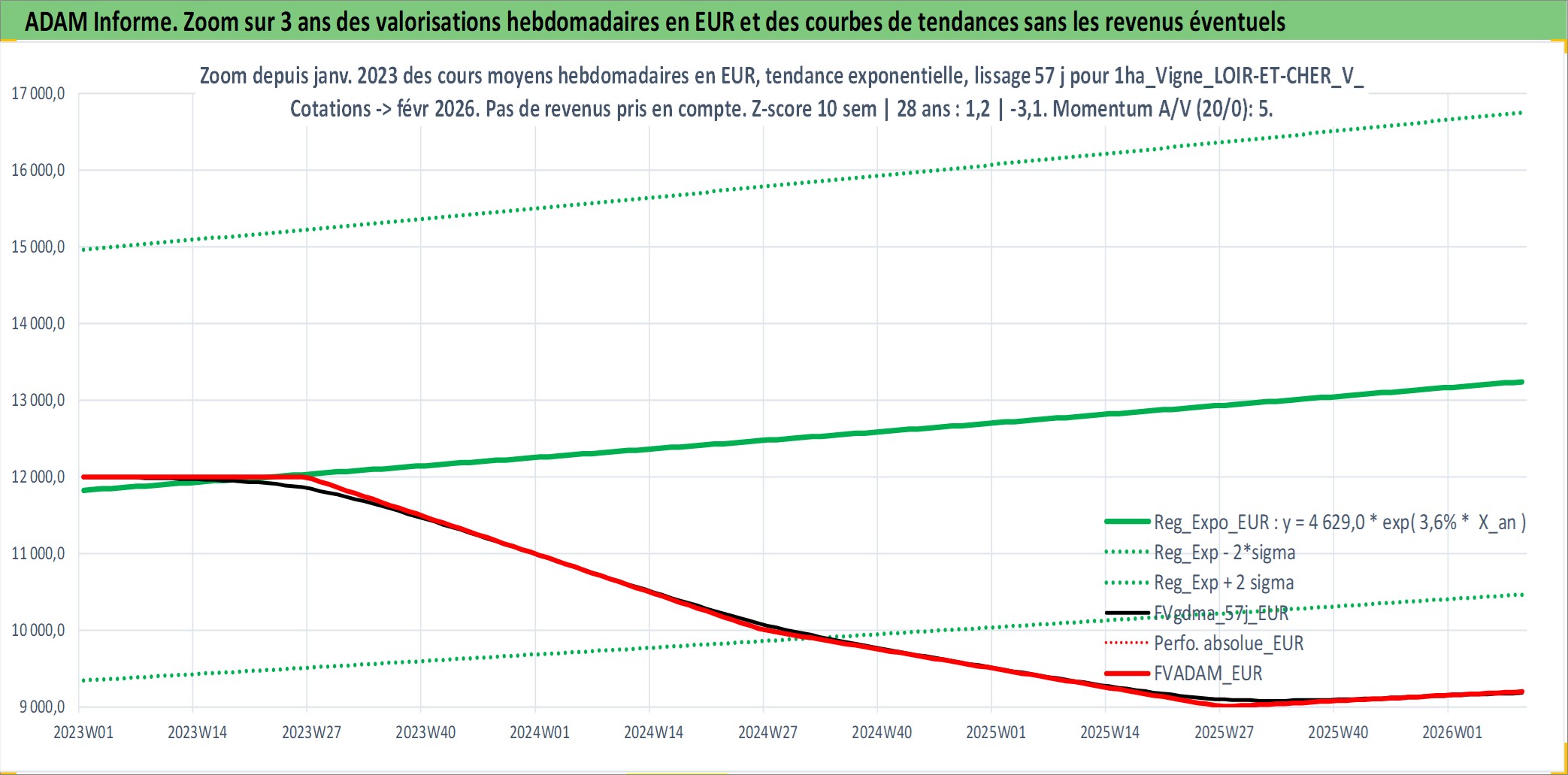 Site dédié aux investisseursPage dédiée sur site financeAnalyse des valorisations hebdomadaires de l'actif 1ha_Vigne_LOIR-ET-CHER_V_CHEVERNY. Cet actif est cote en EUR. Les valorisations couvrent les semaines 1997W01 a 2026W09. Les fermages de ce bien foncier sont pris egaux a 2,5% annuels de la valeur venale du bien.