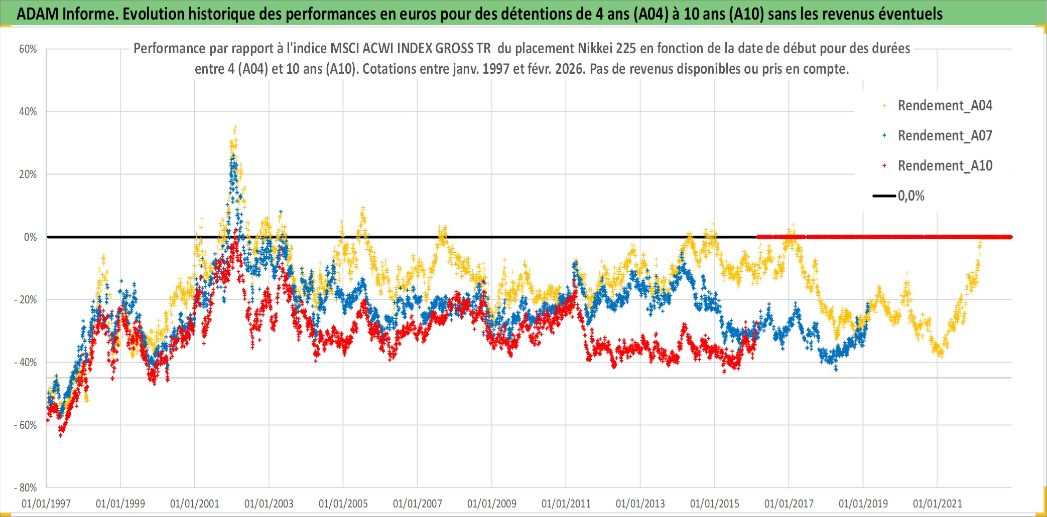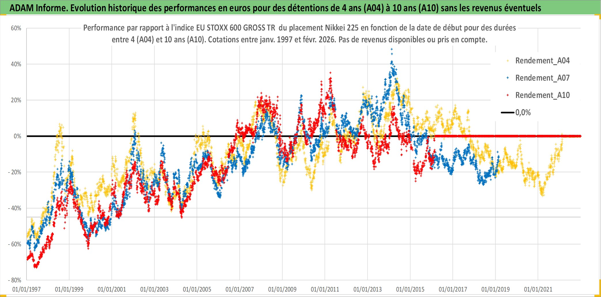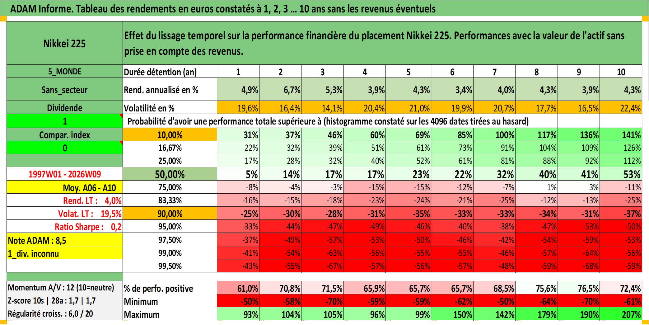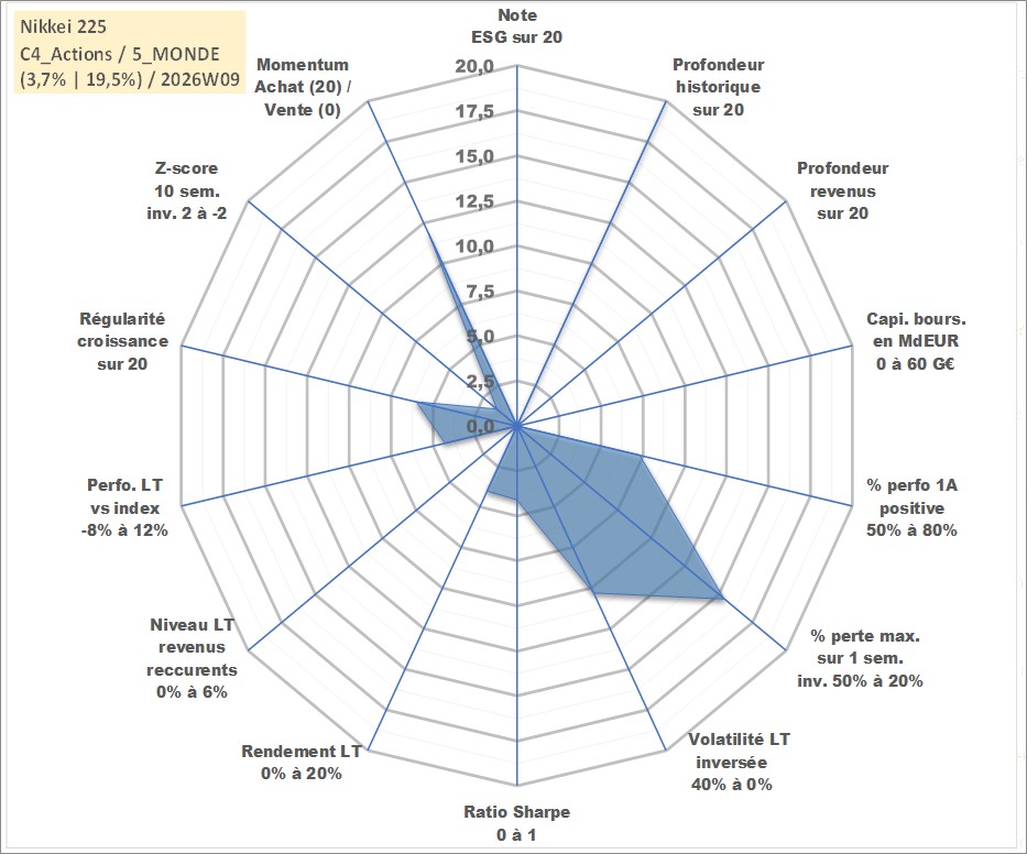 Site dédié aux investisseursPage dédiée sur site financeAnalyse des valorisations hebdomadaires de l'actif Nikkei 225. Cet actif est cote en JPY. Les valorisations sont en contrevaleur EURO et couvrent les semaines 1997W01 a 2026W09. Les revenus de cet actif financier ne sont pas connus car non existants ou non disponibles sur le site Yahoo Finance. La note ESG de cet actif n'est pas connue.