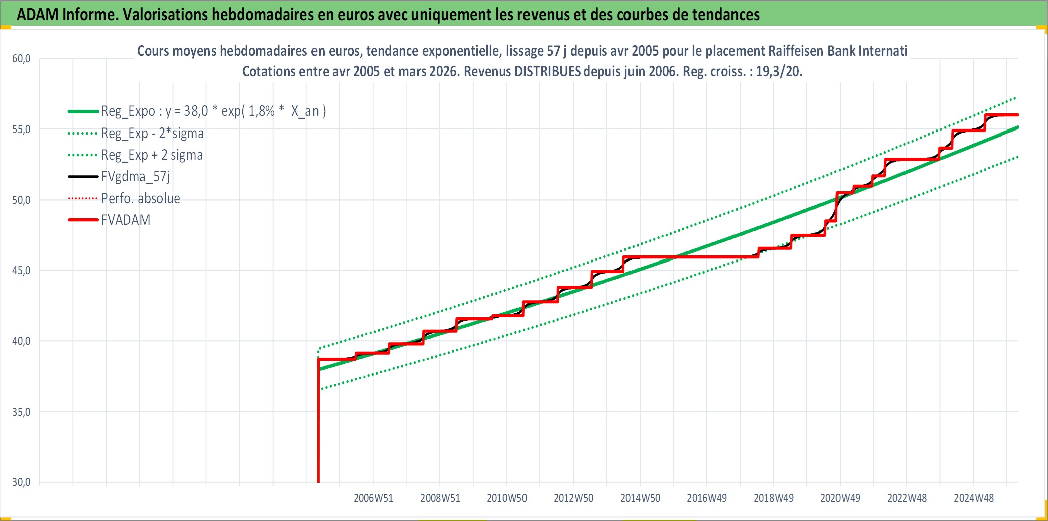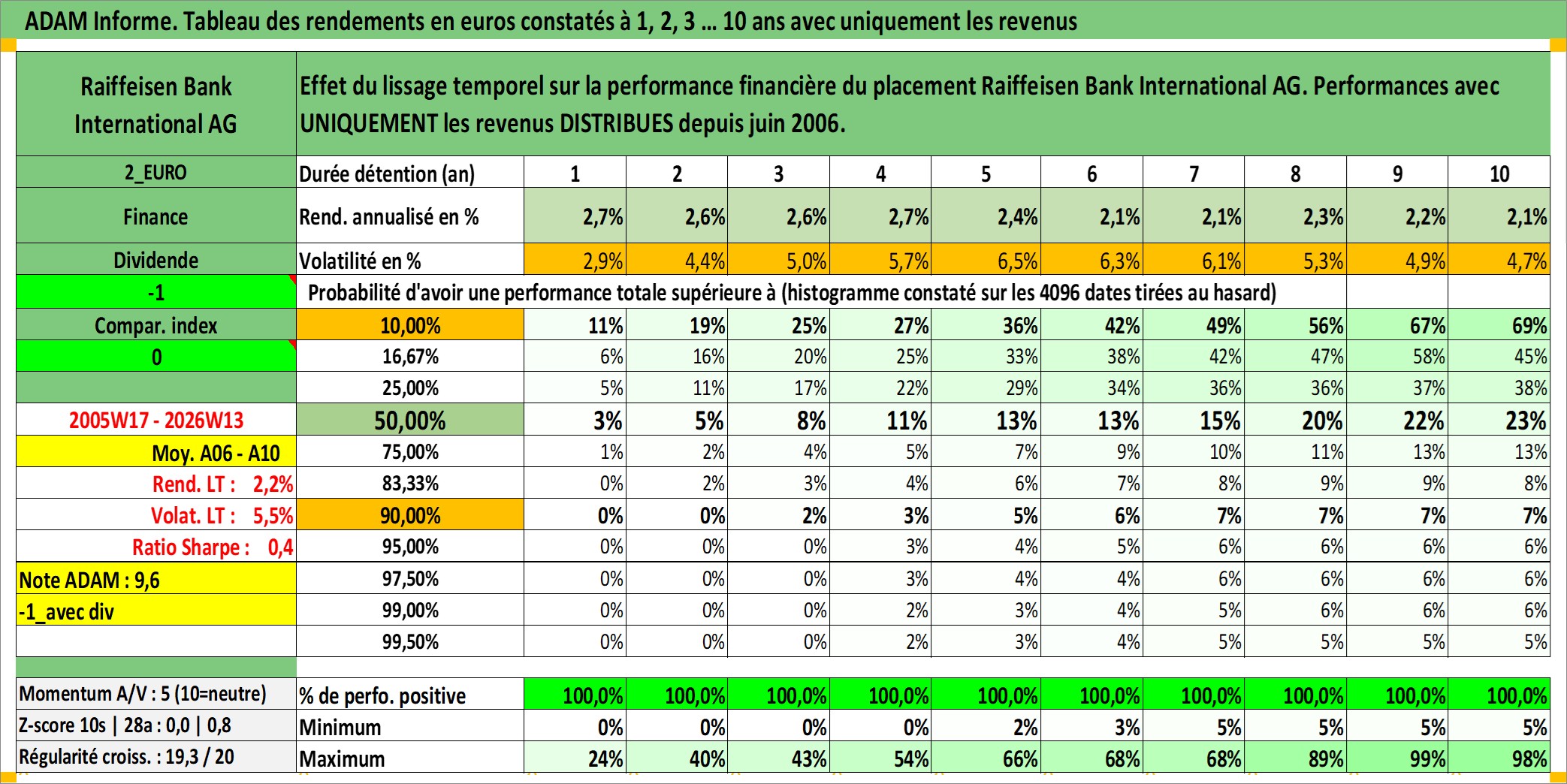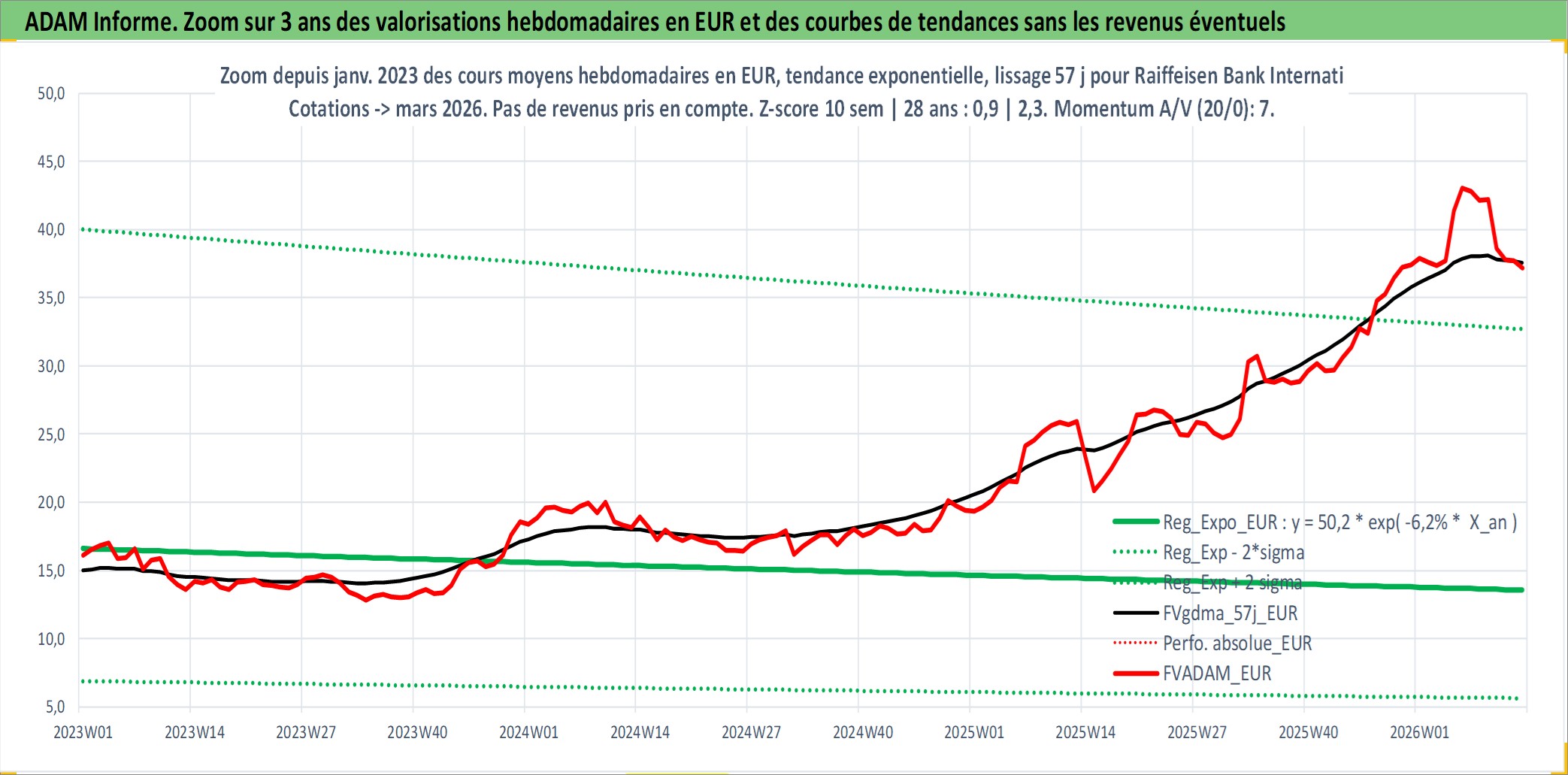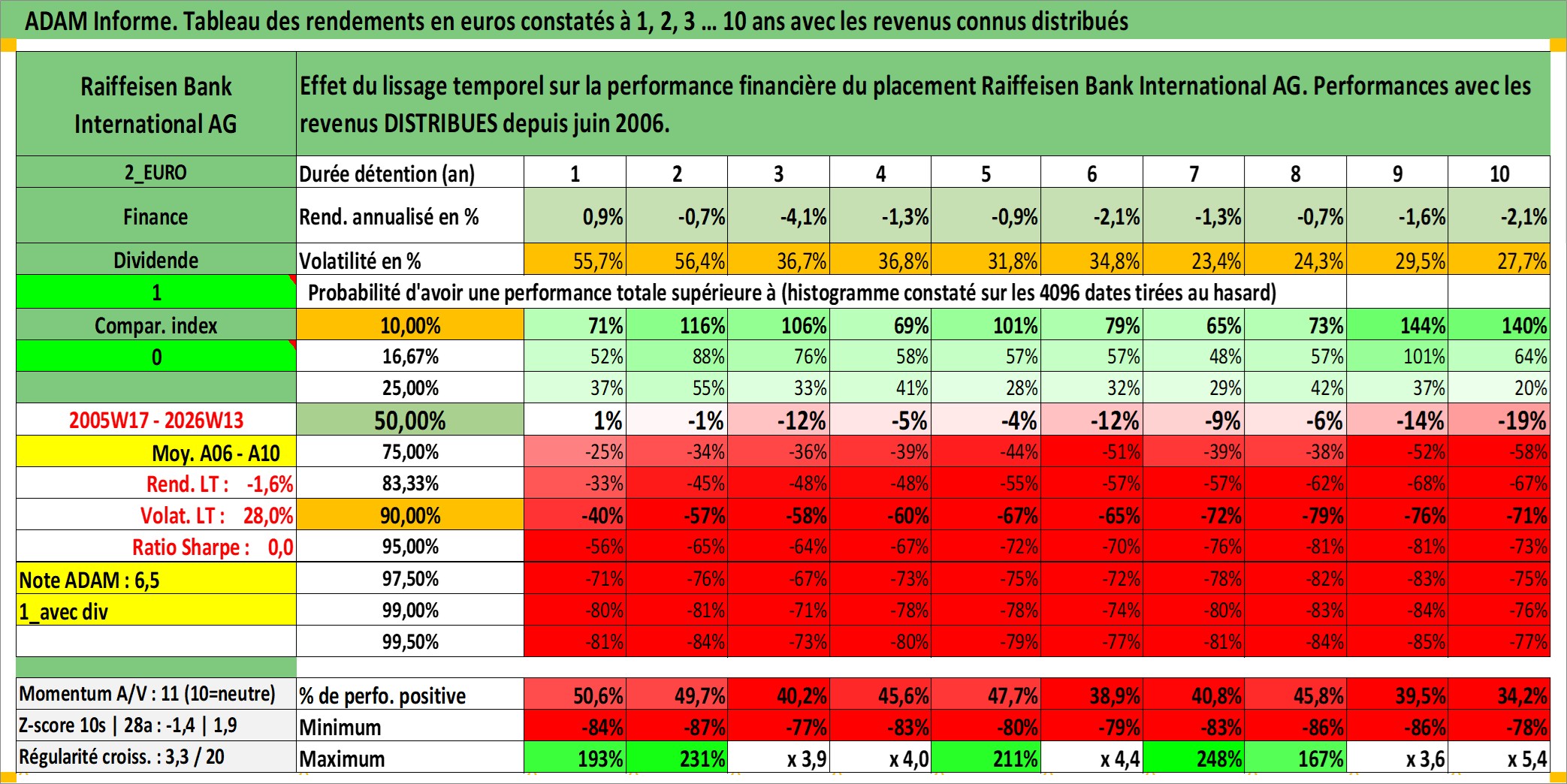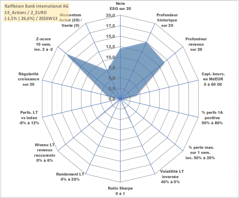Site dédié aux investisseursPage dédiée sur site financeAnalyse des valorisations hebdomadaires de l'action Raiffeisen Bank International AG. Cet actif est cote en EUR. Les valorisations couvrent les semaines 2005W17 a 2026W13. Les revenus de cet actif financier sont pris en compte depuis la semaine 2006W24. La note globale ESG de cet actif est estimee a 12.0 (apres rebasage entre 0 et 20).