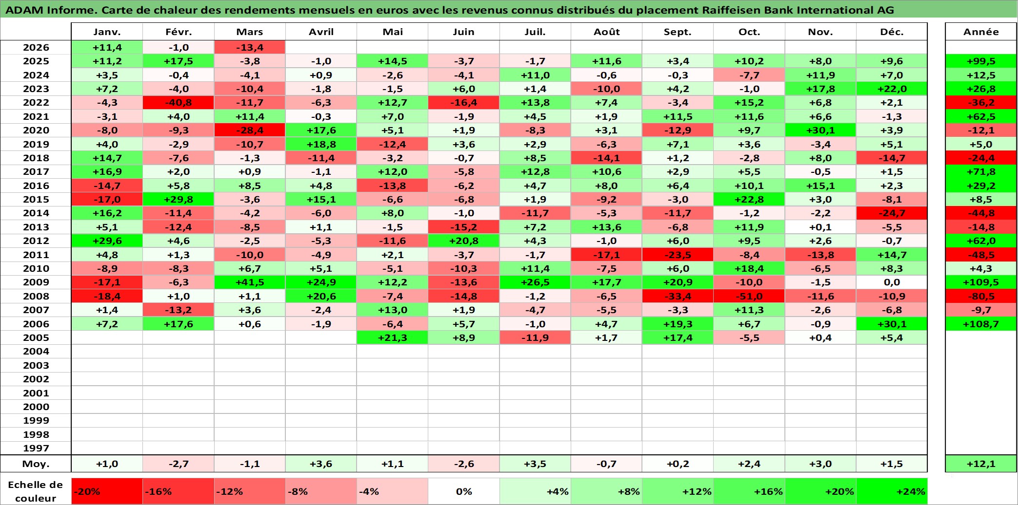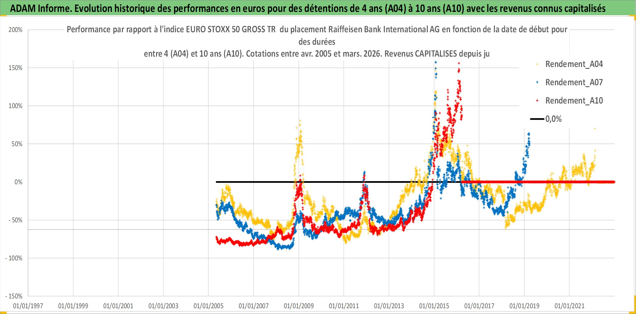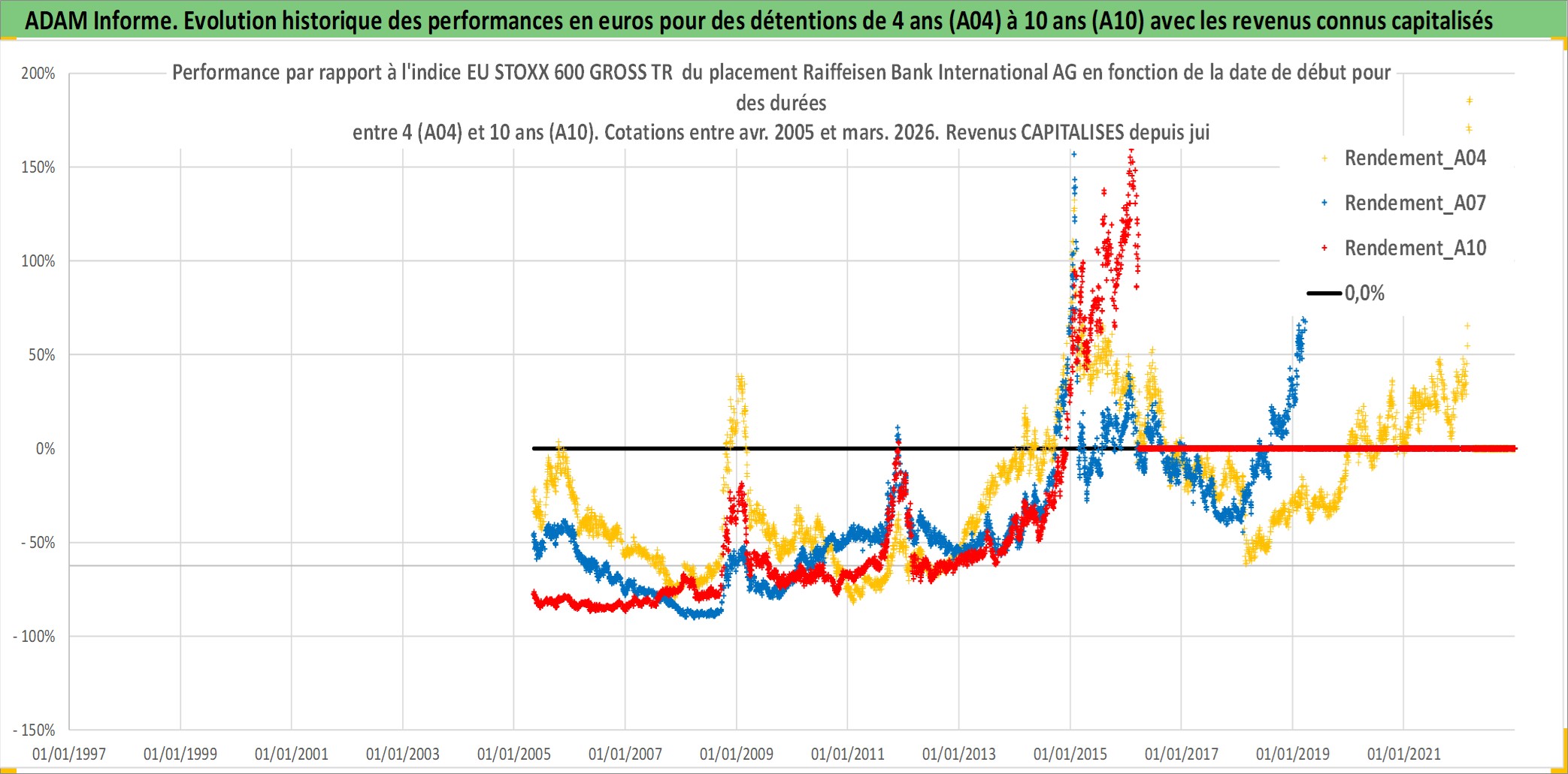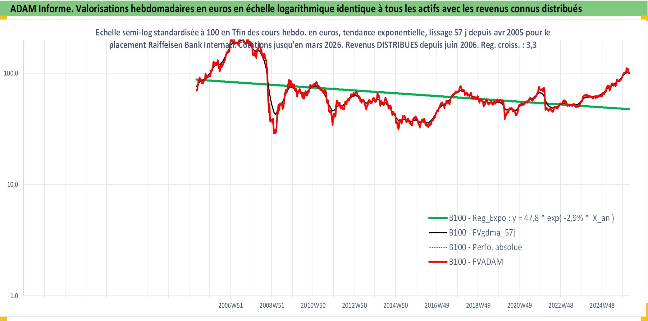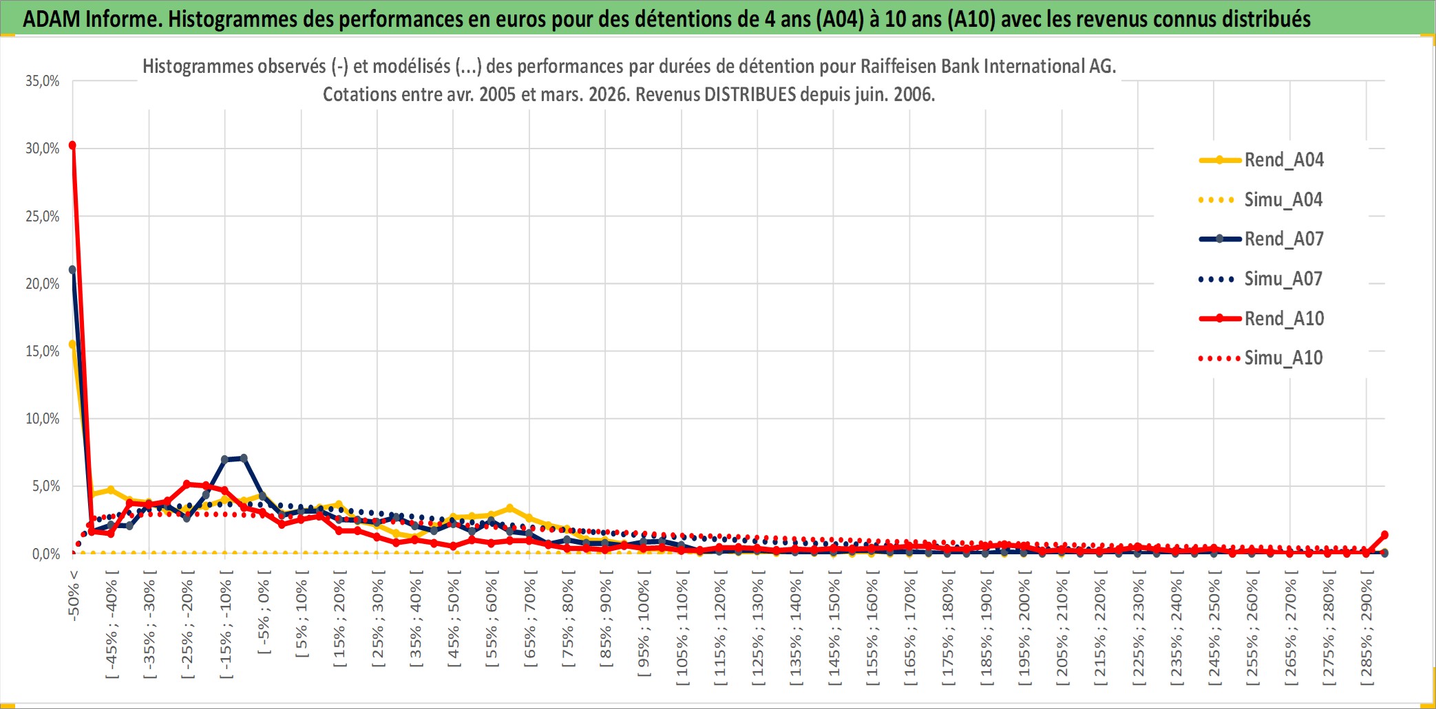 Site dédié aux investisseursPage dédiée sur site financeAnalyse des valorisations hebdomadaires de l'action Raiffeisen Bank International AG. Cet actif est cote en EUR. Les valorisations couvrent les semaines 2005W17 a 2026W13. Les revenus de cet actif financier sont pris en compte depuis la semaine 2006W24. La note globale ESG de cet actif est estimee a 12.0 (apres rebasage entre 0 et 20).
