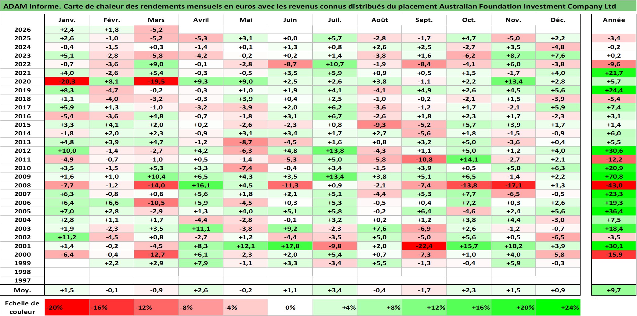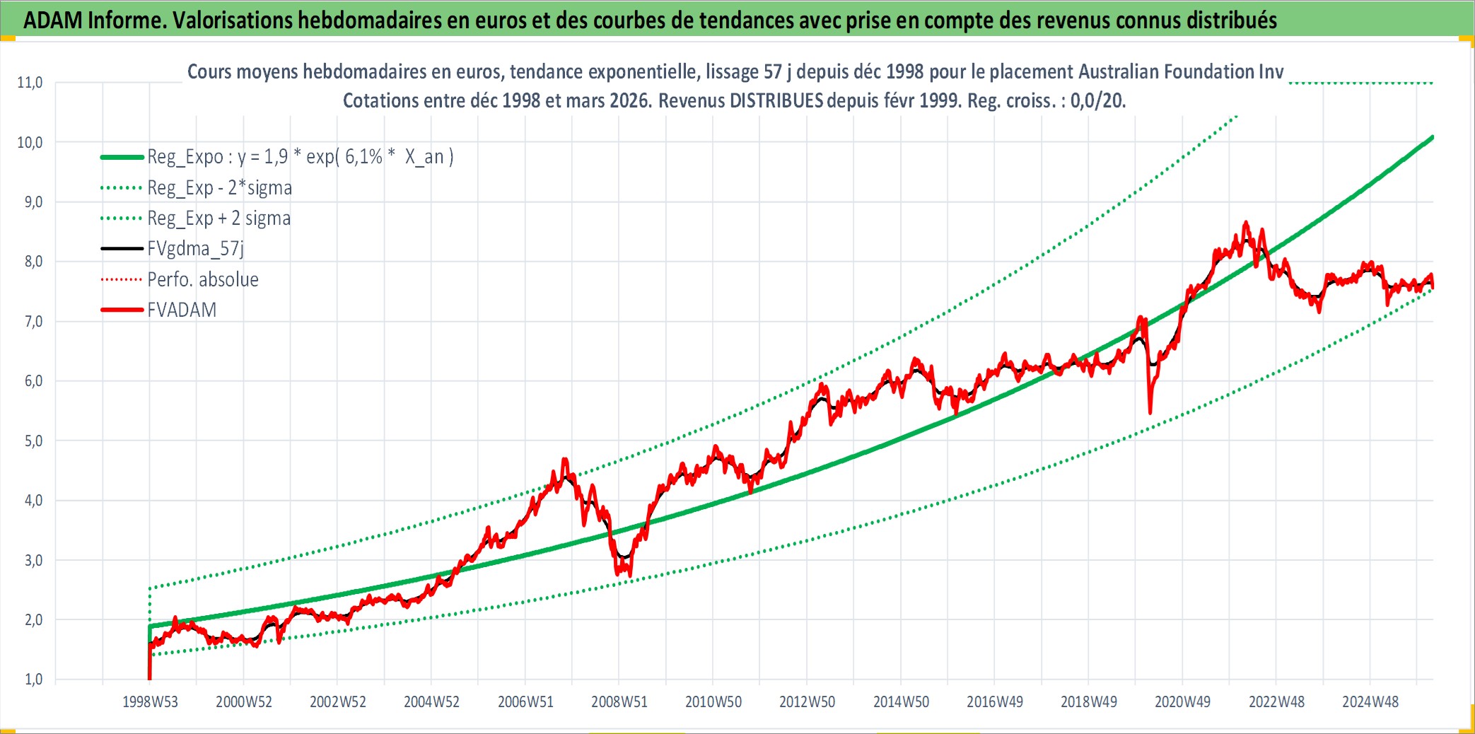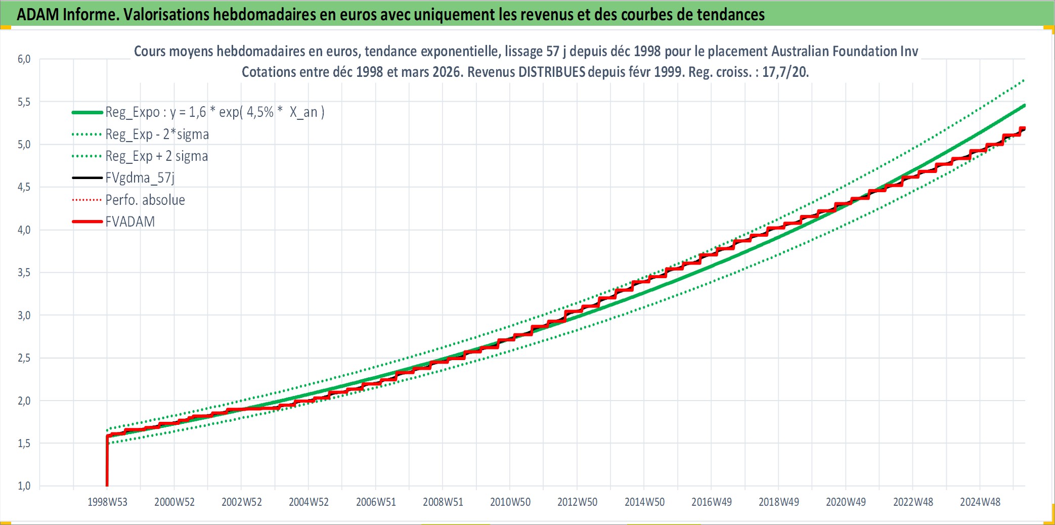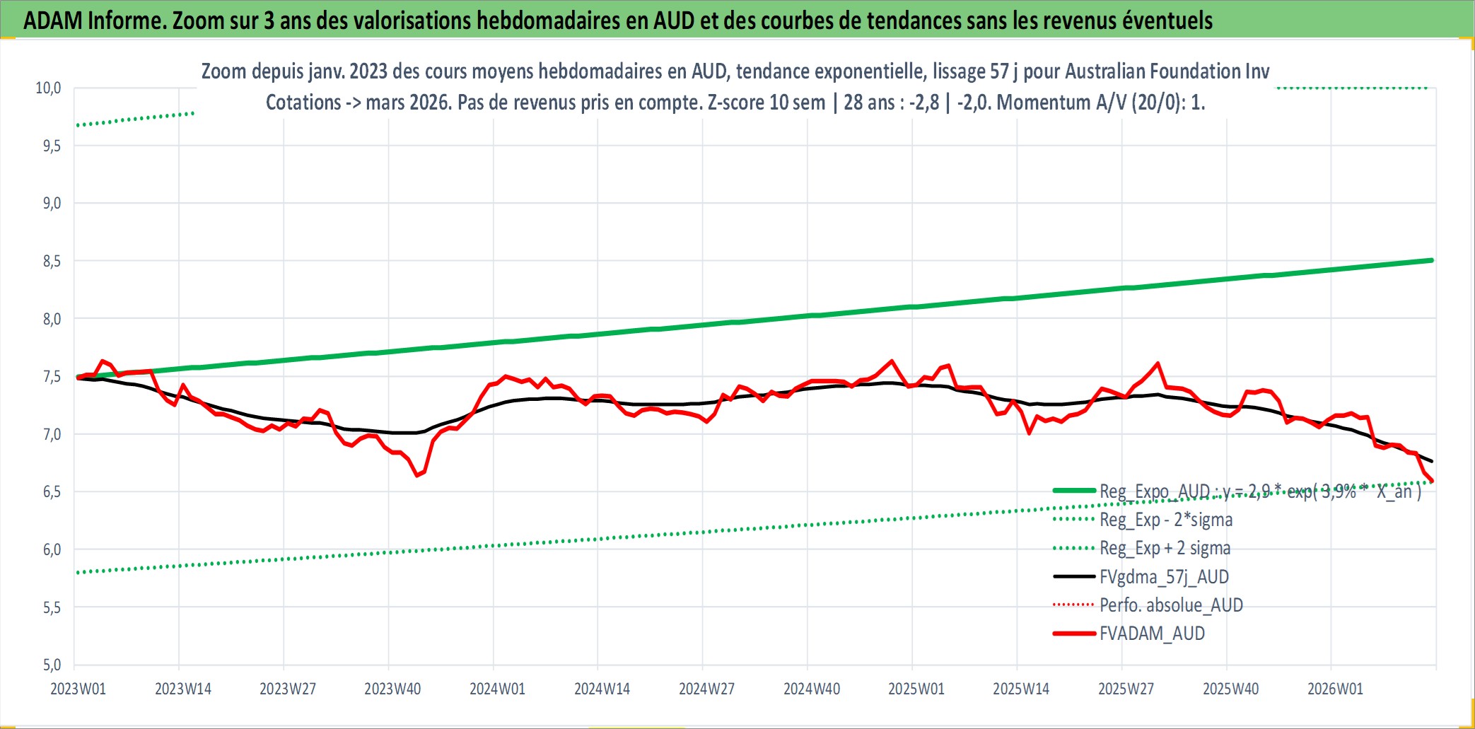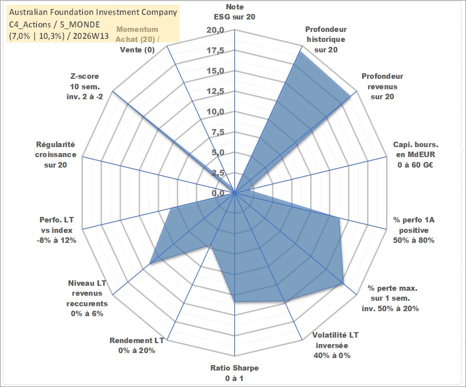 Site dédié aux investisseursPage dédiée sur site financeAnalyse des valorisations hebdomadaires de l'action Australian Foundation Investment Company Ltd. Cet actif est cote en AUD. Les valorisations sont en contrevaleur EURO et couvrent les semaines 1998W53 a 2026W13. Les revenus de cet actif financier sont pris en compte depuis la semaine 1999W07. La note ESG de cet actif n'est pas connue.