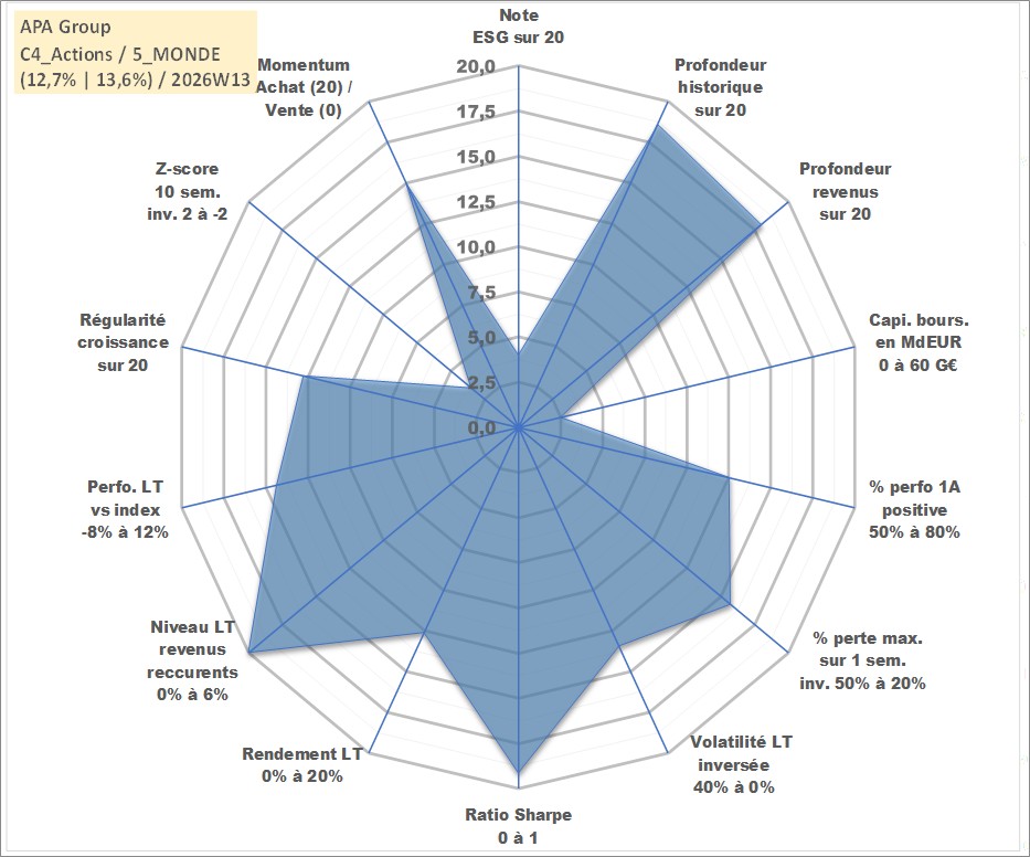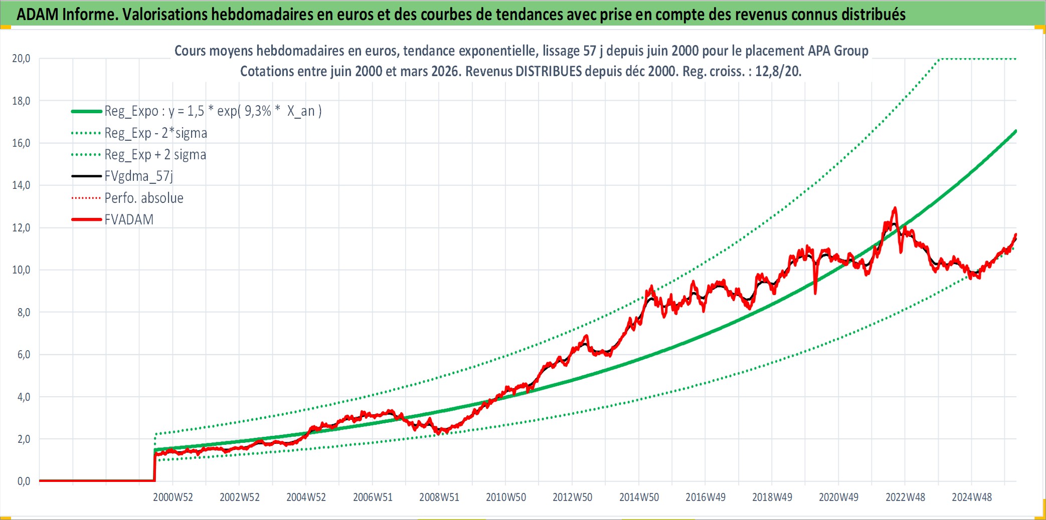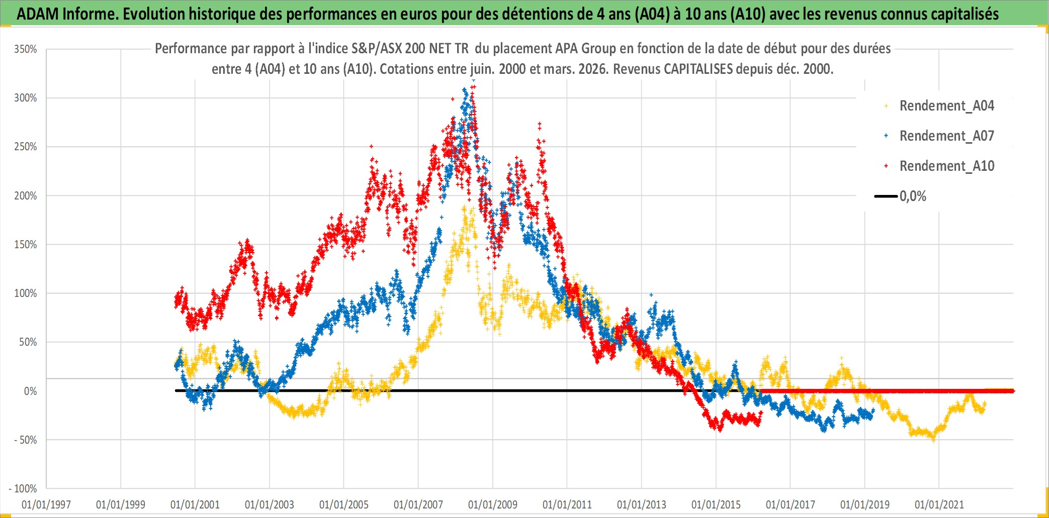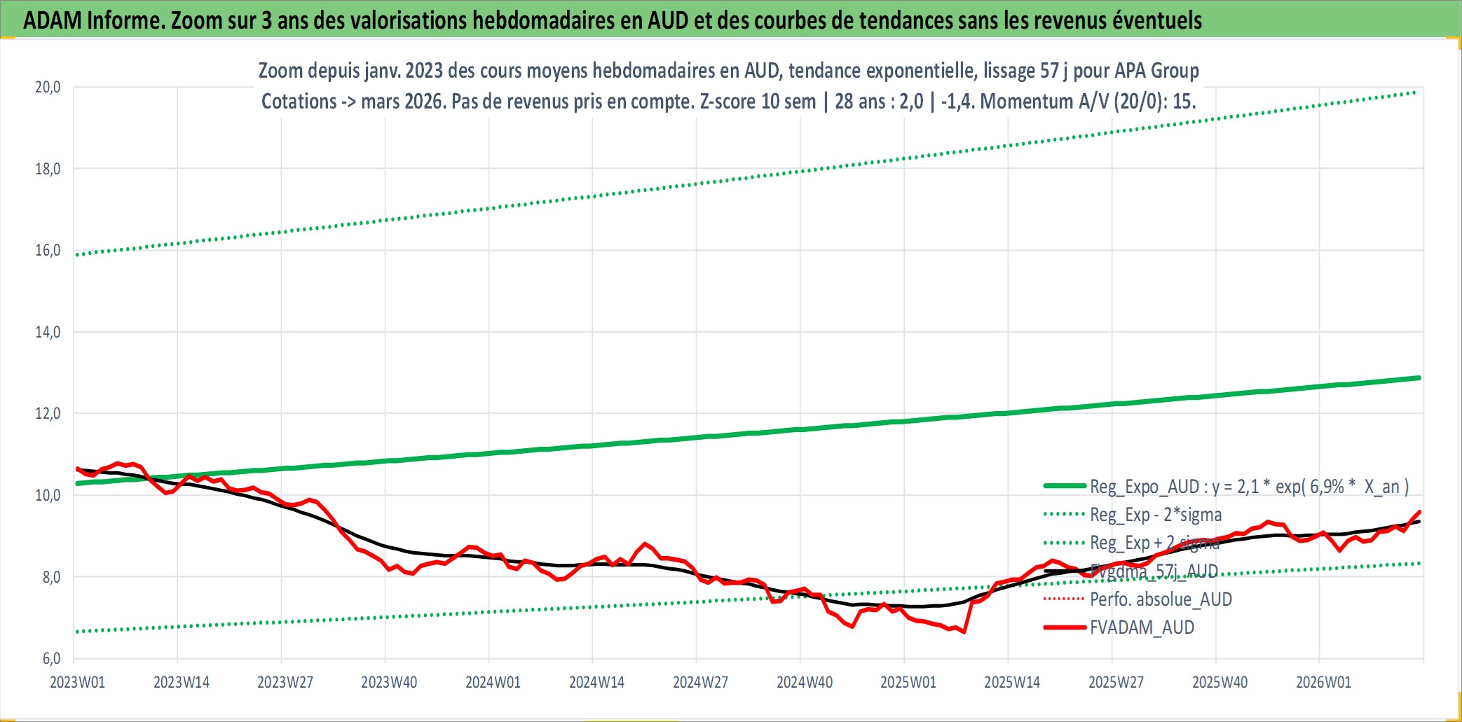 Site dédié aux investisseursPage dédiée sur site financeAnalyse des valorisations hebdomadaires de l'action APA Group. Cet actif est cote en AUD. Les valorisations sont en contrevaleur EURO et couvrent les semaines 2000W24 a 2026W13. Les revenus de cet actif financier sont pris en compte depuis la semaine 2000W48. La note globale ESG de cet actif est estimee a 4.0 (apres rebasage entre 0 et 20).