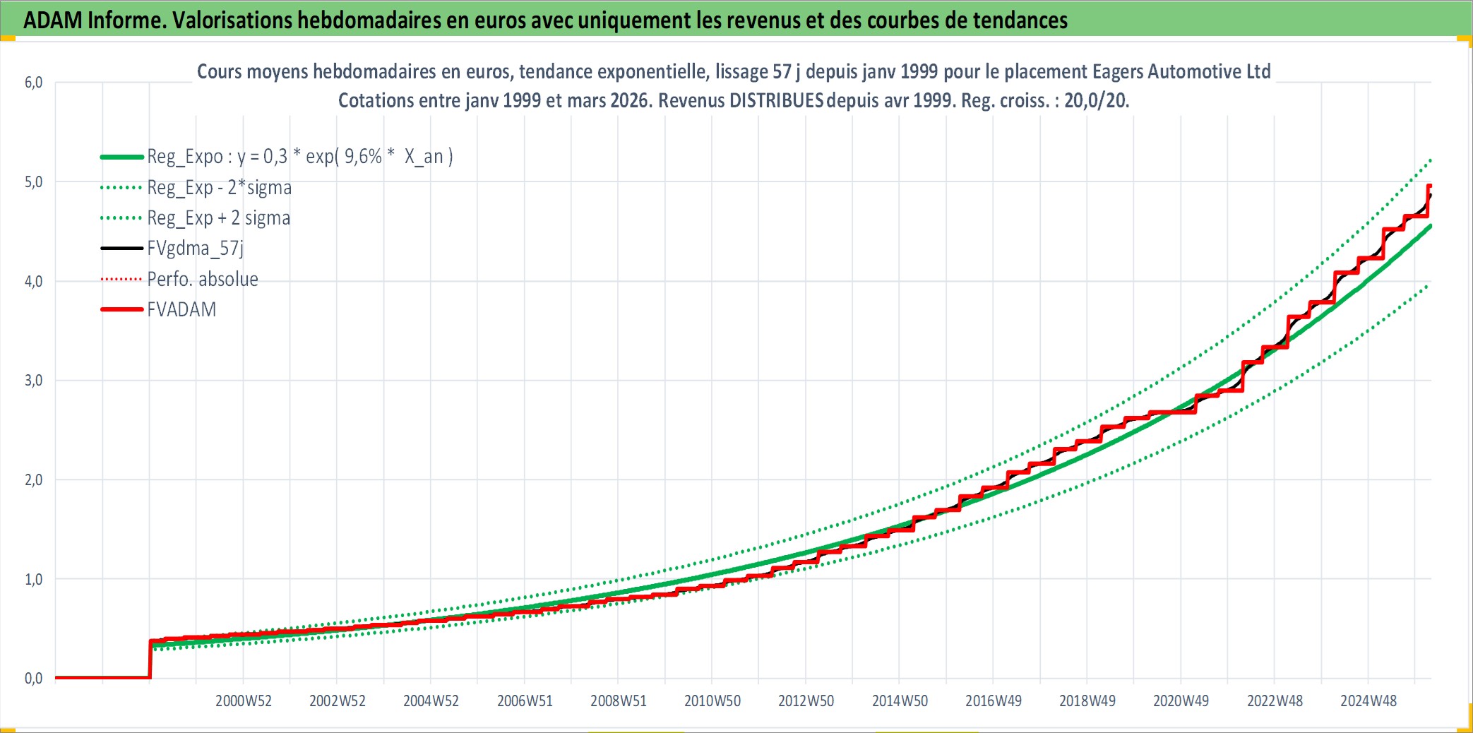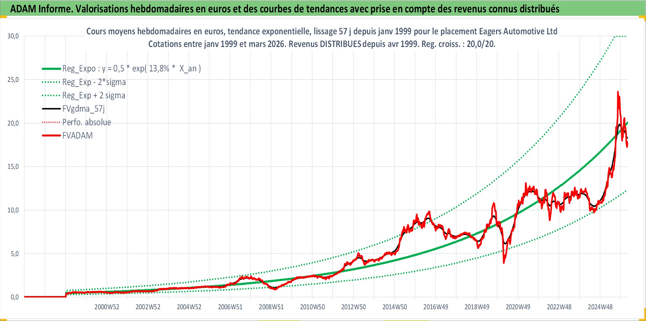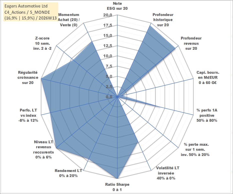 Site dédié aux investisseursPage dédiée sur site financeAnalyse des valorisations hebdomadaires de l'action Eagers Automotive Ltd. Cet actif est cote en AUD. Les valorisations sont en contrevaleur EURO et couvrent les semaines 1999W01 a 2026W13. Les revenus de cet actif financier sont pris en compte depuis la semaine 1999W17. La note ESG de cet actif n'est pas connue.