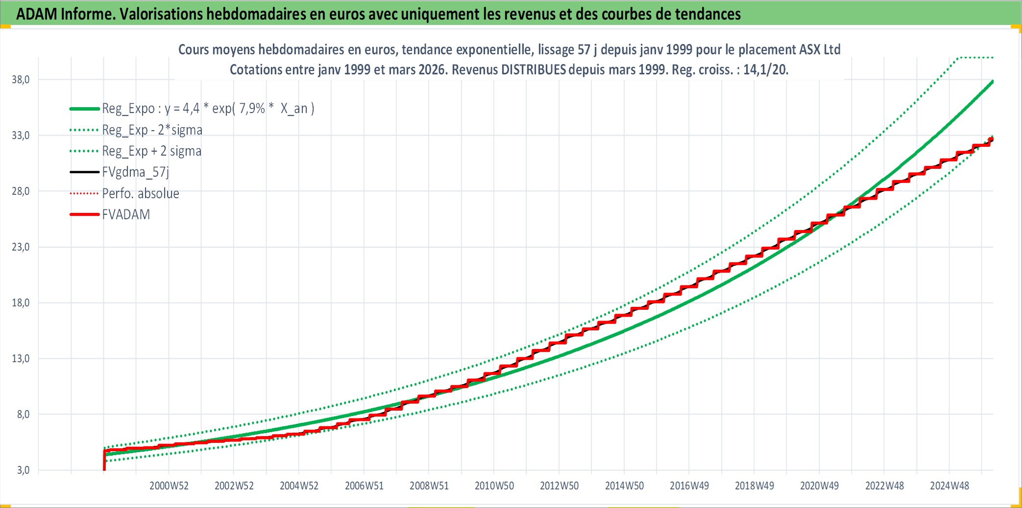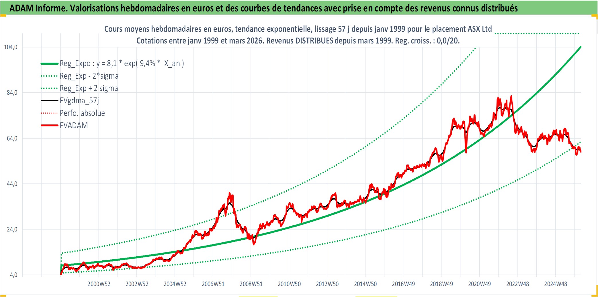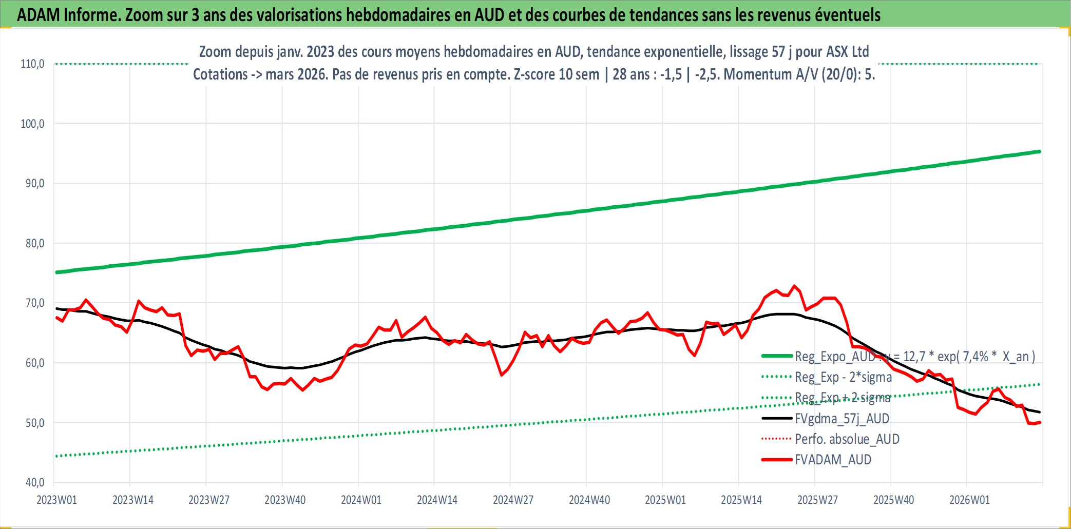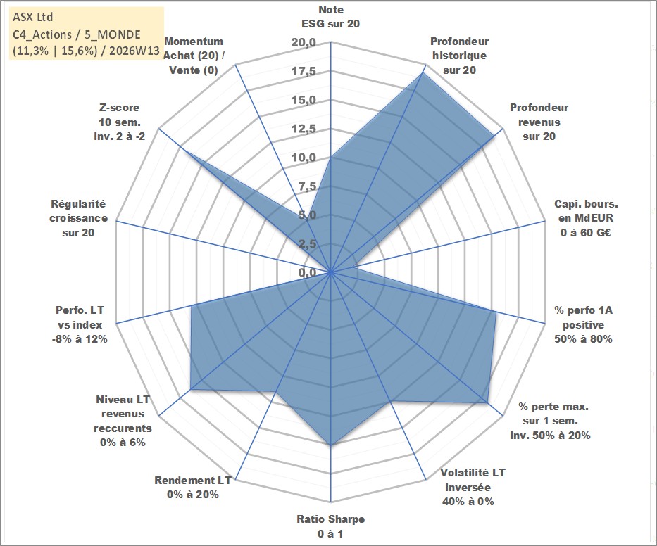 Site dédié aux investisseursPage dédiée sur site financeAnalyse des valorisations hebdomadaires de l'action ASX Ltd. Cet actif est cote en AUD. Les valorisations sont en contrevaleur EURO et couvrent les semaines 1999W01 a 2026W13. Les revenus de cet actif financier sont pris en compte depuis la semaine 1999W10. La note globale ESG de cet actif est estimee a 10.0 (apres rebasage entre 0 et 20).