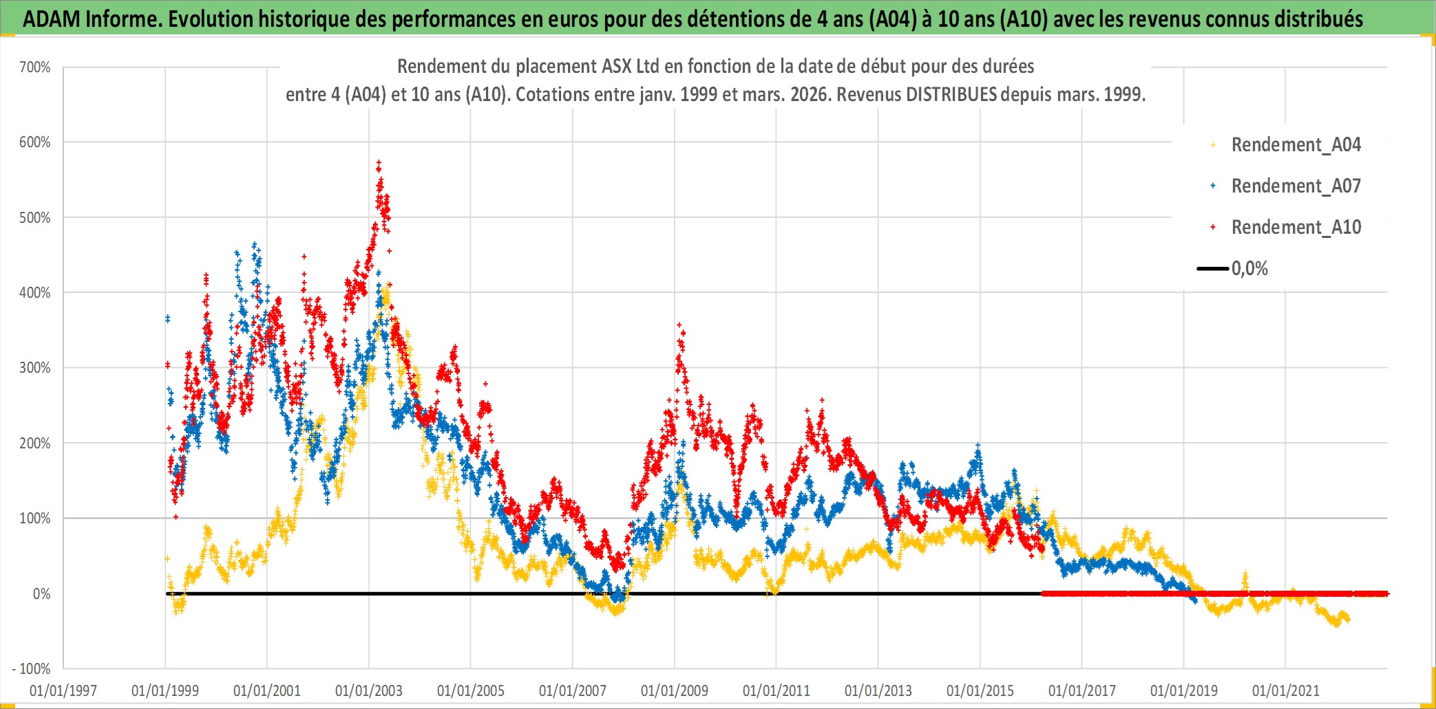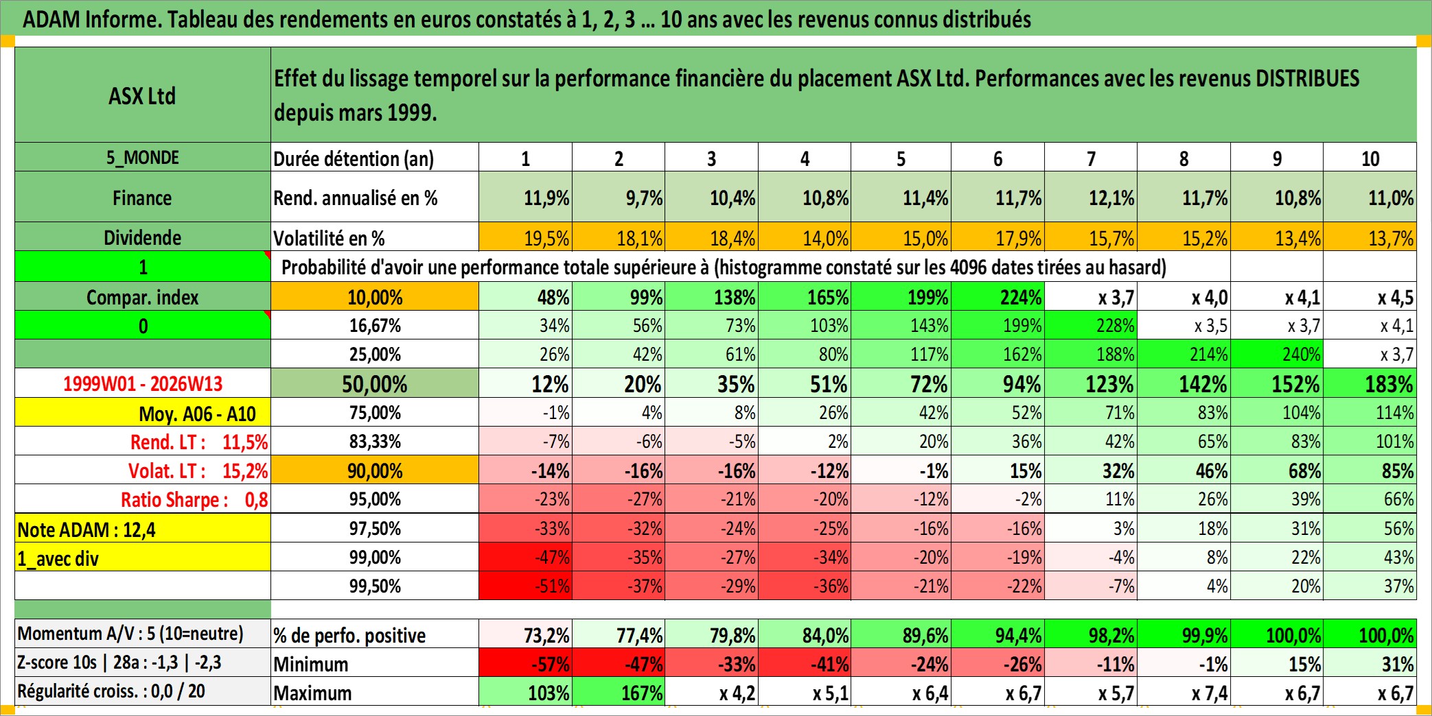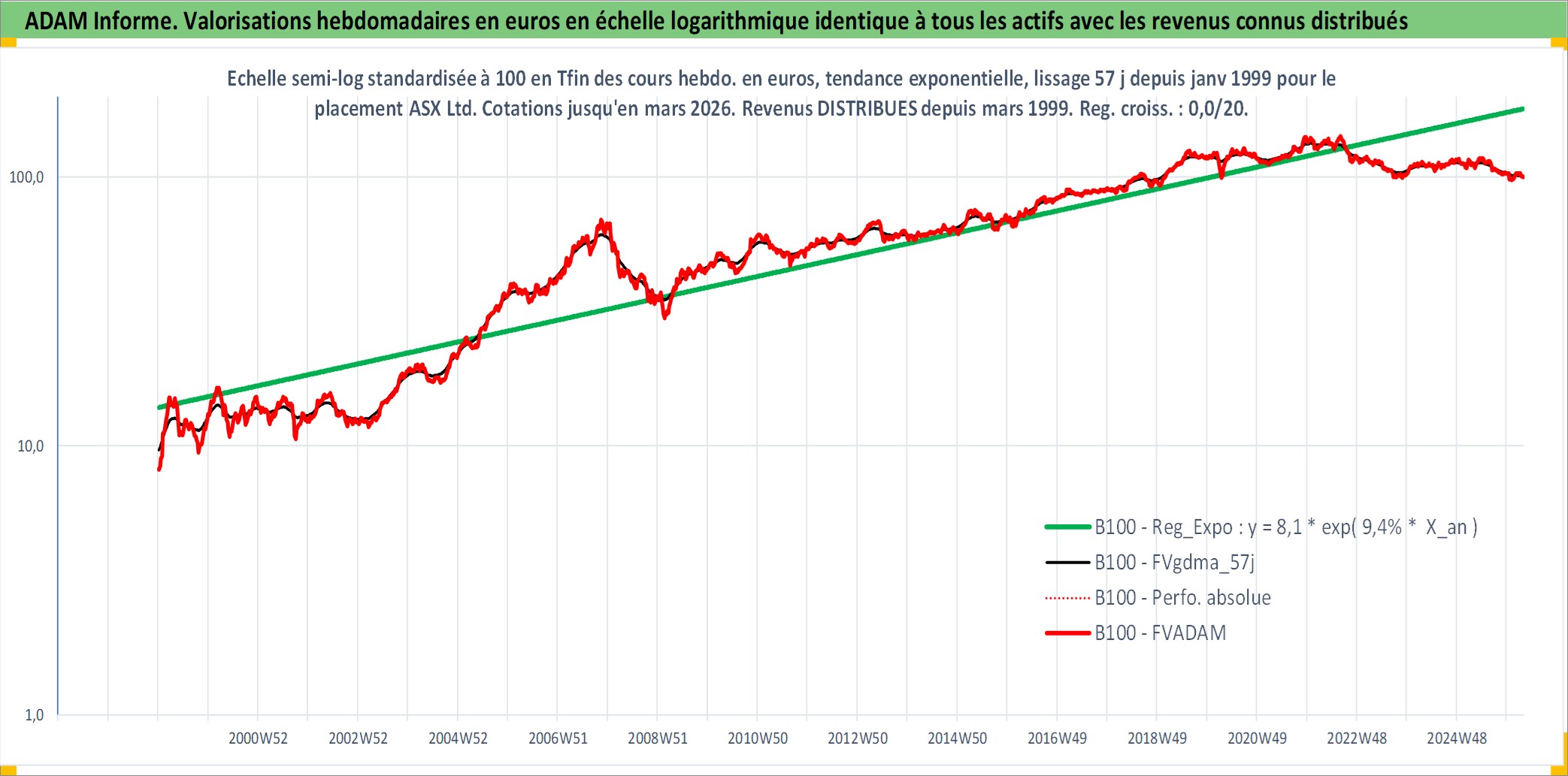 Site dédié aux investisseursPage dédiée sur site financeAnalyse des valorisations hebdomadaires de l'action ASX Ltd. Cet actif est cote en AUD. Les valorisations sont en contrevaleur EURO et couvrent les semaines 1999W01 a 2026W13. Les revenus de cet actif financier sont pris en compte depuis la semaine 1999W10. La note globale ESG de cet actif est estimee a 10.0 (apres rebasage entre 0 et 20).