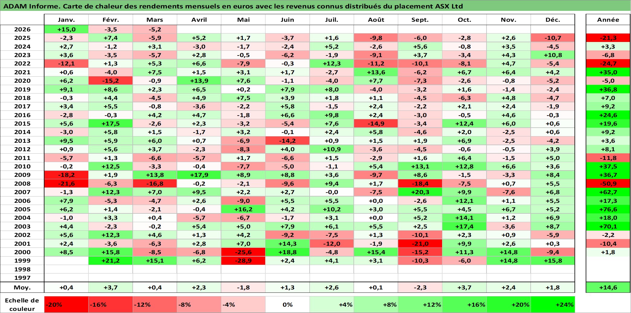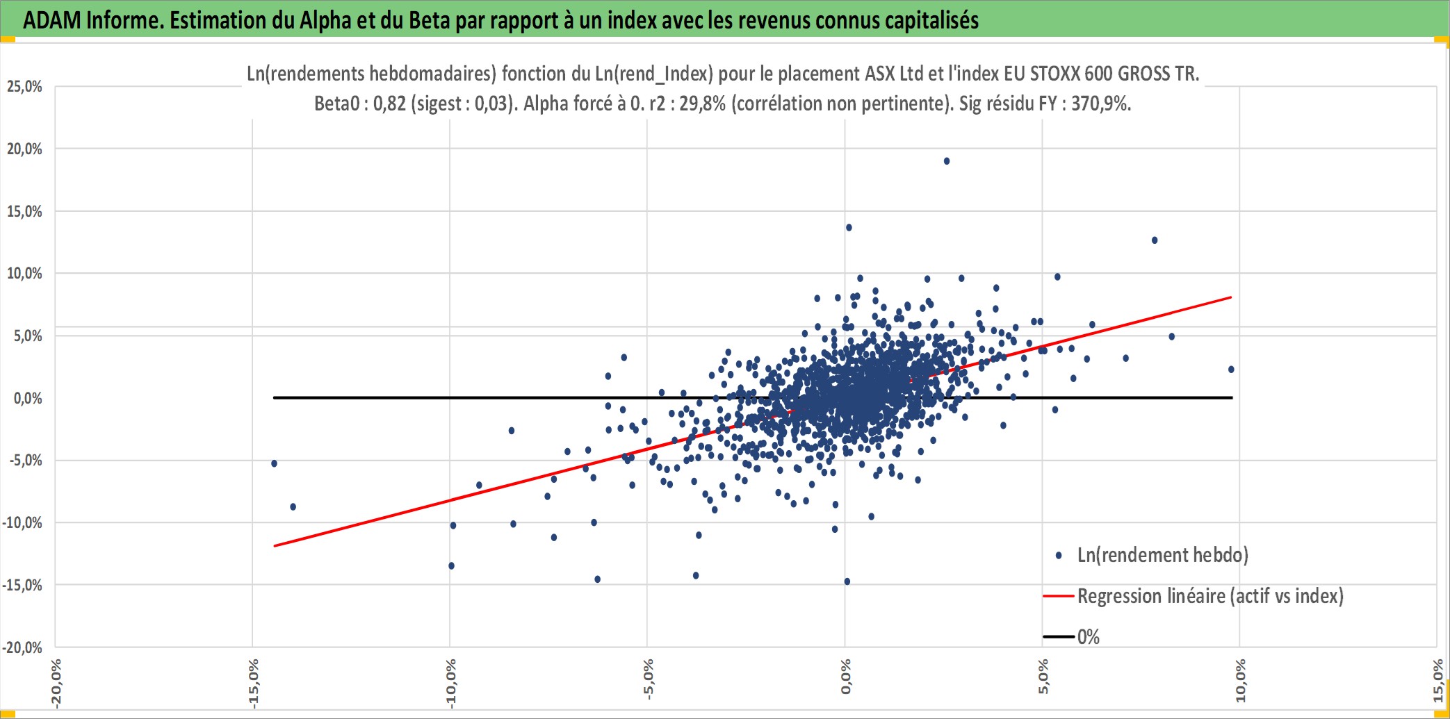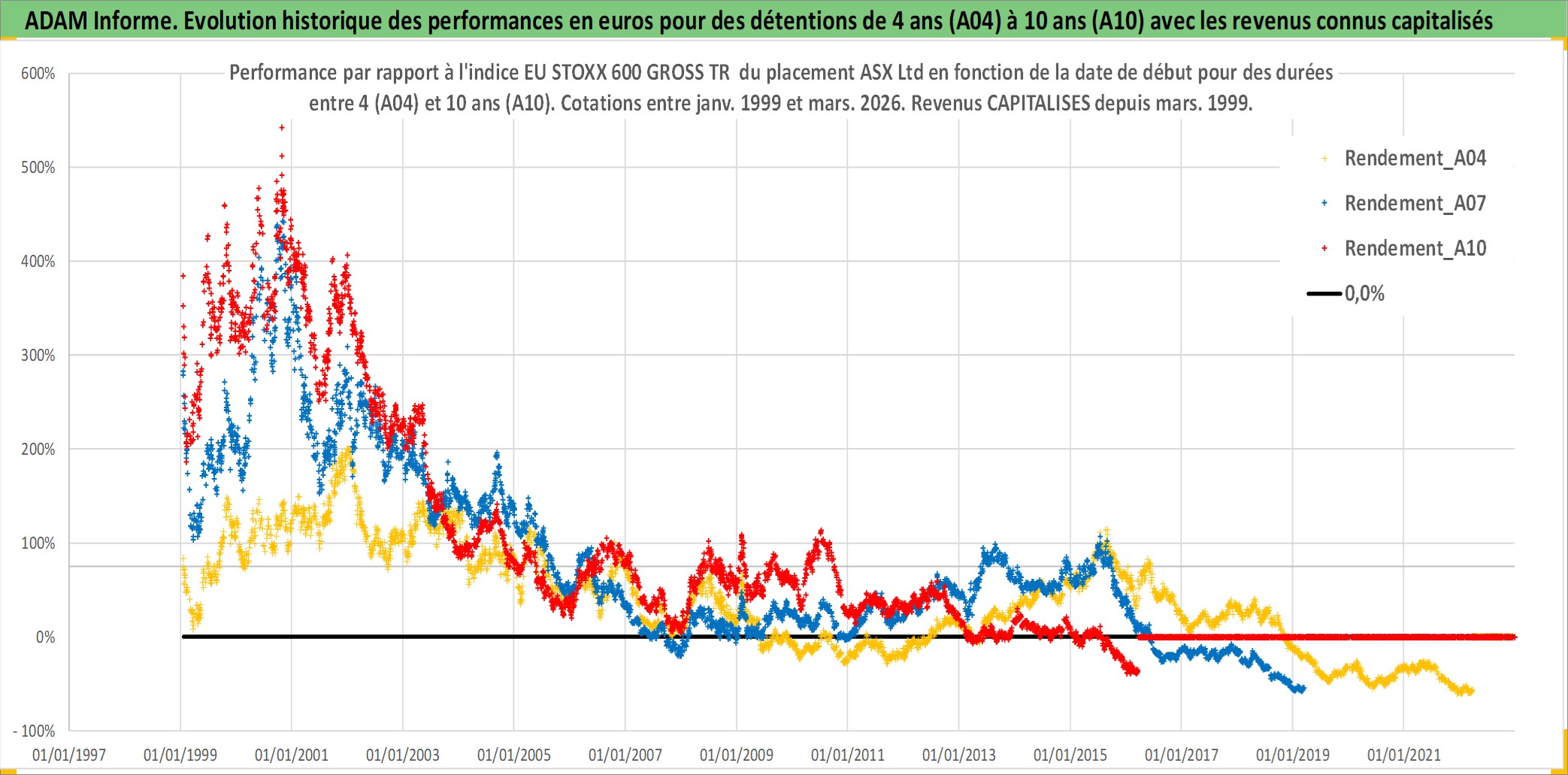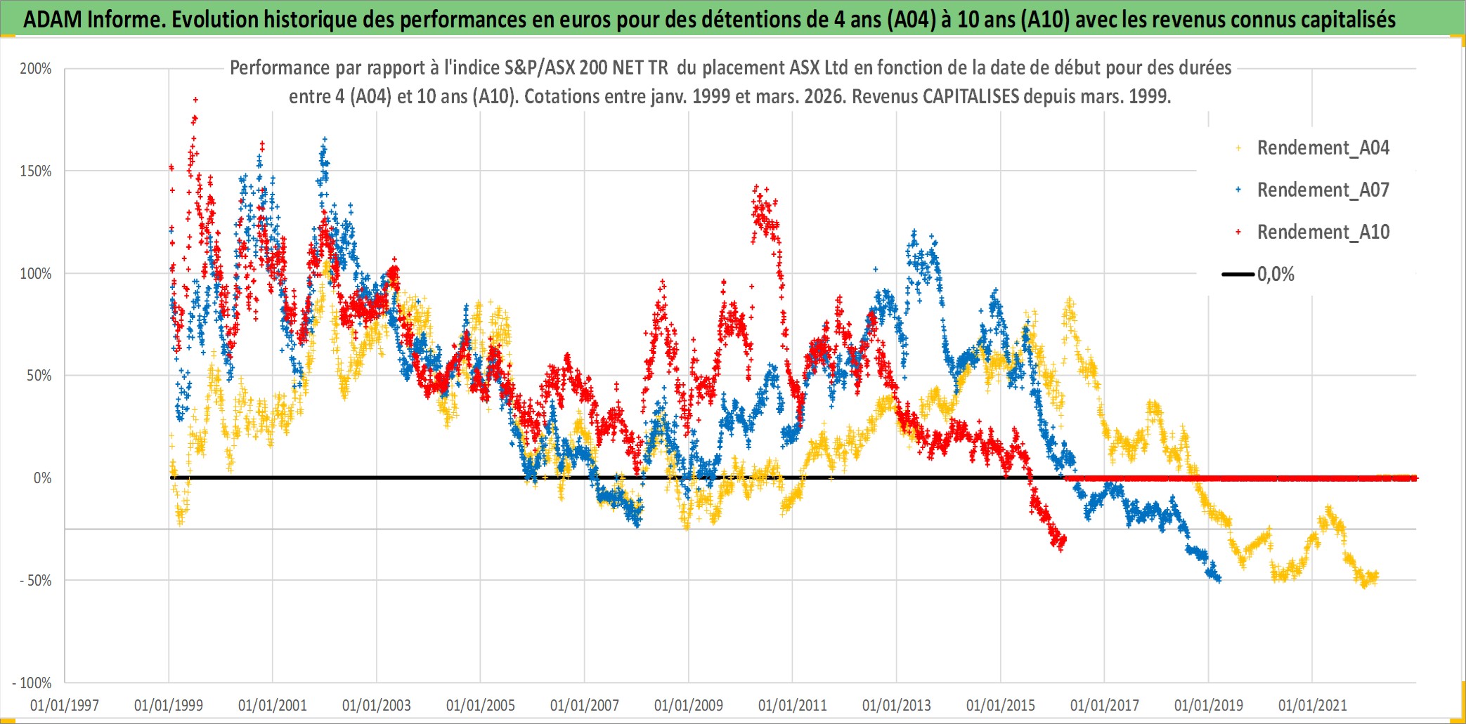 Site dédié aux investisseursPage dédiée sur site financeAnalyse des valorisations hebdomadaires de l'action ASX Ltd. Cet actif est cote en AUD. Les valorisations sont en contrevaleur EURO et couvrent les semaines 1999W01 a 2026W13. Les revenus de cet actif financier sont pris en compte depuis la semaine 1999W10. La note globale ESG de cet actif est estimee a 10.0 (apres rebasage entre 0 et 20).
