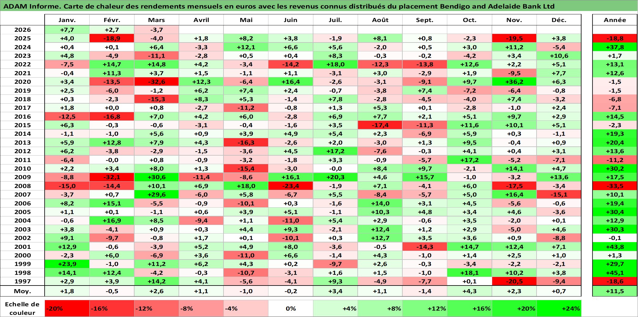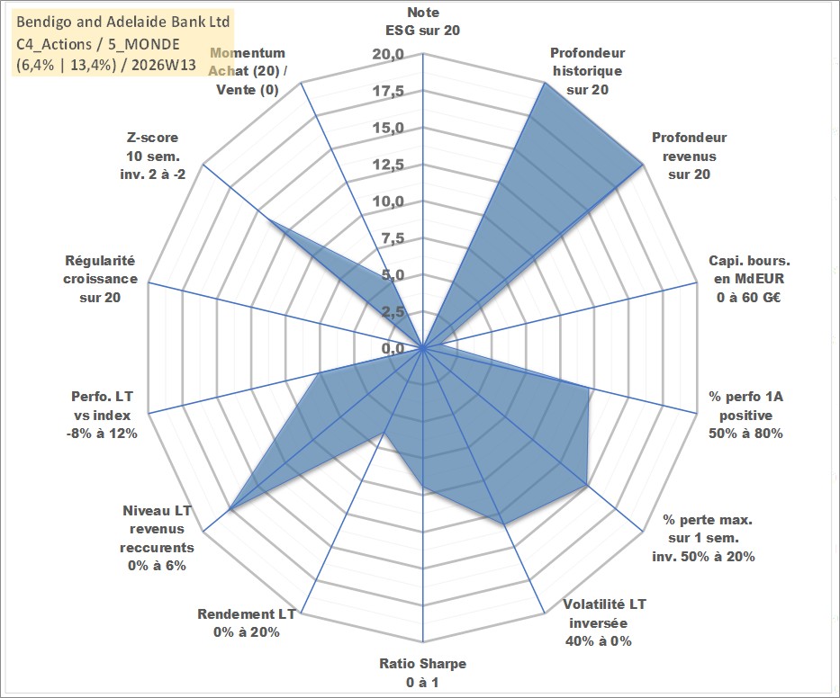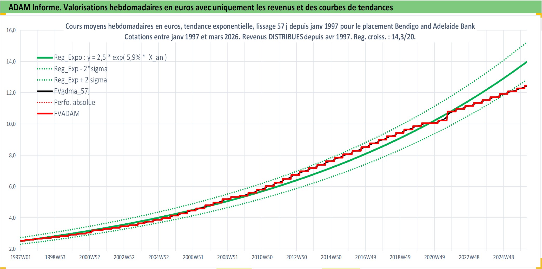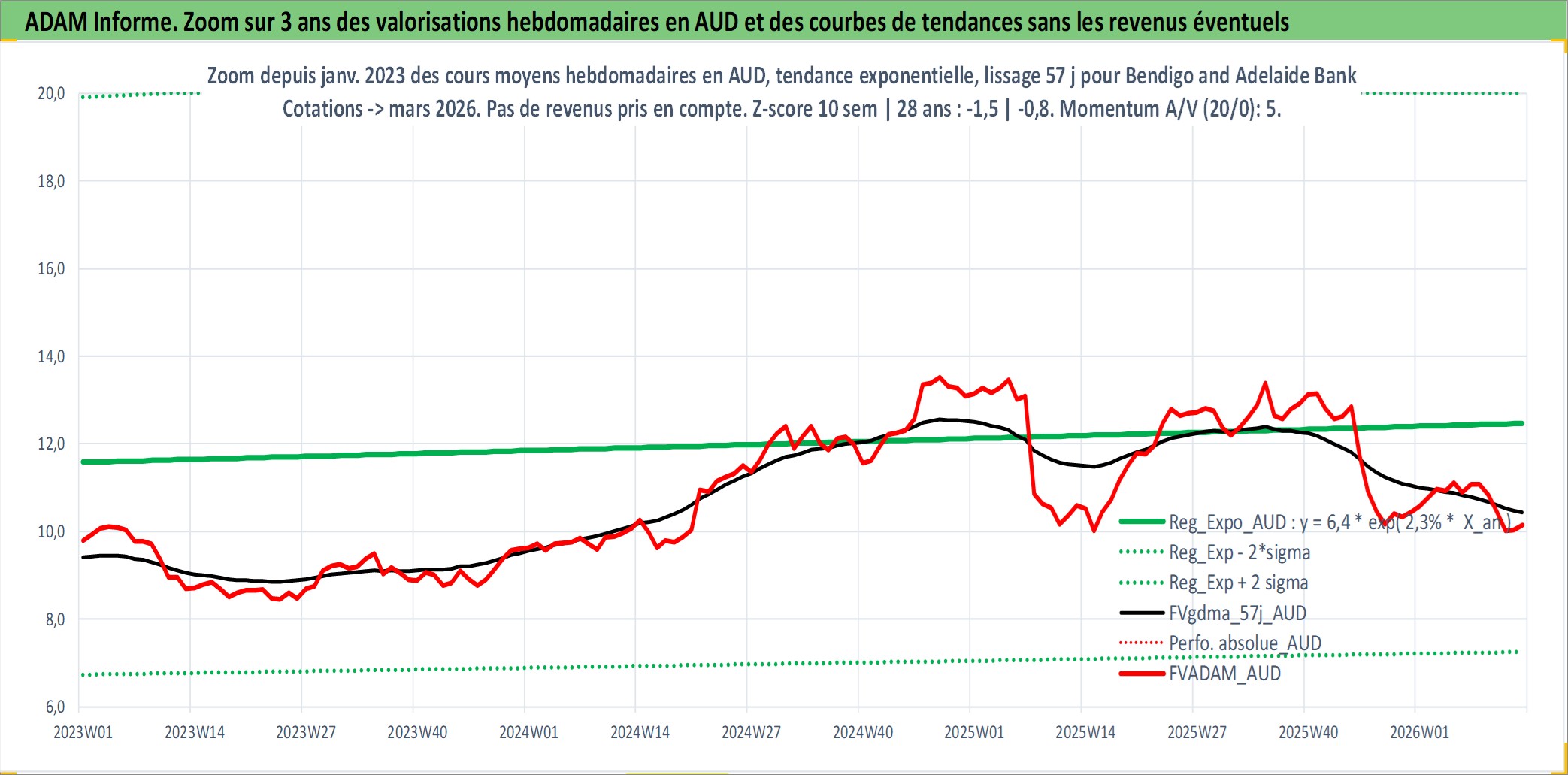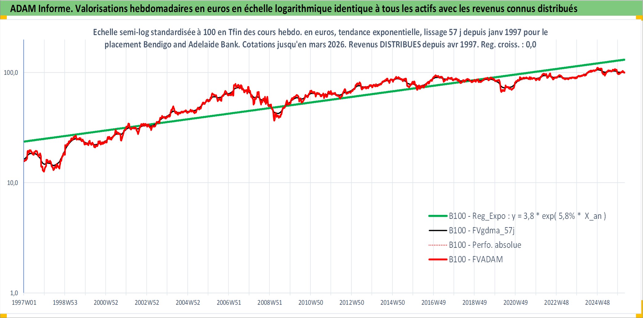 Site dédié aux investisseursPage dédiée sur site financeAnalyse des valorisations hebdomadaires de l'action Bendigo and Adelaide Bank Ltd. Cet actif est cote en AUD. Les valorisations sont en contrevaleur EURO et couvrent les semaines 1997W01 a 2026W13. Les revenus de cet actif financier sont pris en compte depuis la semaine 1997W15. La note ESG de cet actif n'est pas connue.